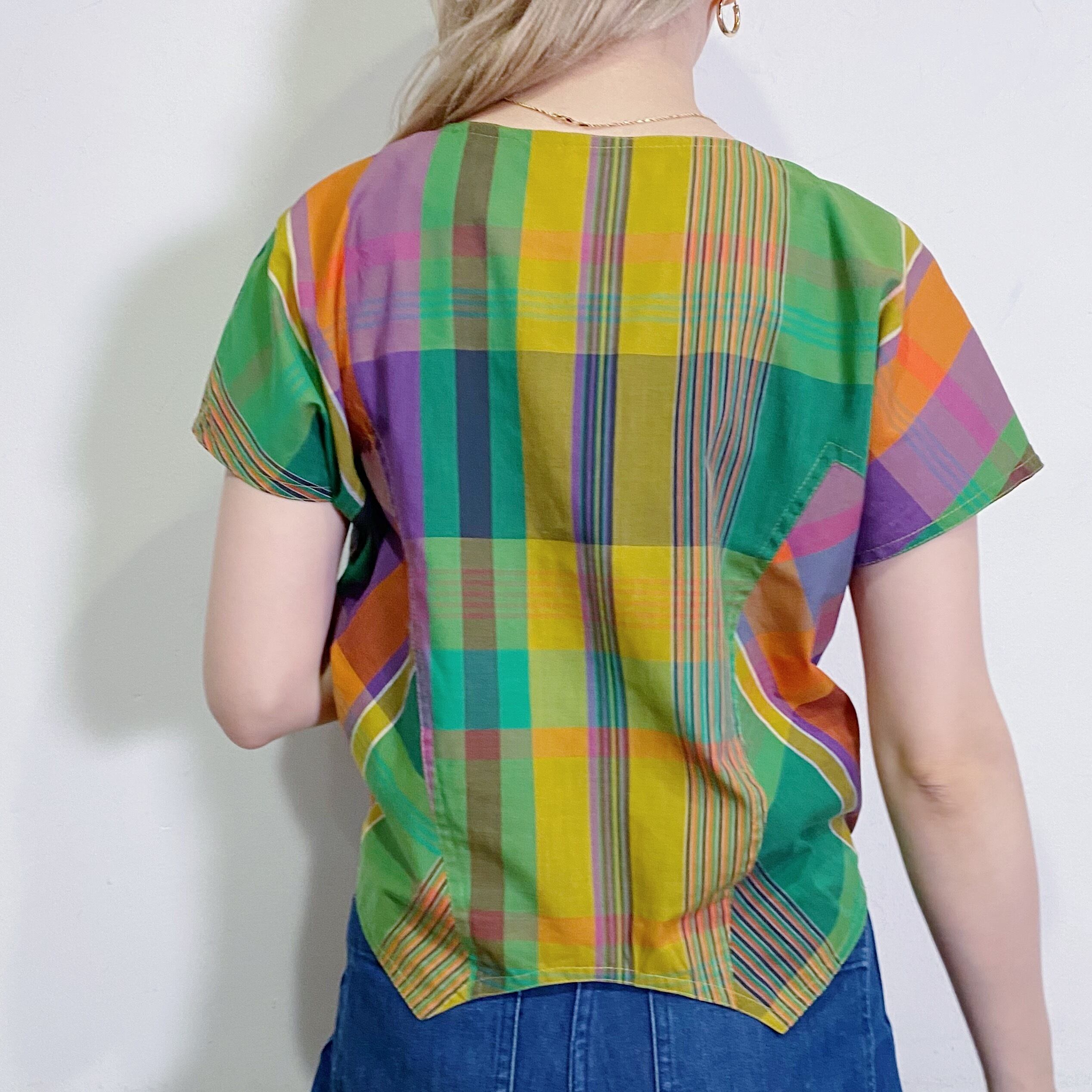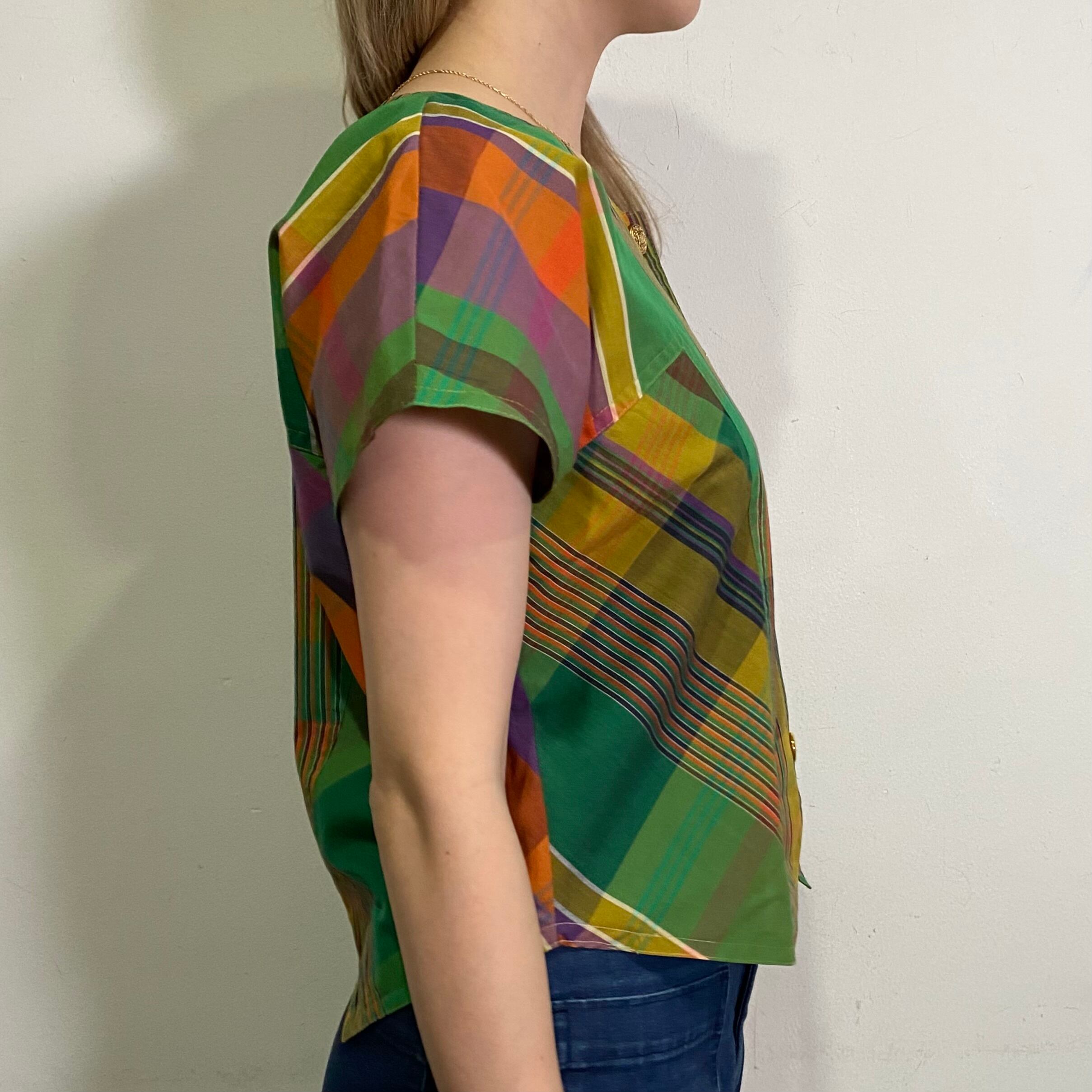 緑とオレンジのの色合いが可愛い、80年代くらいの半袖ブラウスです。