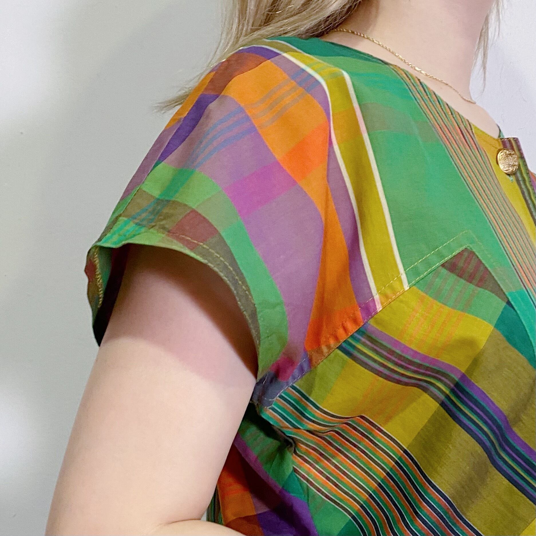 ぱっきりとした色合いのチェックにユニークな裁断のデザインが可愛い。
