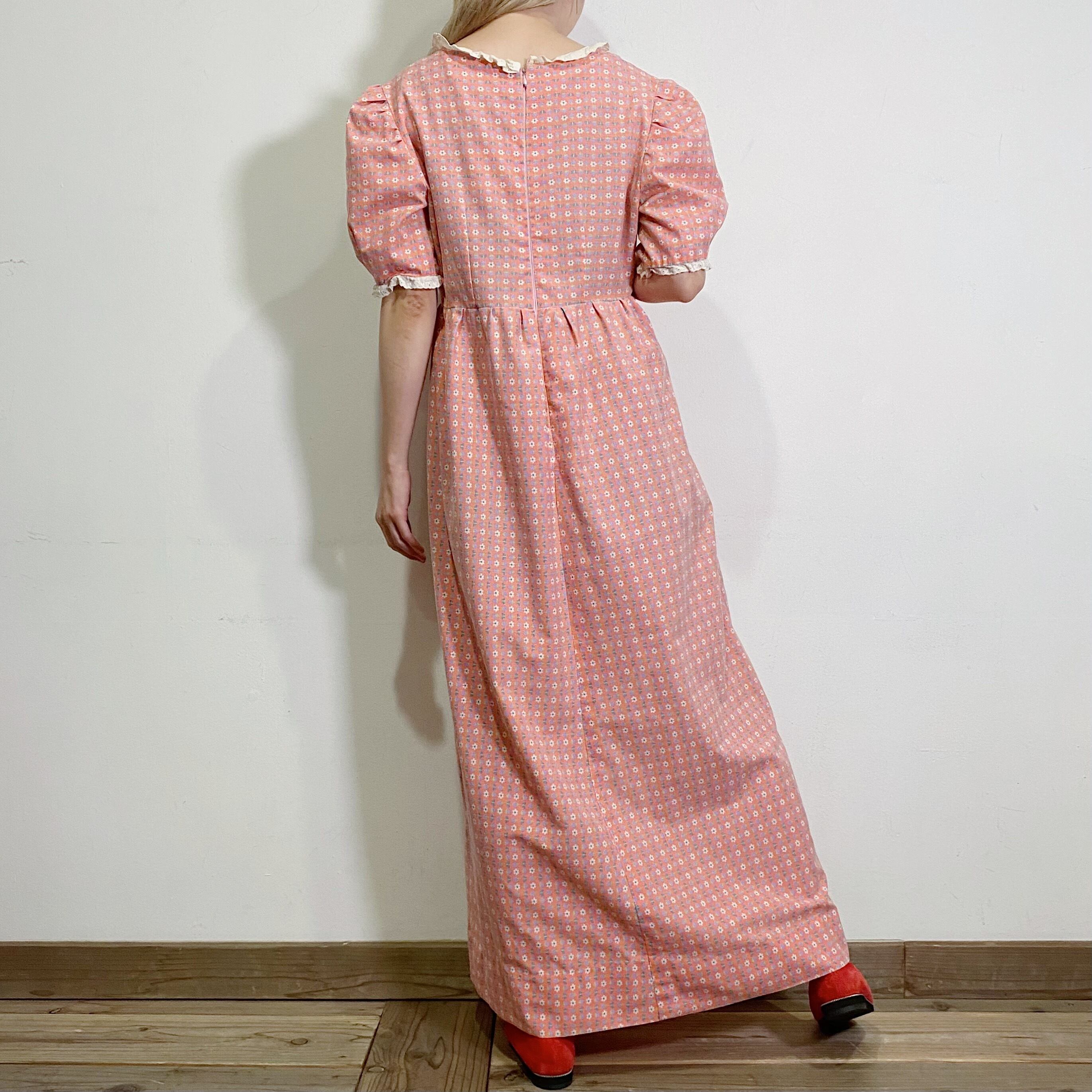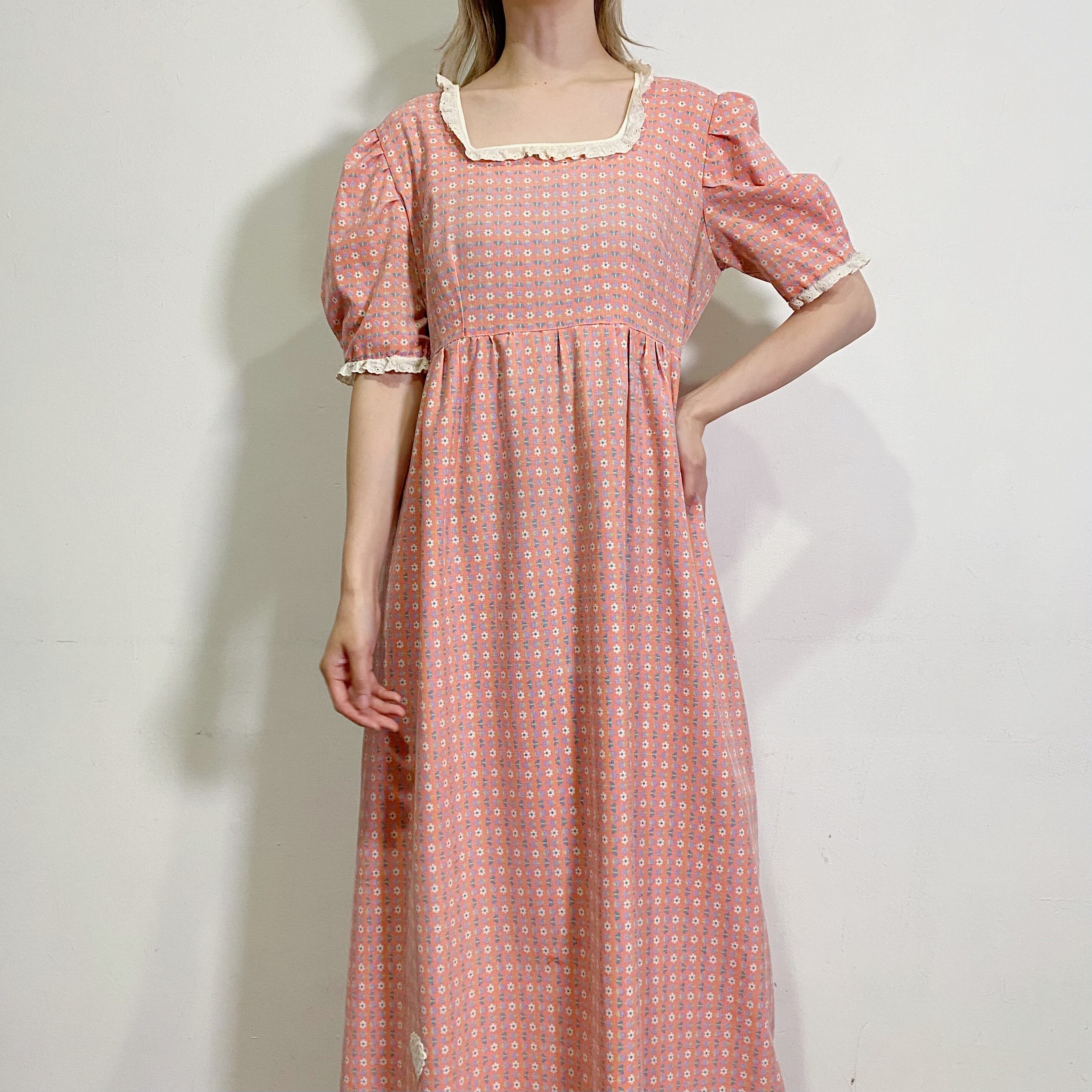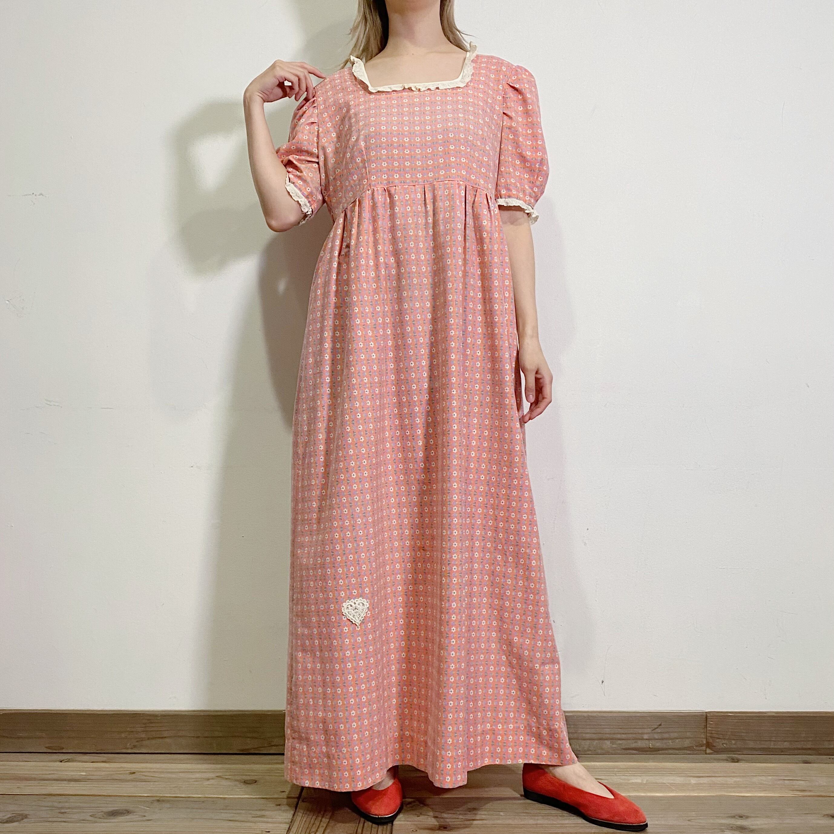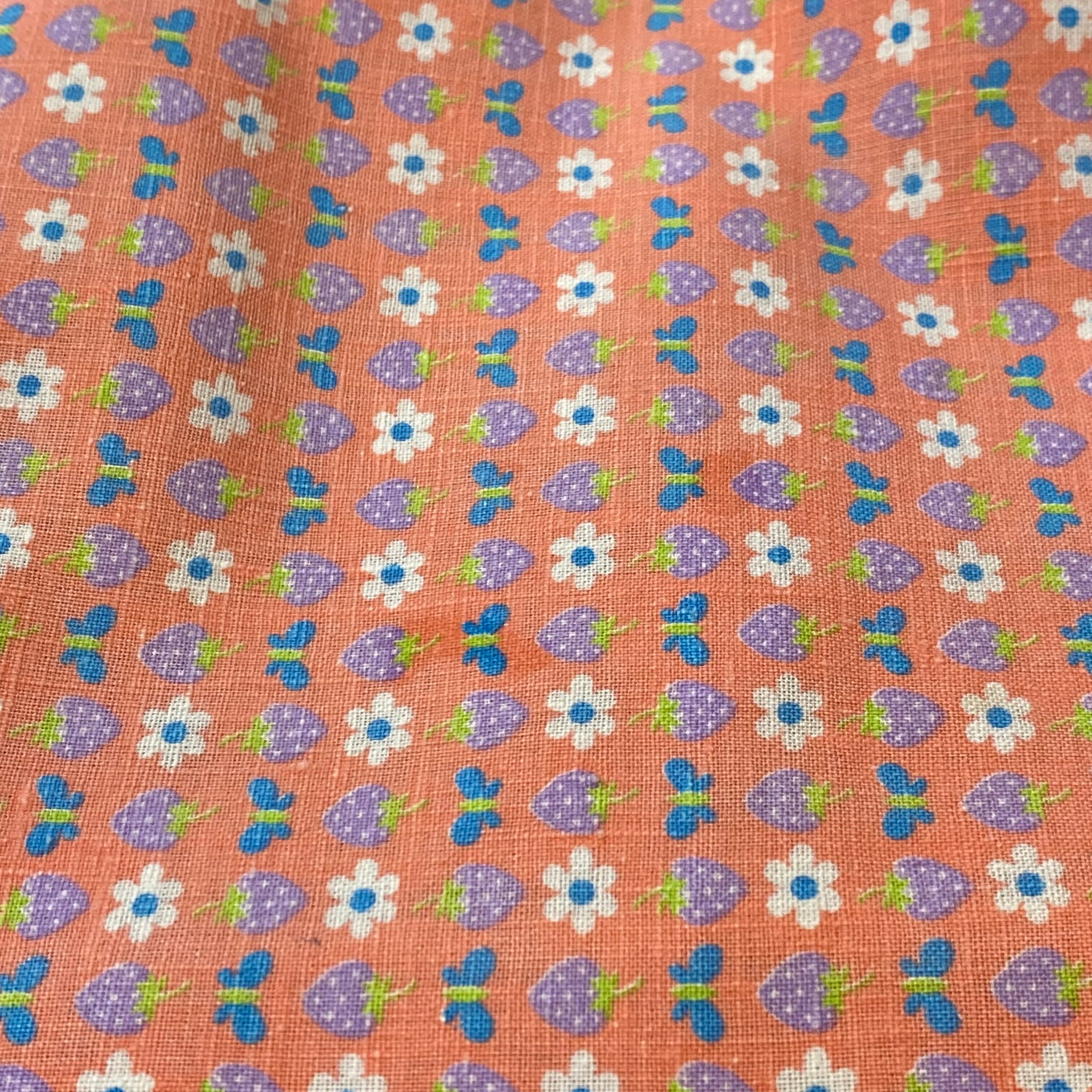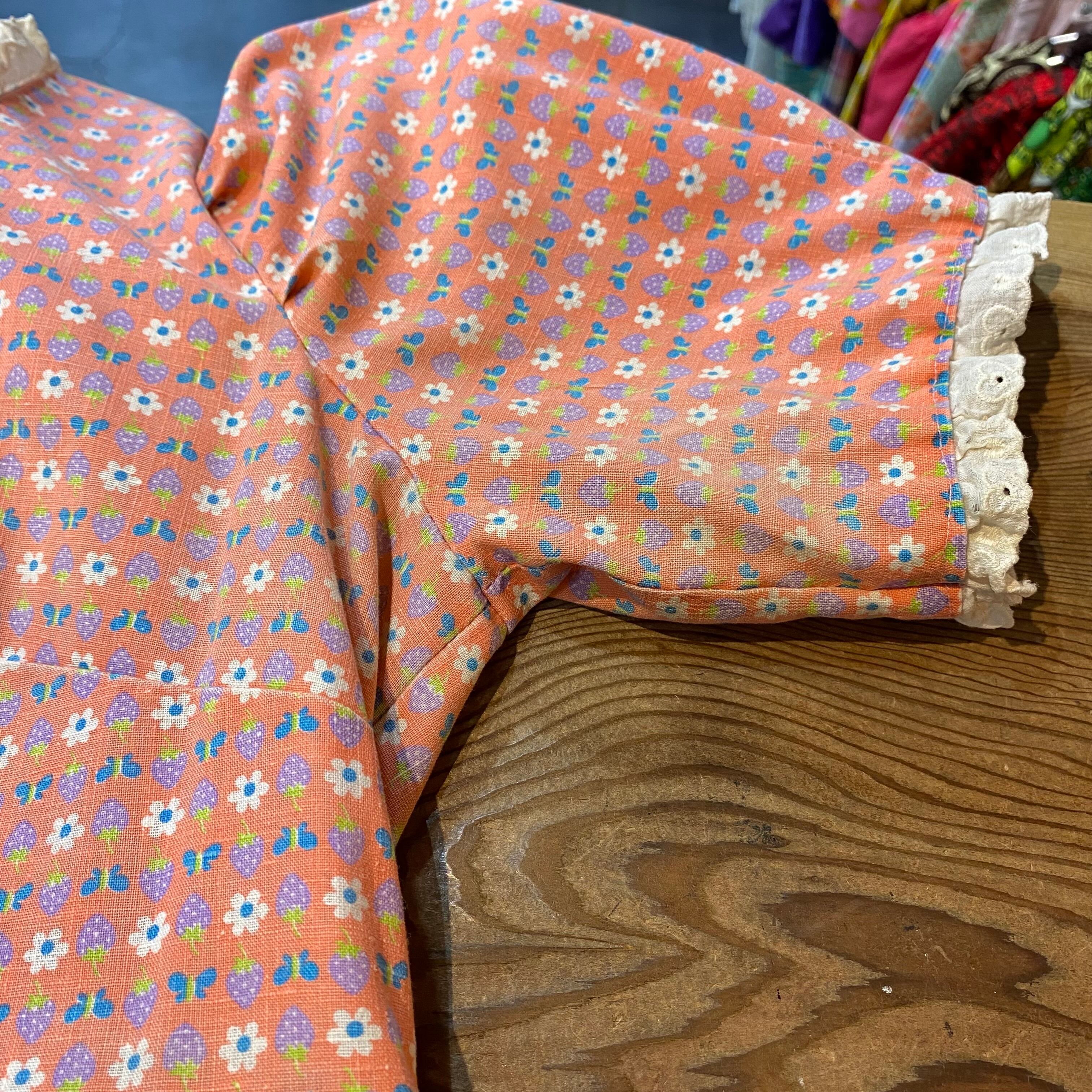 ピンクベースに蝶々とイチゴ、お花の柄がとっておきに可愛い、70年代のワンピースです。