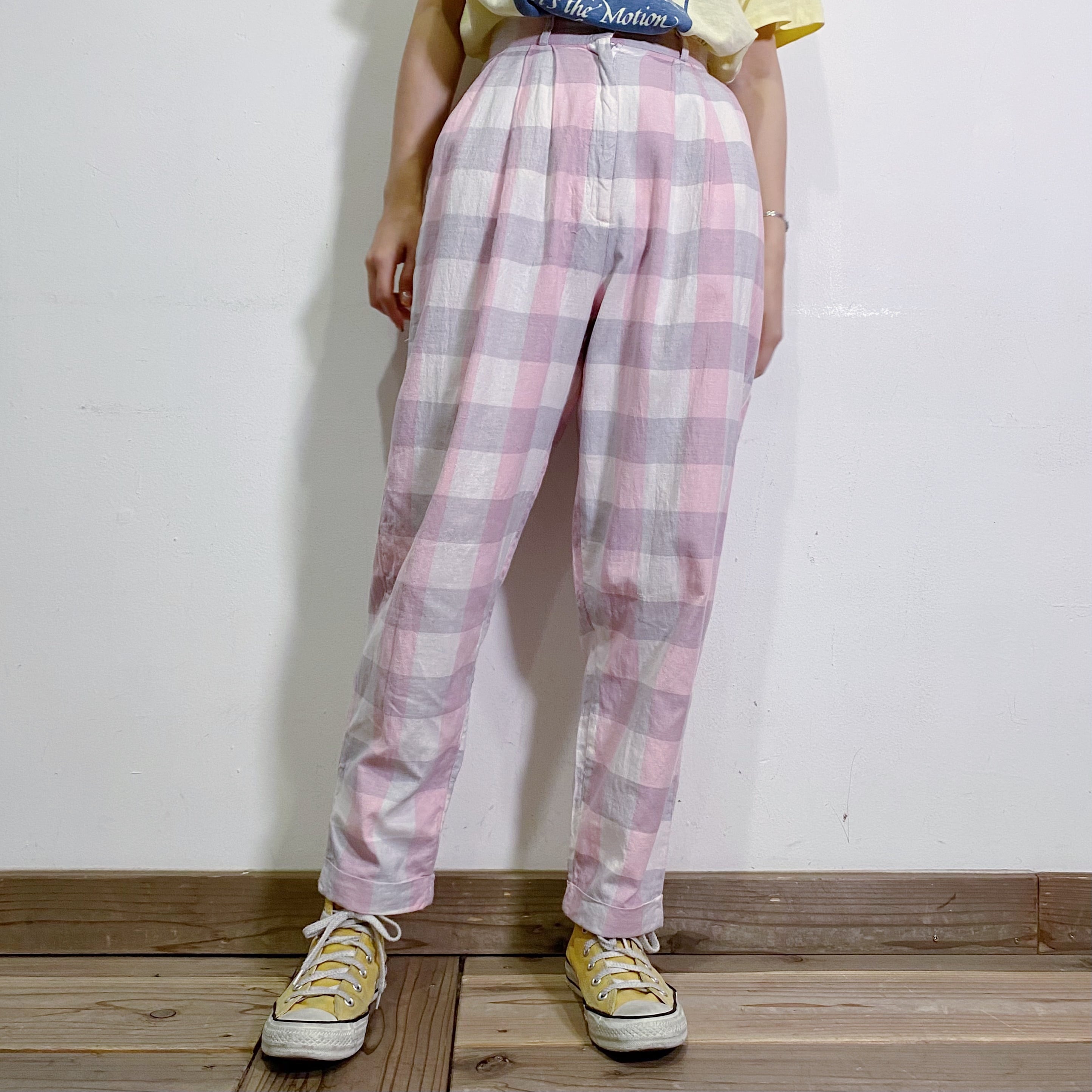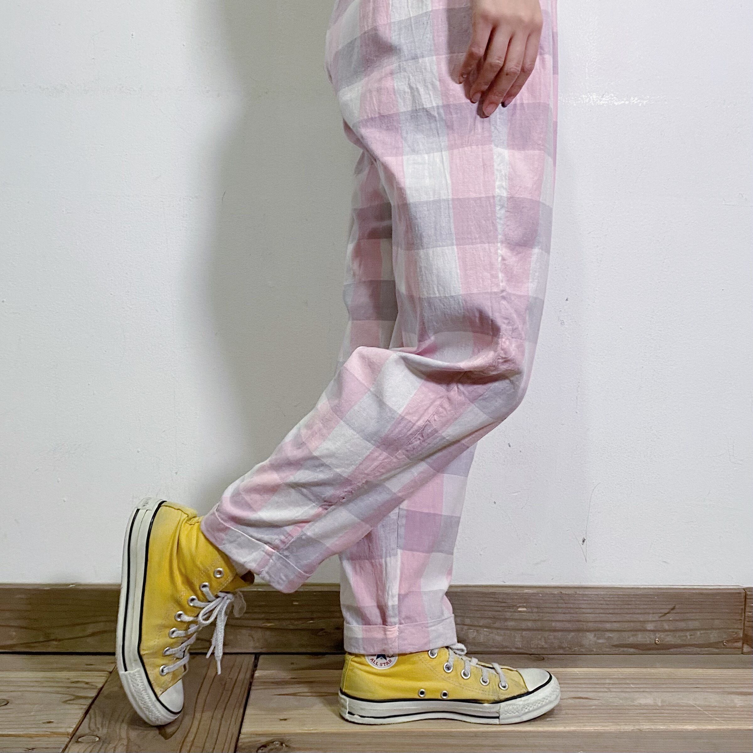 ピンクにグレーの色合いが可愛い、大きなチェックのコットンパンツです。
