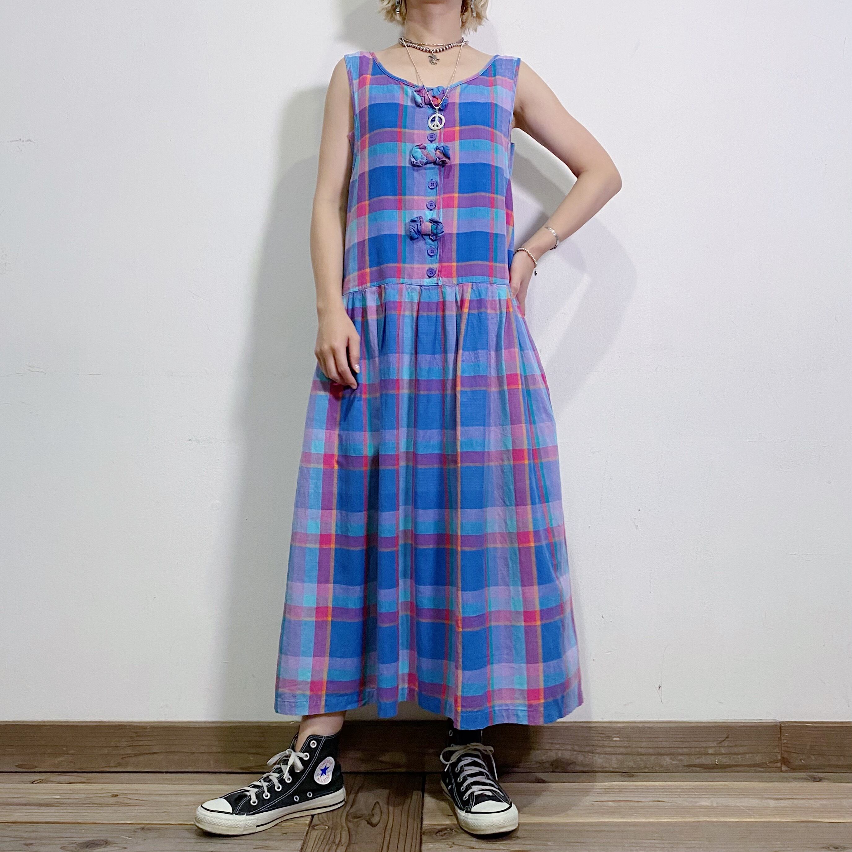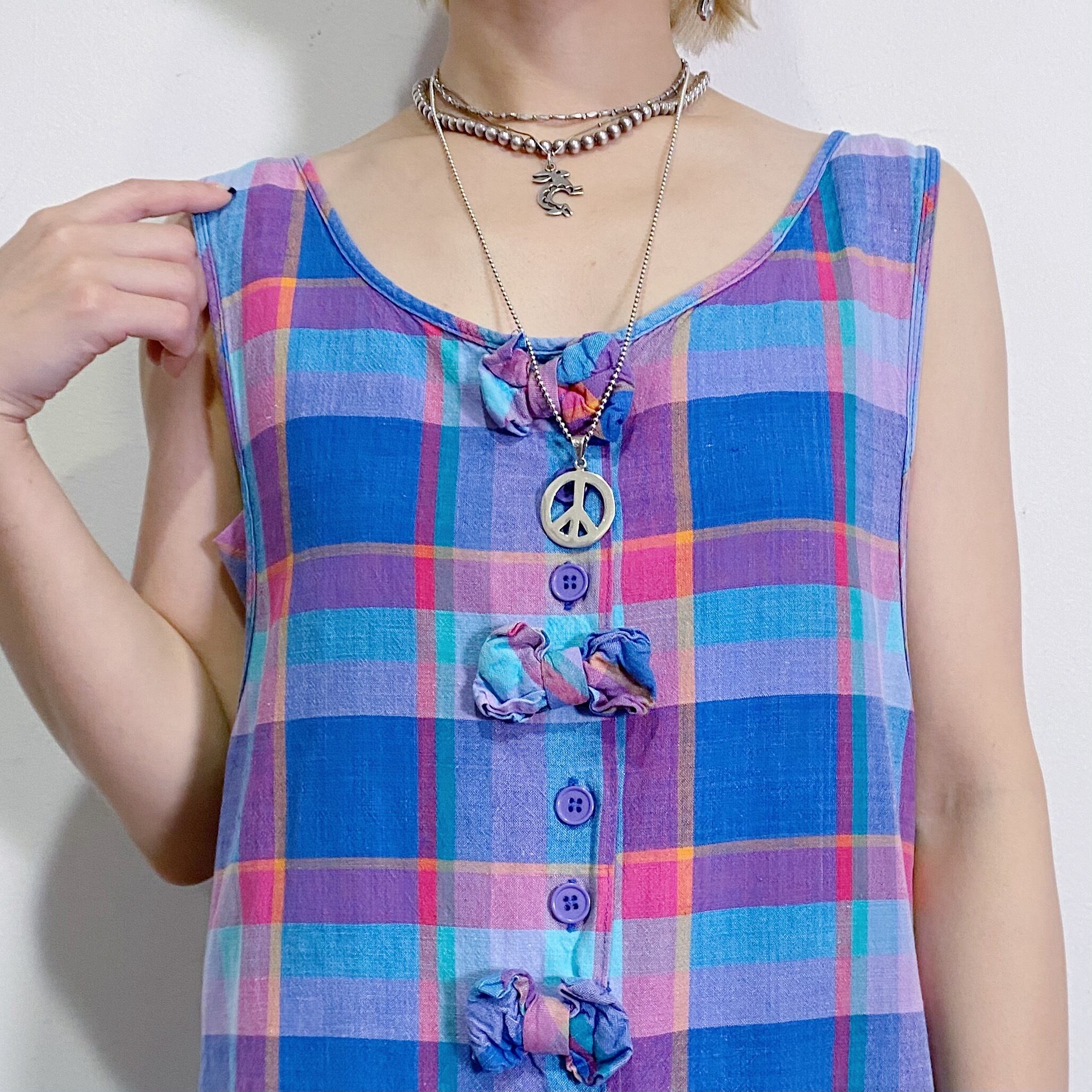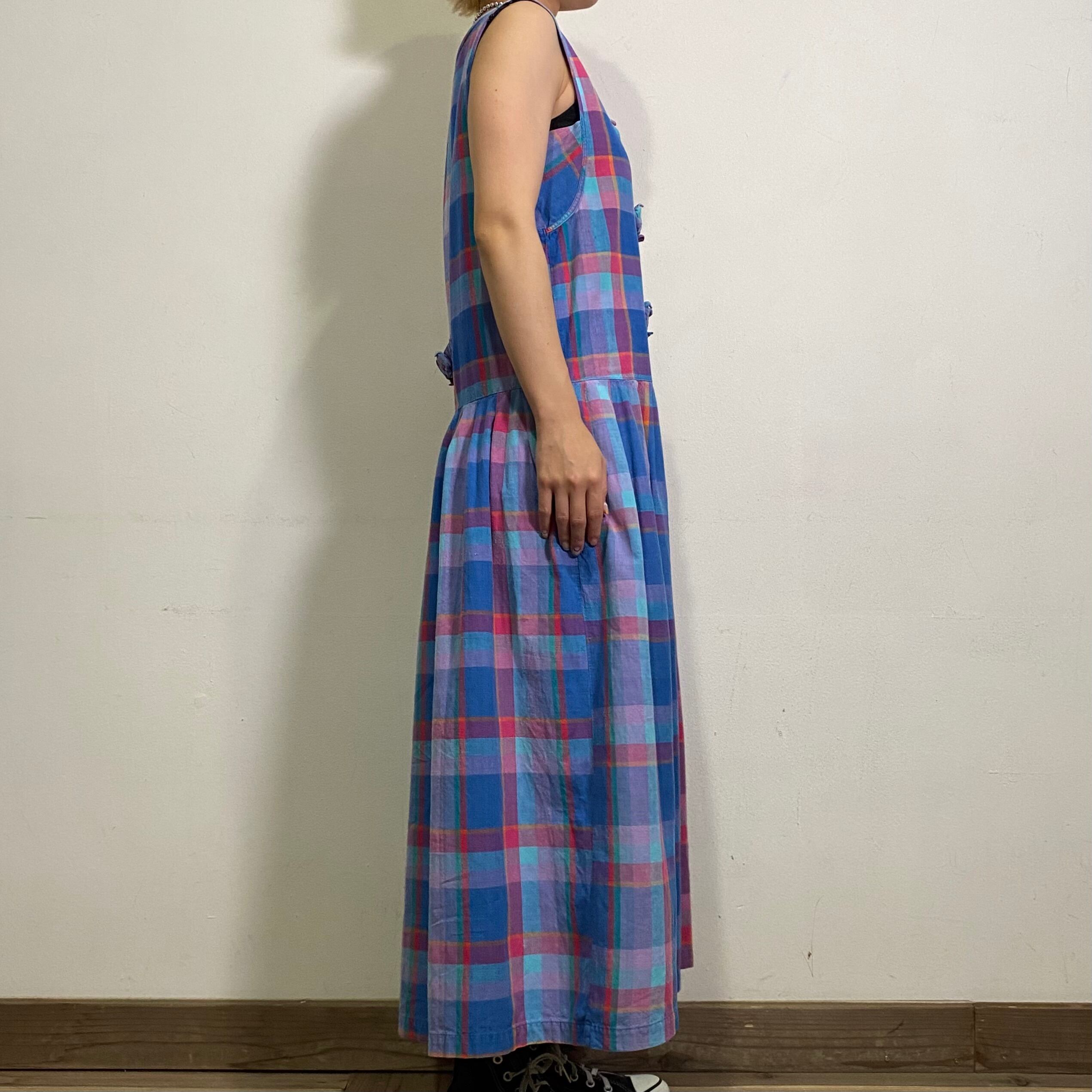 リボンがぽんぽん、と並んだデザインでとっても可愛い、チェックのジャンパーワンピースです。