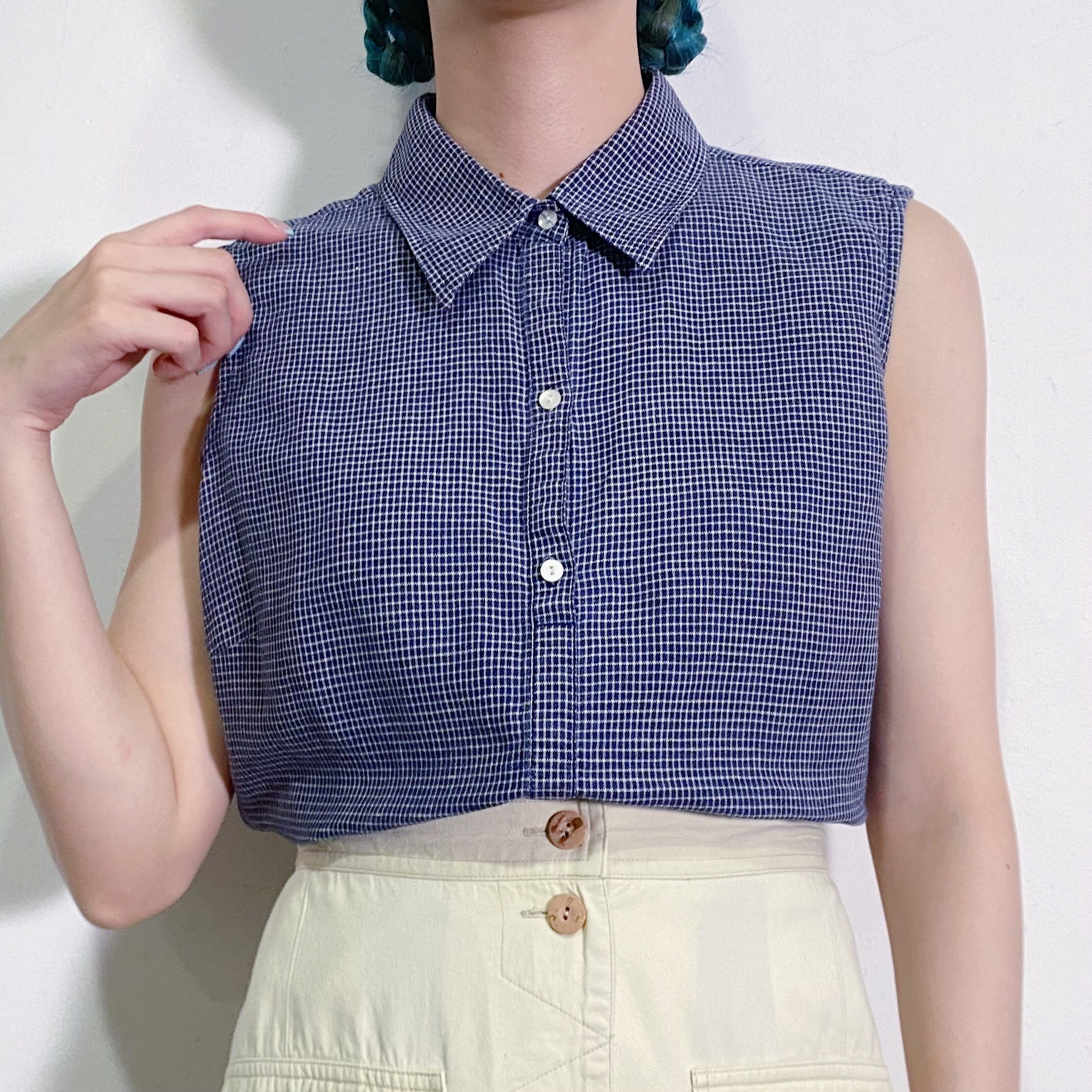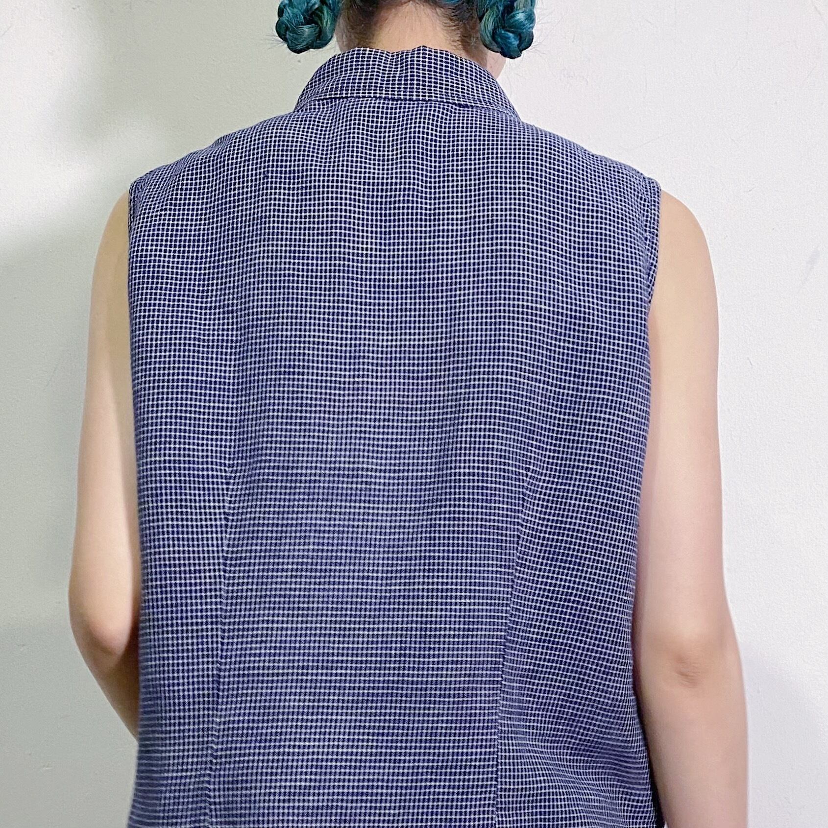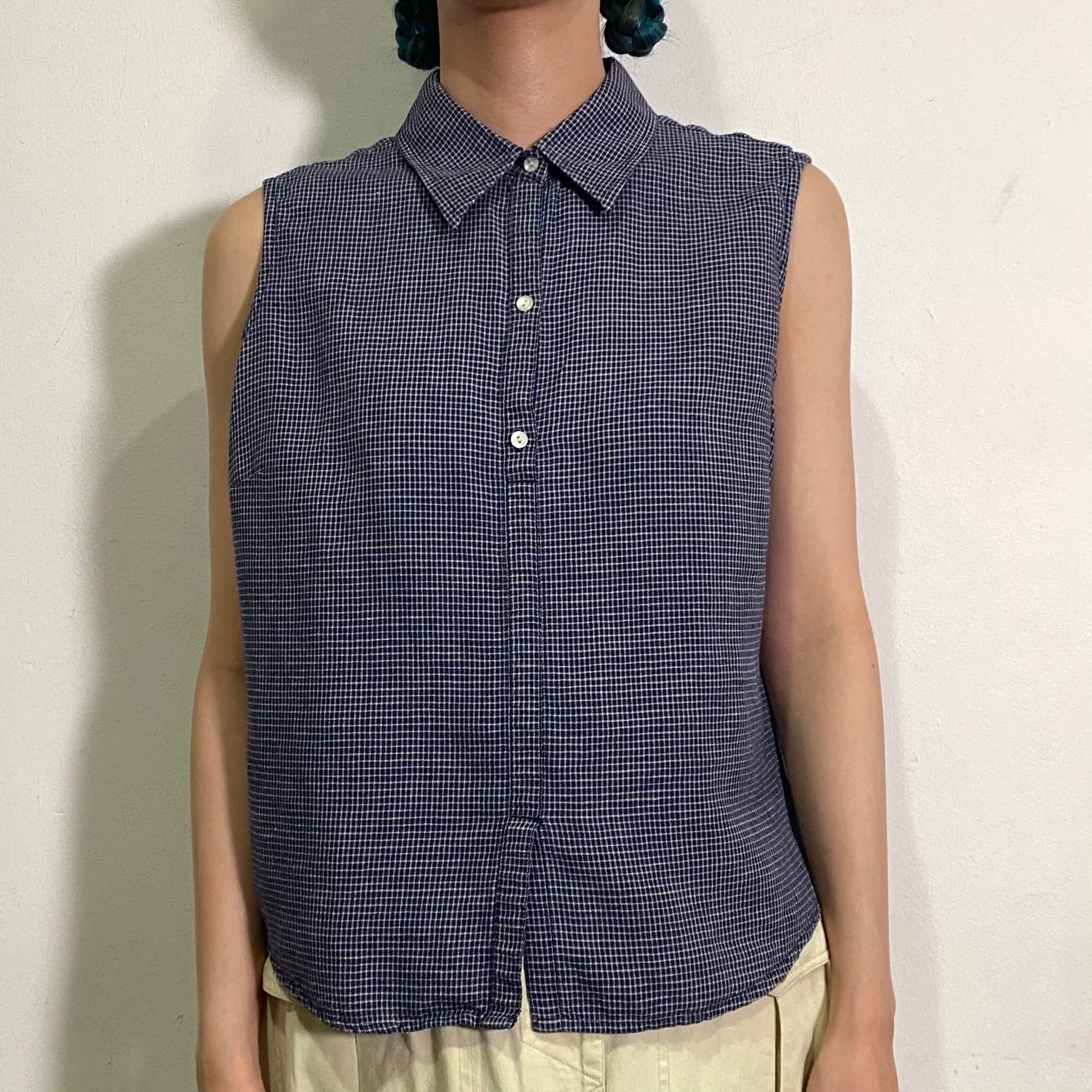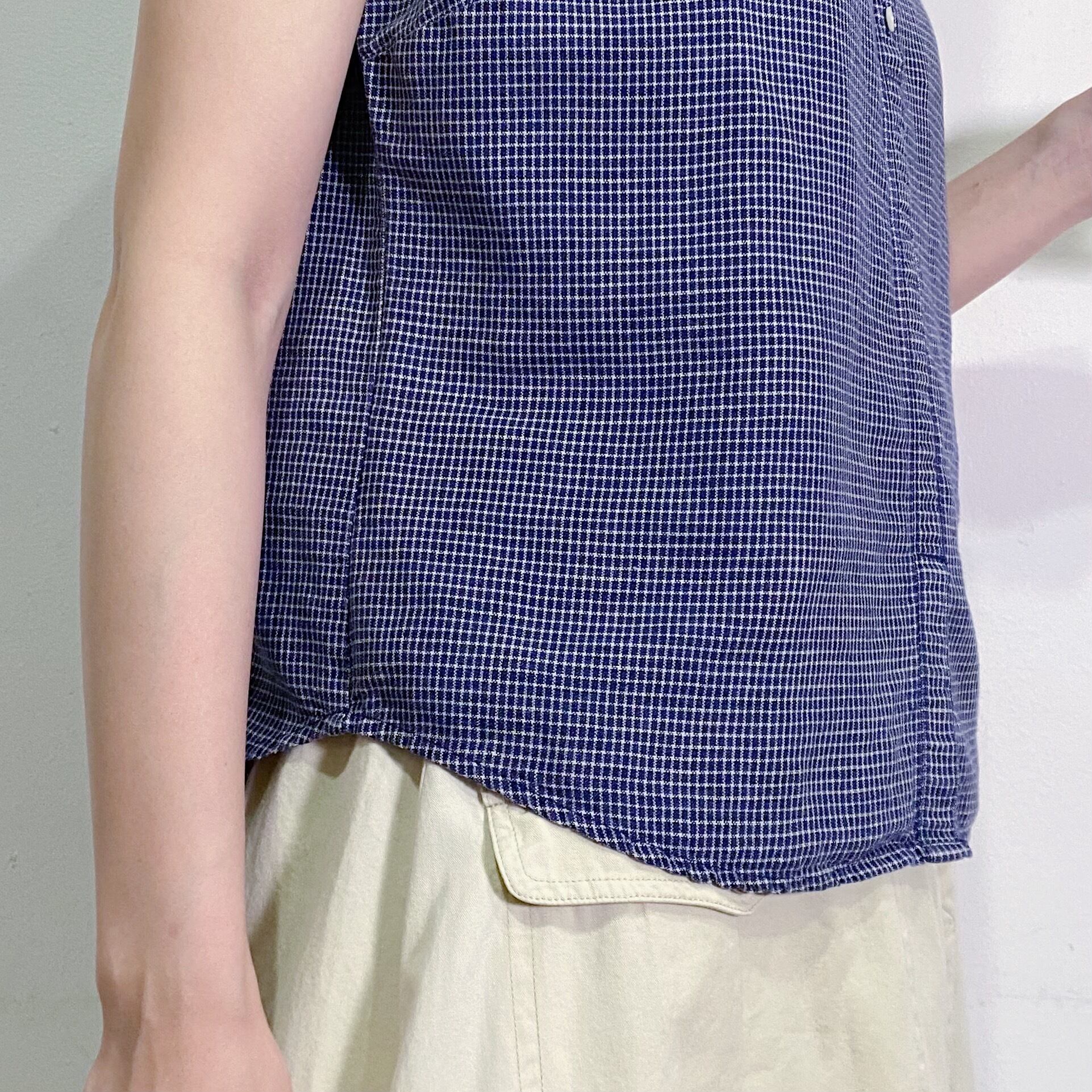 ネイビーベースの細やかなチェックが可愛い、エディーバウアーのノースリーブシャツです。