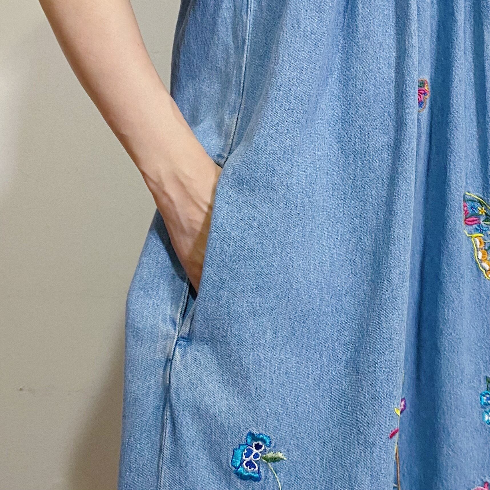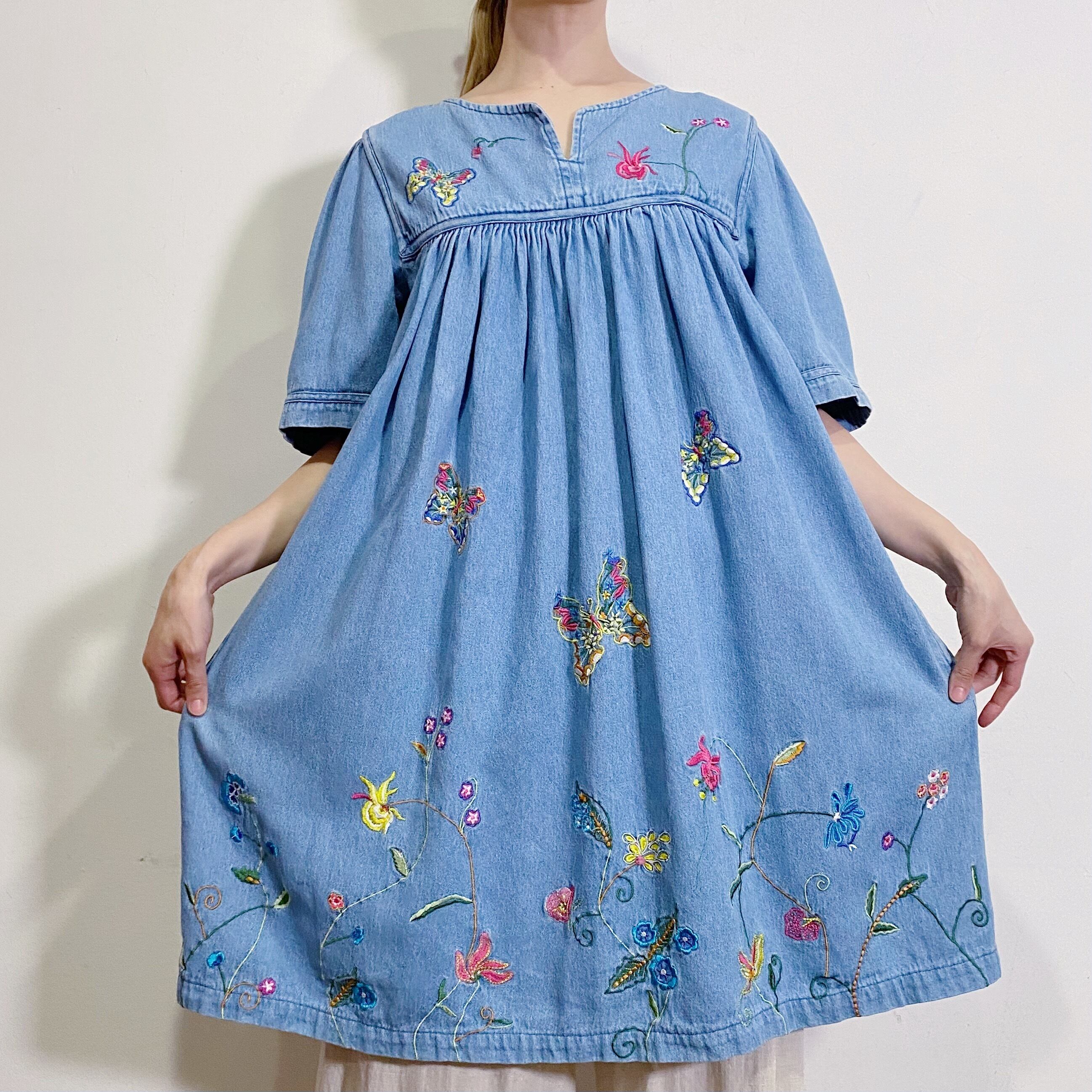 デニム地にカラフルなお花や蝶の刺繍が可愛い、ミニワンピースです。