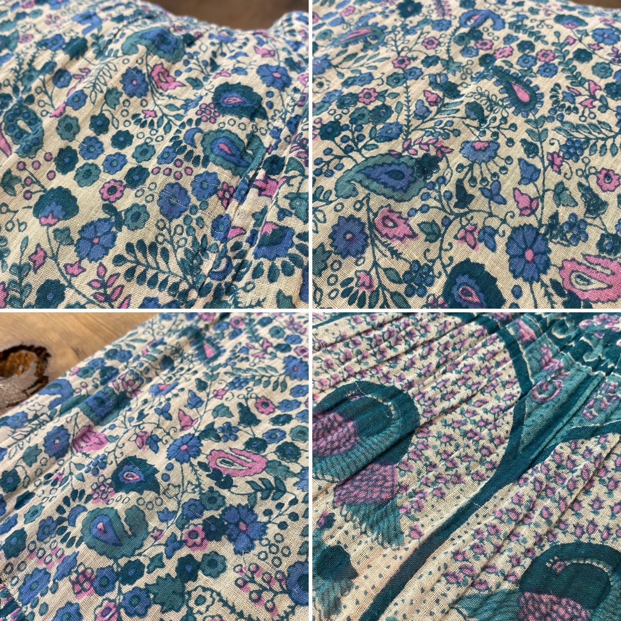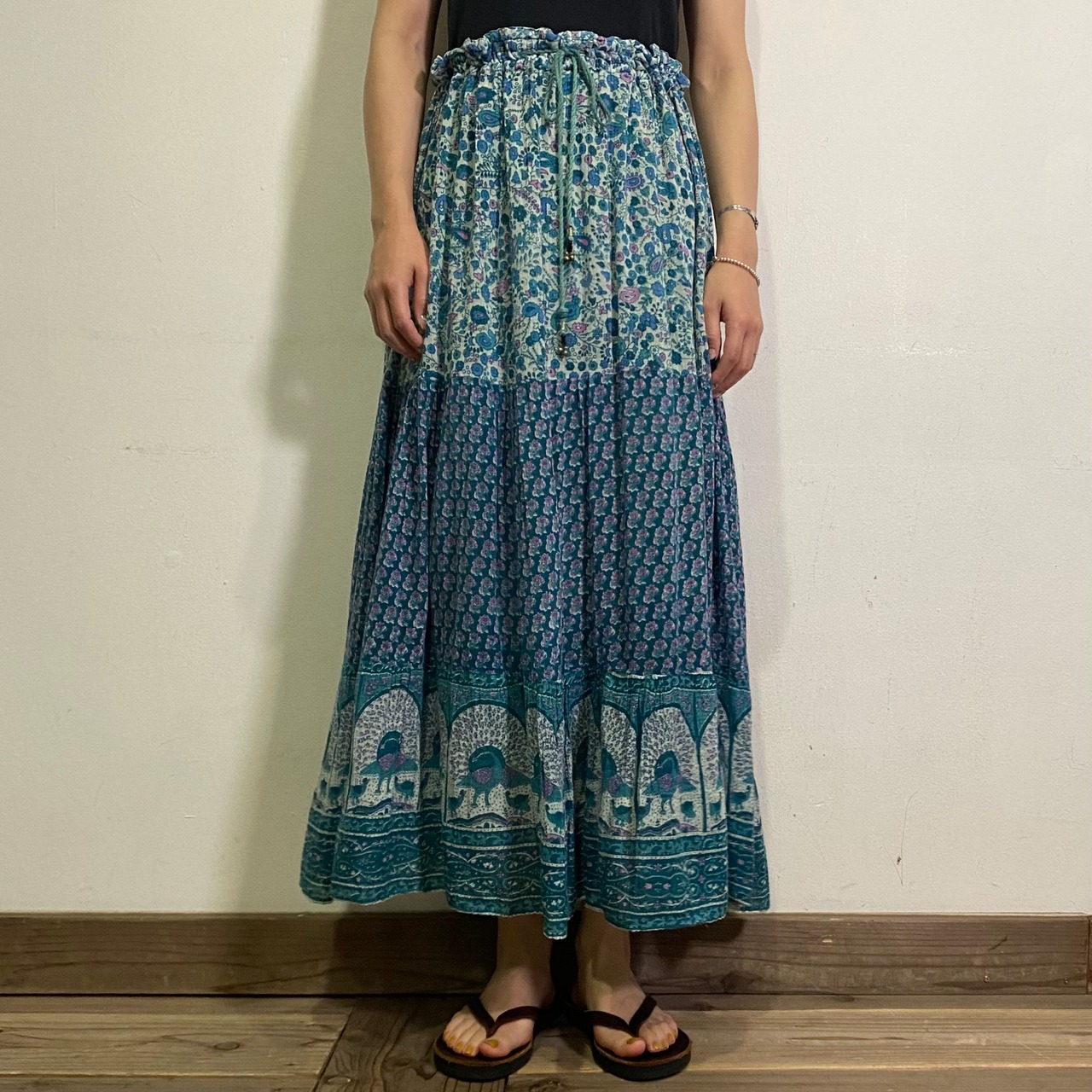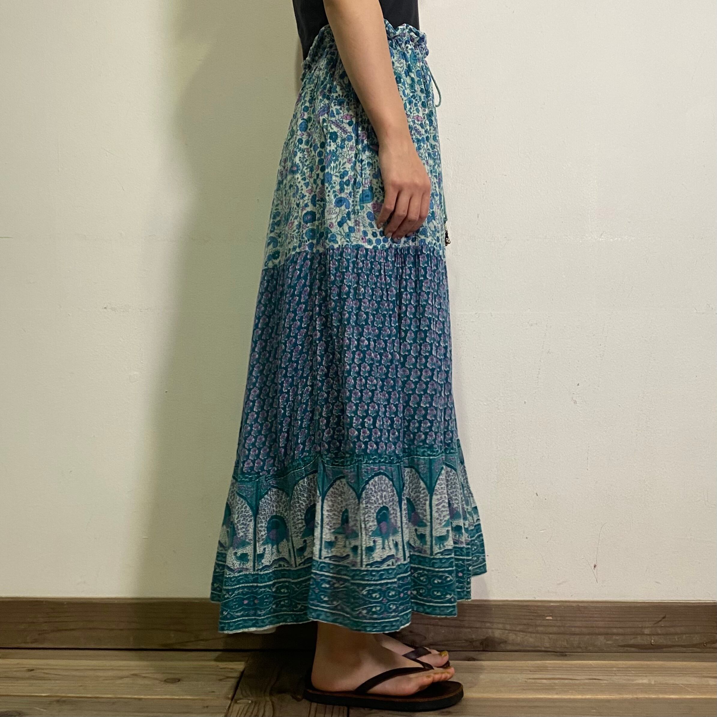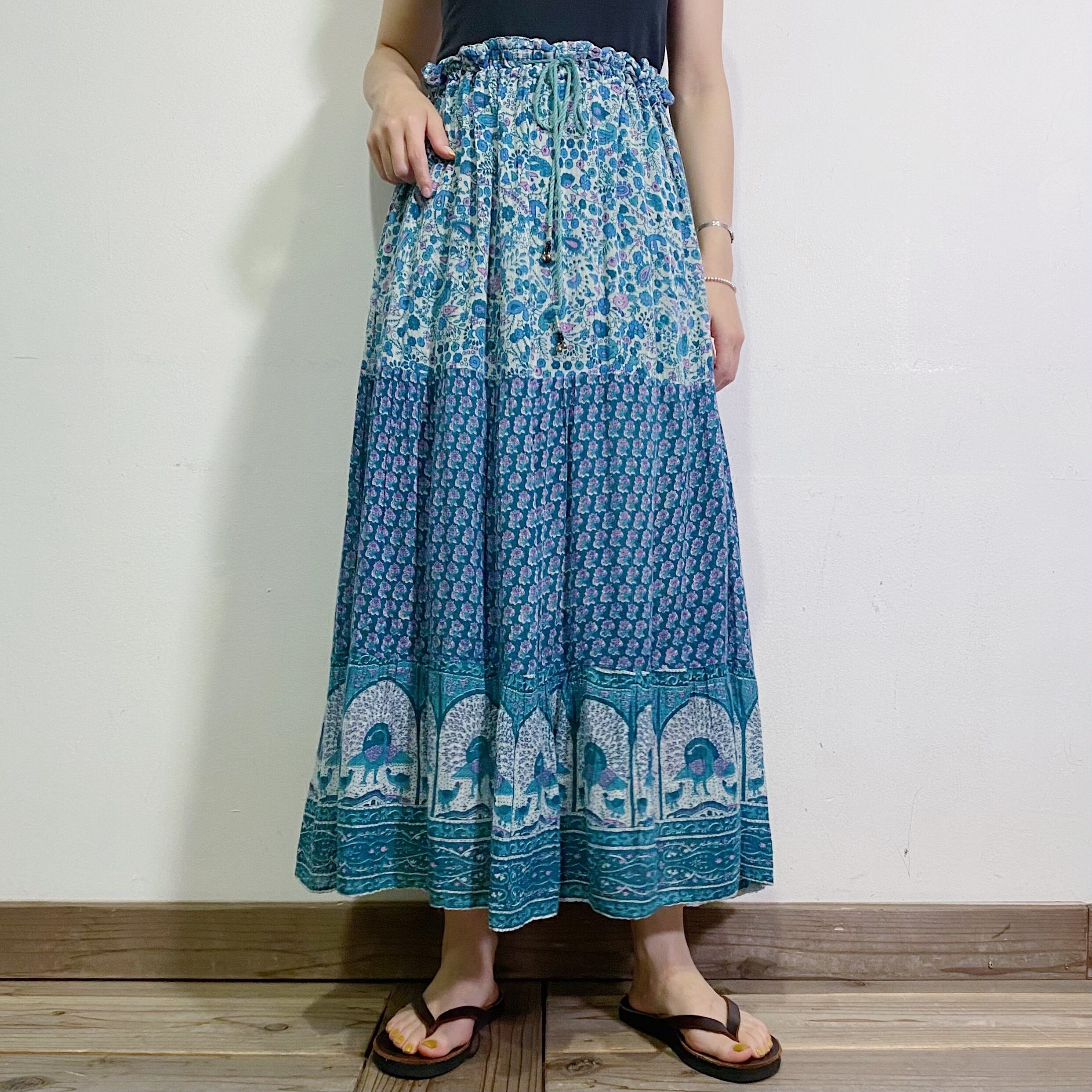 ブルーの色合いと裾のクジャクが可愛い、70年代のインド綿のスカートです。
