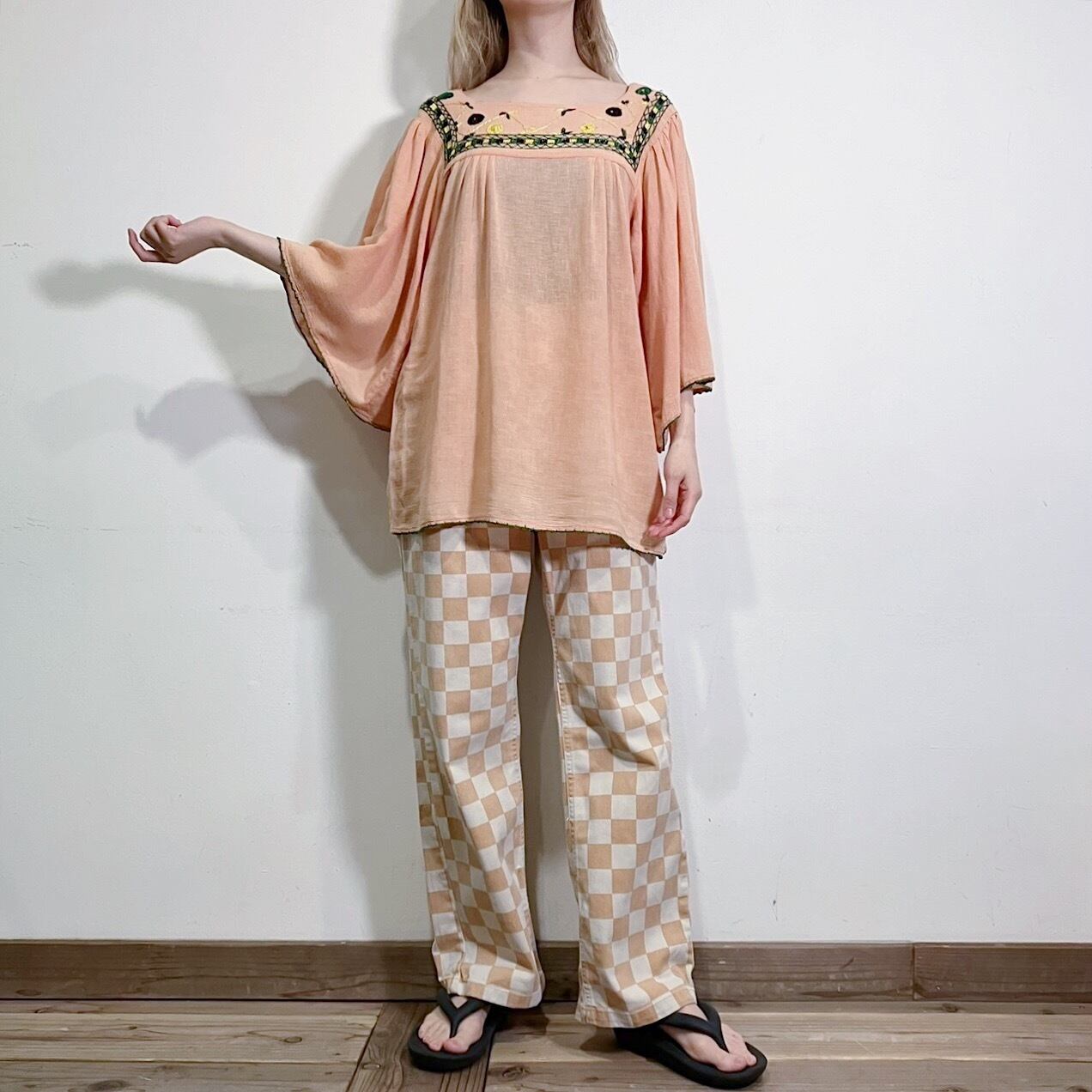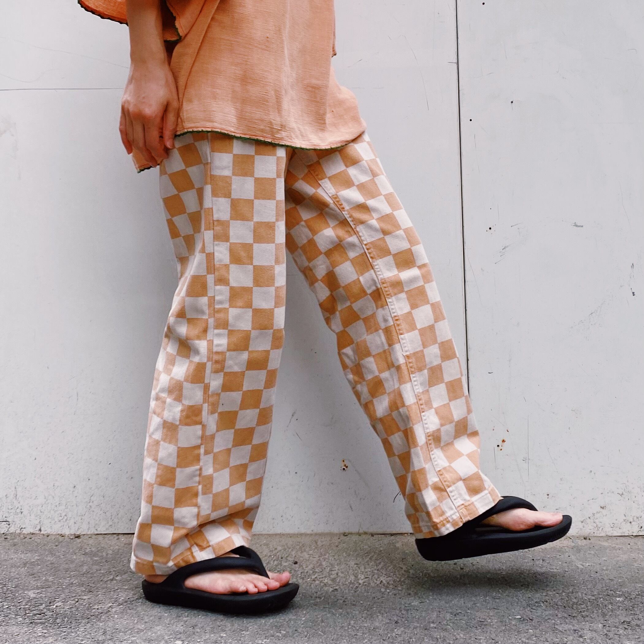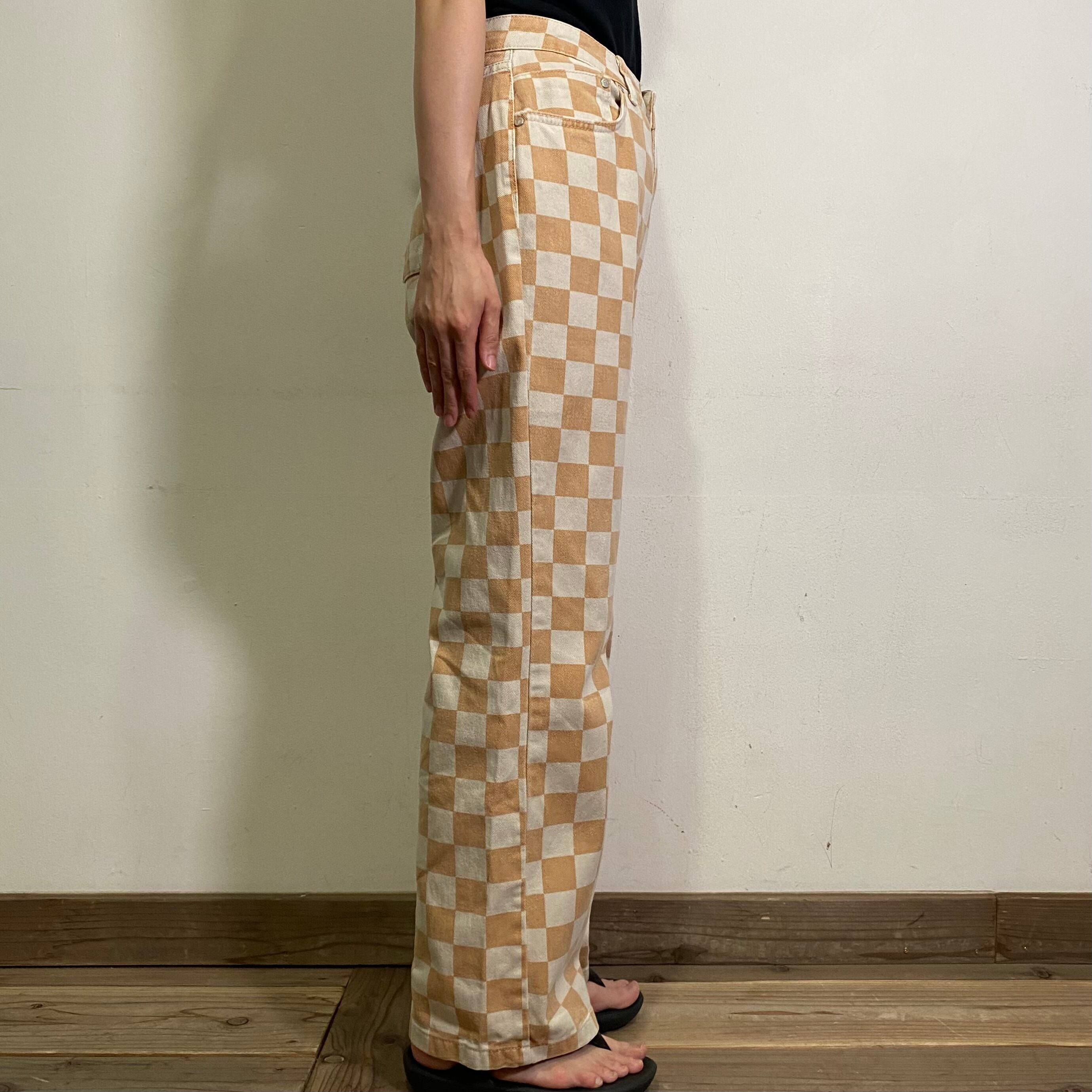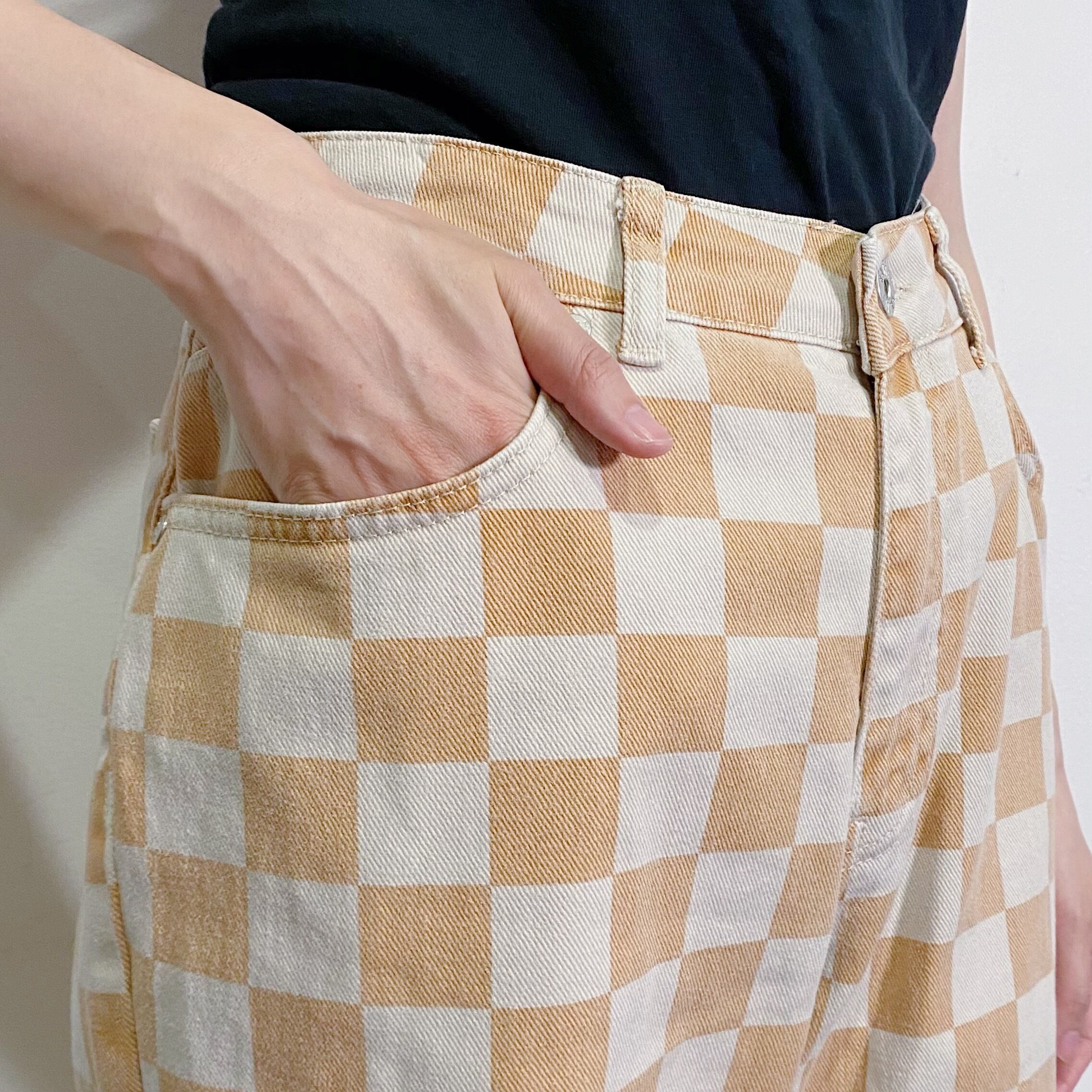 ベージュカラーのブロックチェックが可愛い、デニムパンツです。