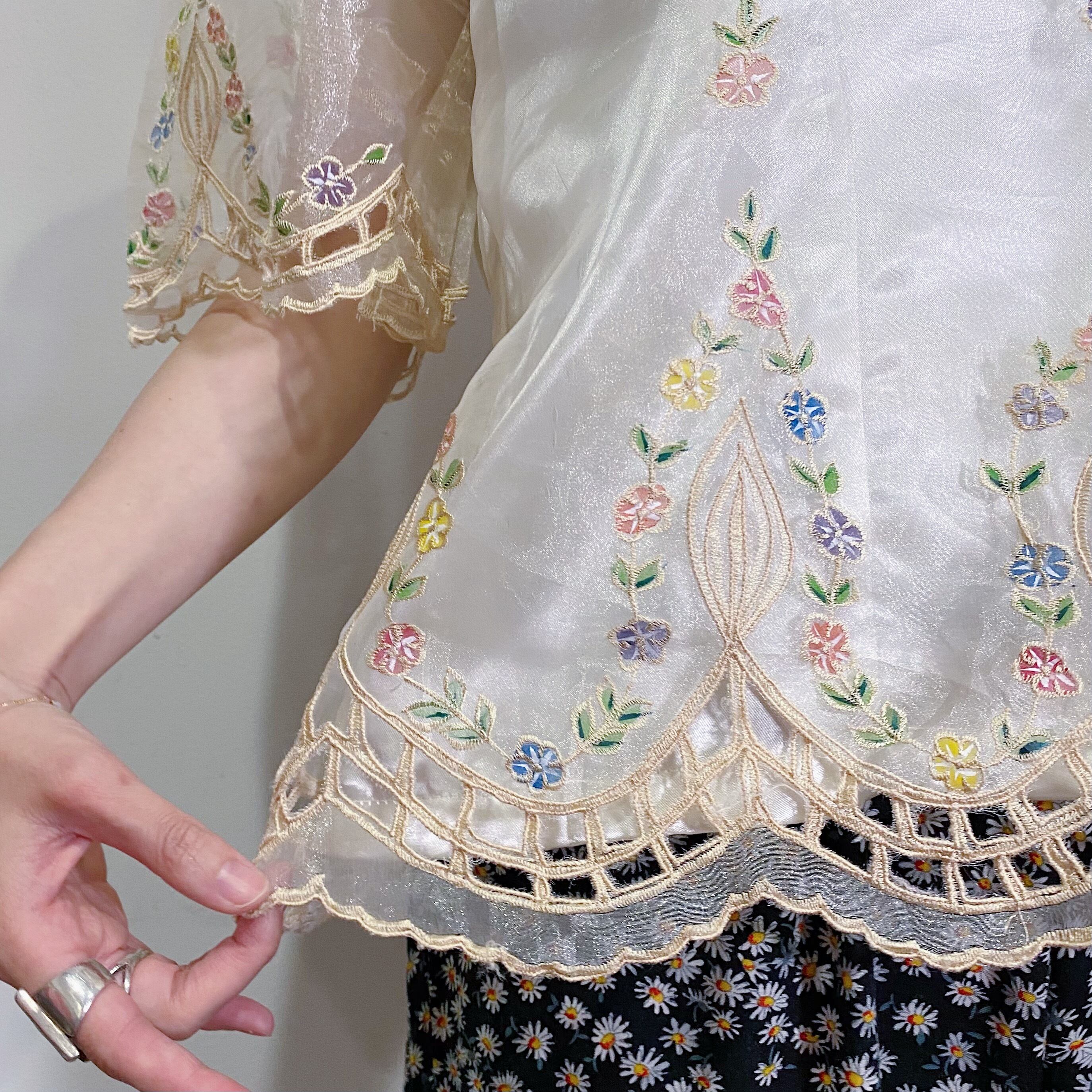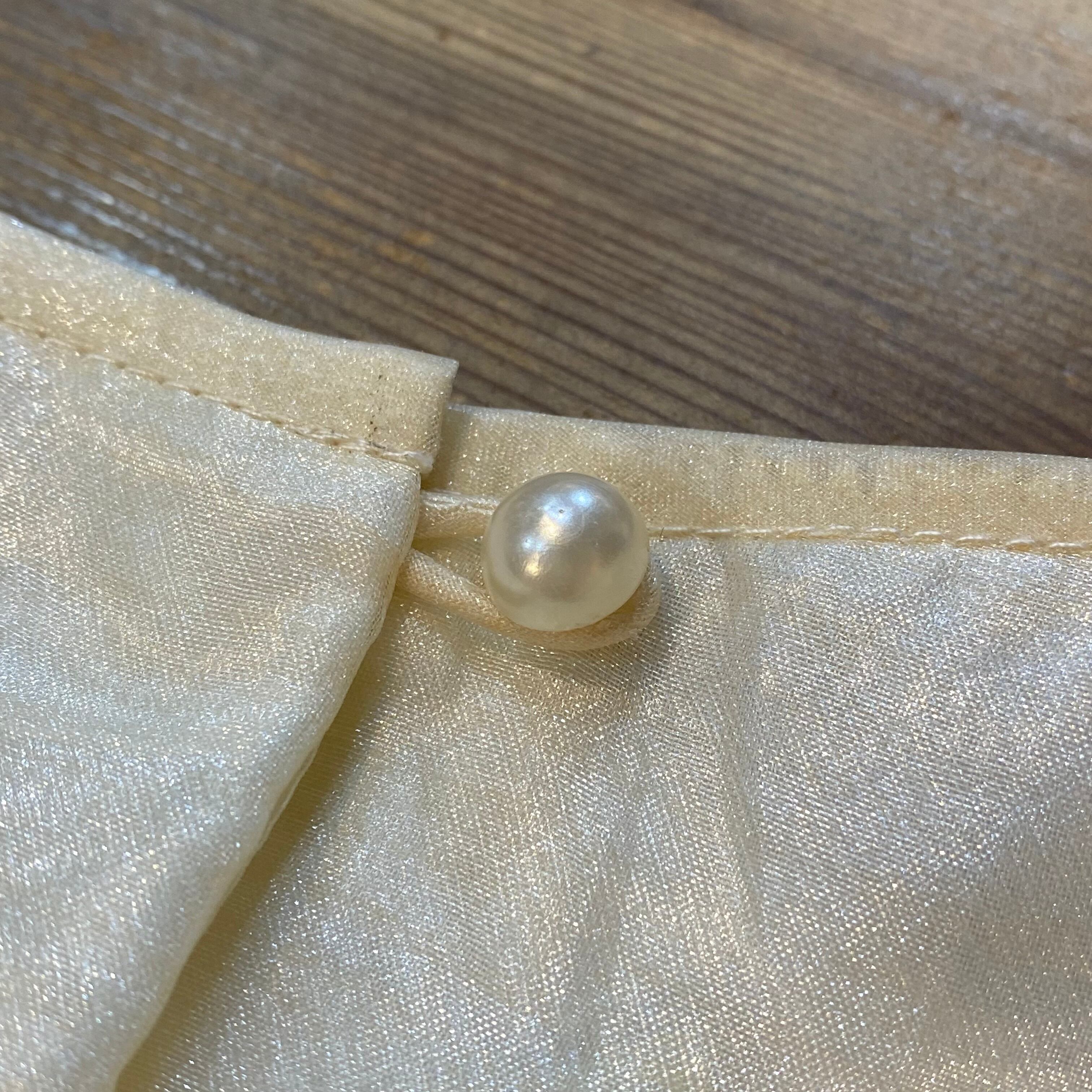 ぽわんとした透け感のある袖や、バックのパールボタンがとってもキュート。