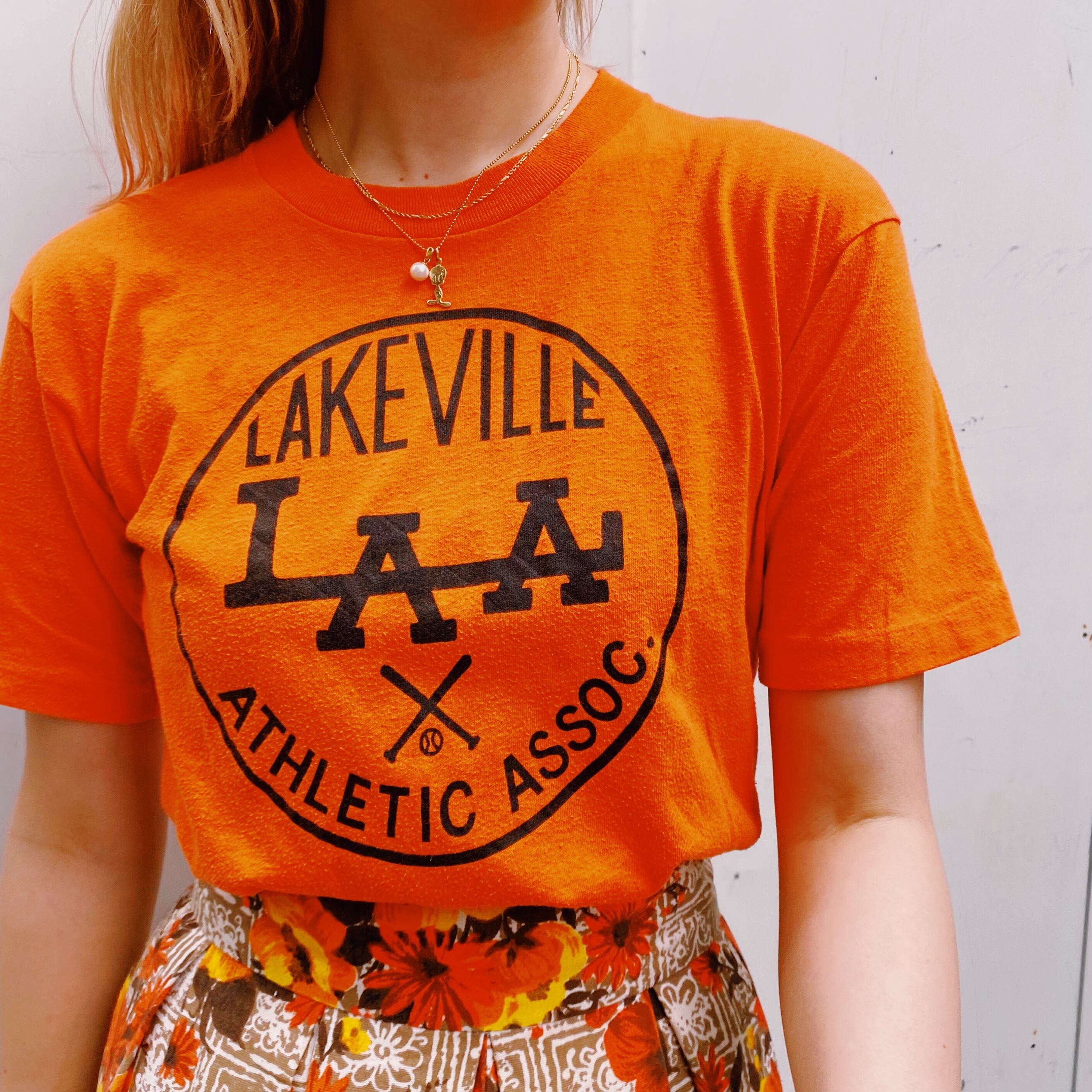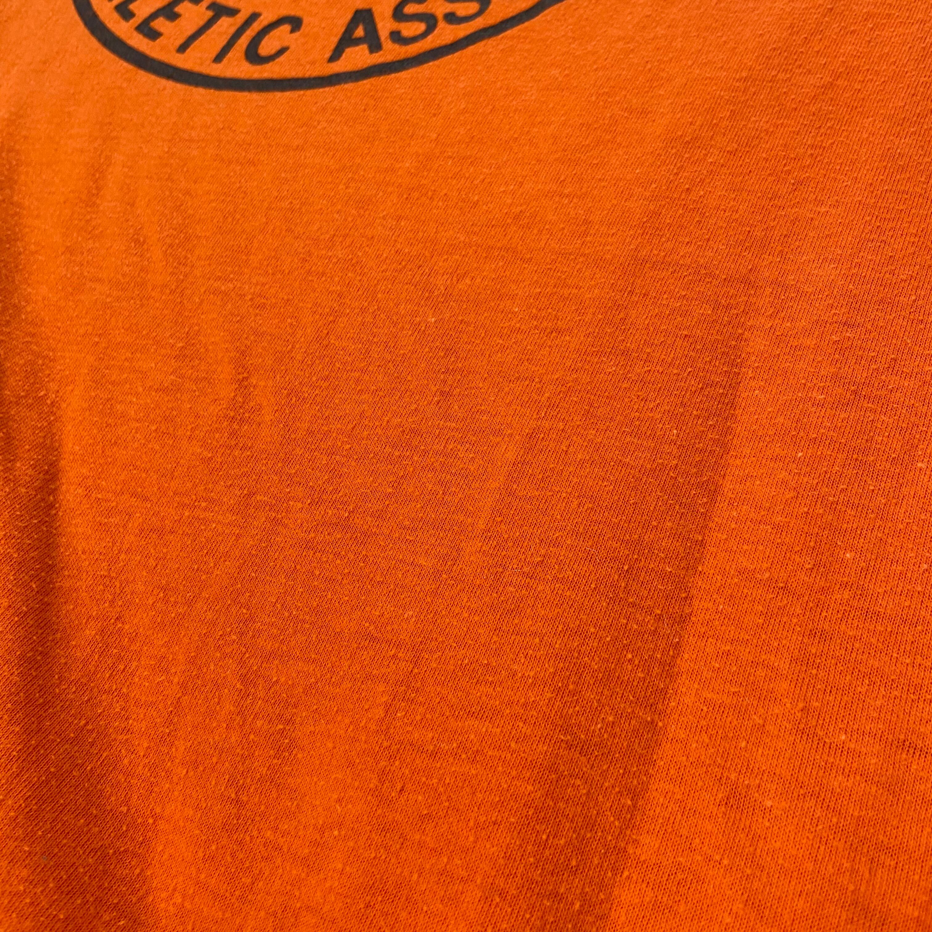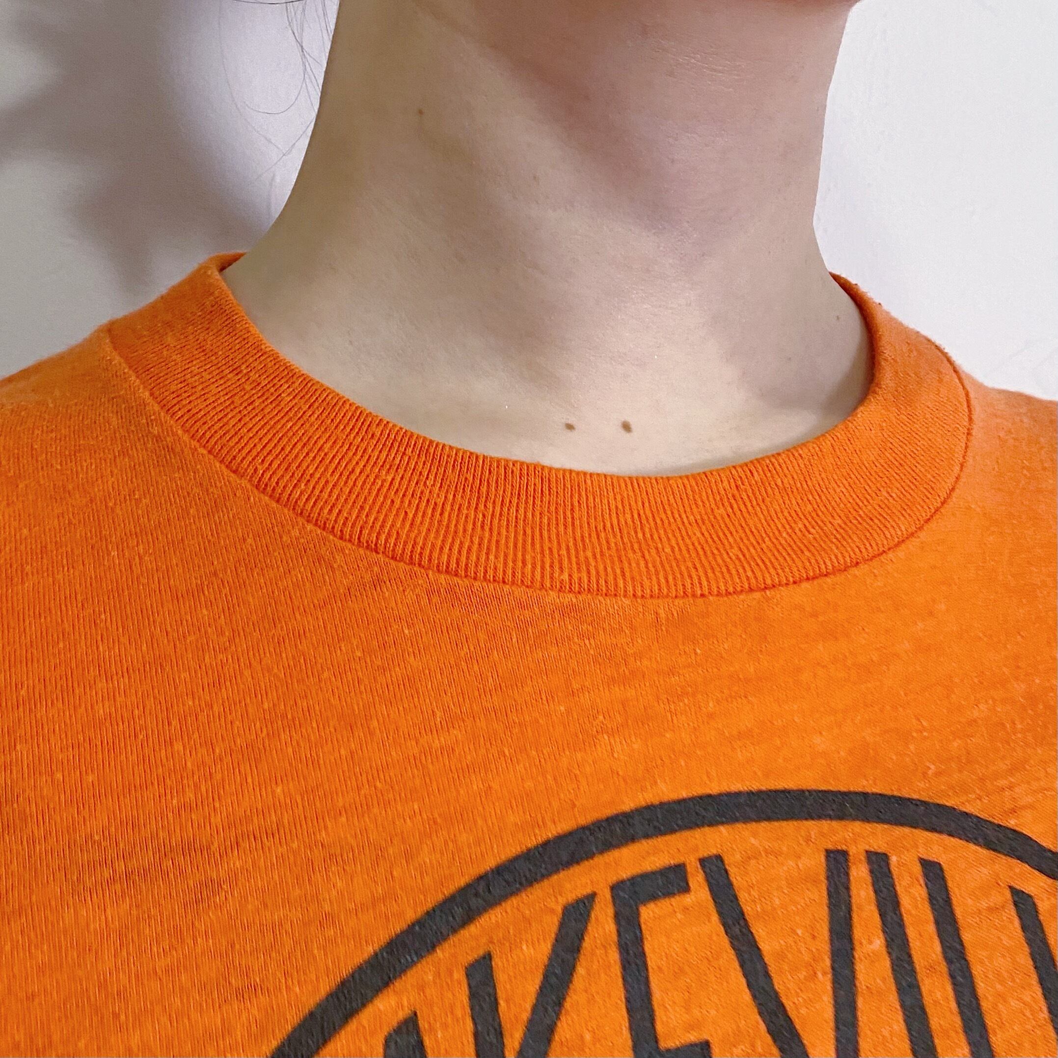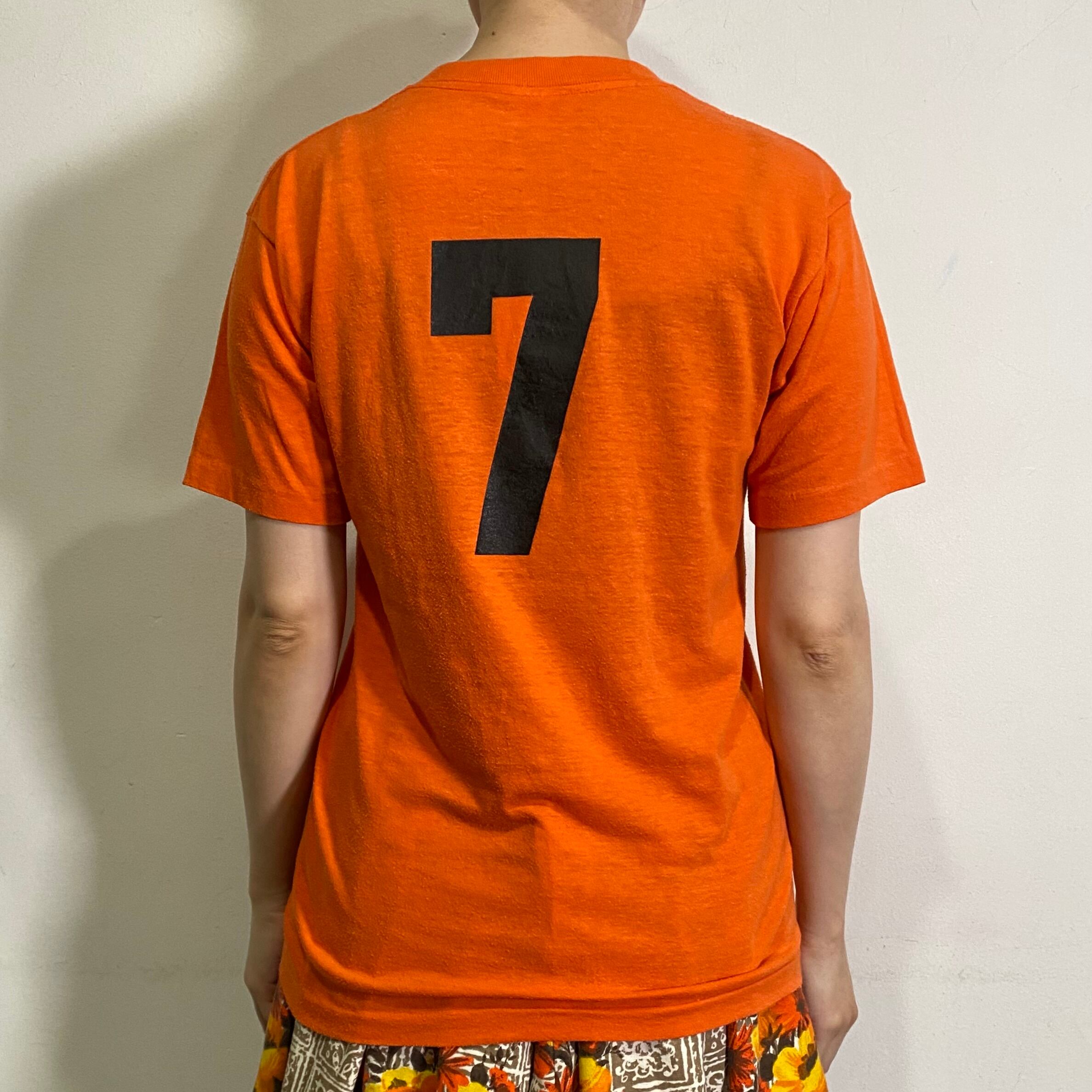 パキっとオレンジカラーに両面プリントが嬉しい、80年代のTシャツです。