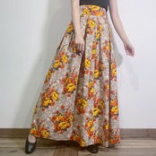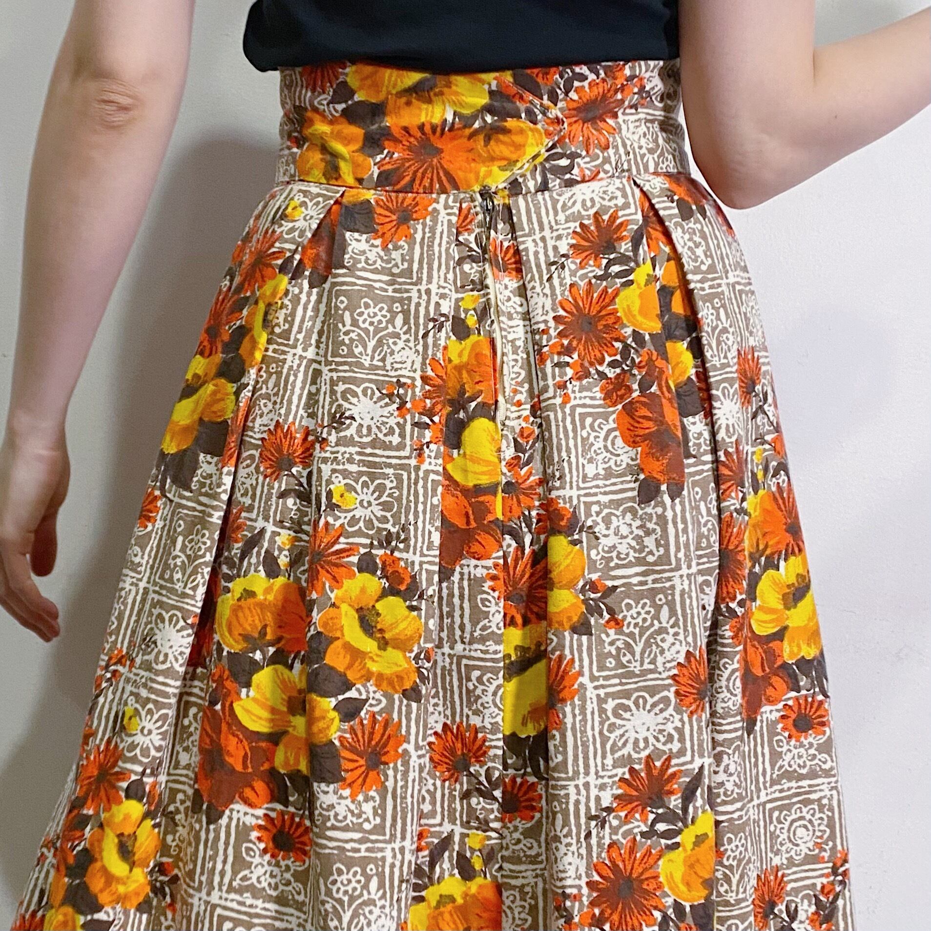 お花のタイルのような柄の上から、更にお花柄を載せたテキスタイルが素敵な70年代のロングスカートです。
