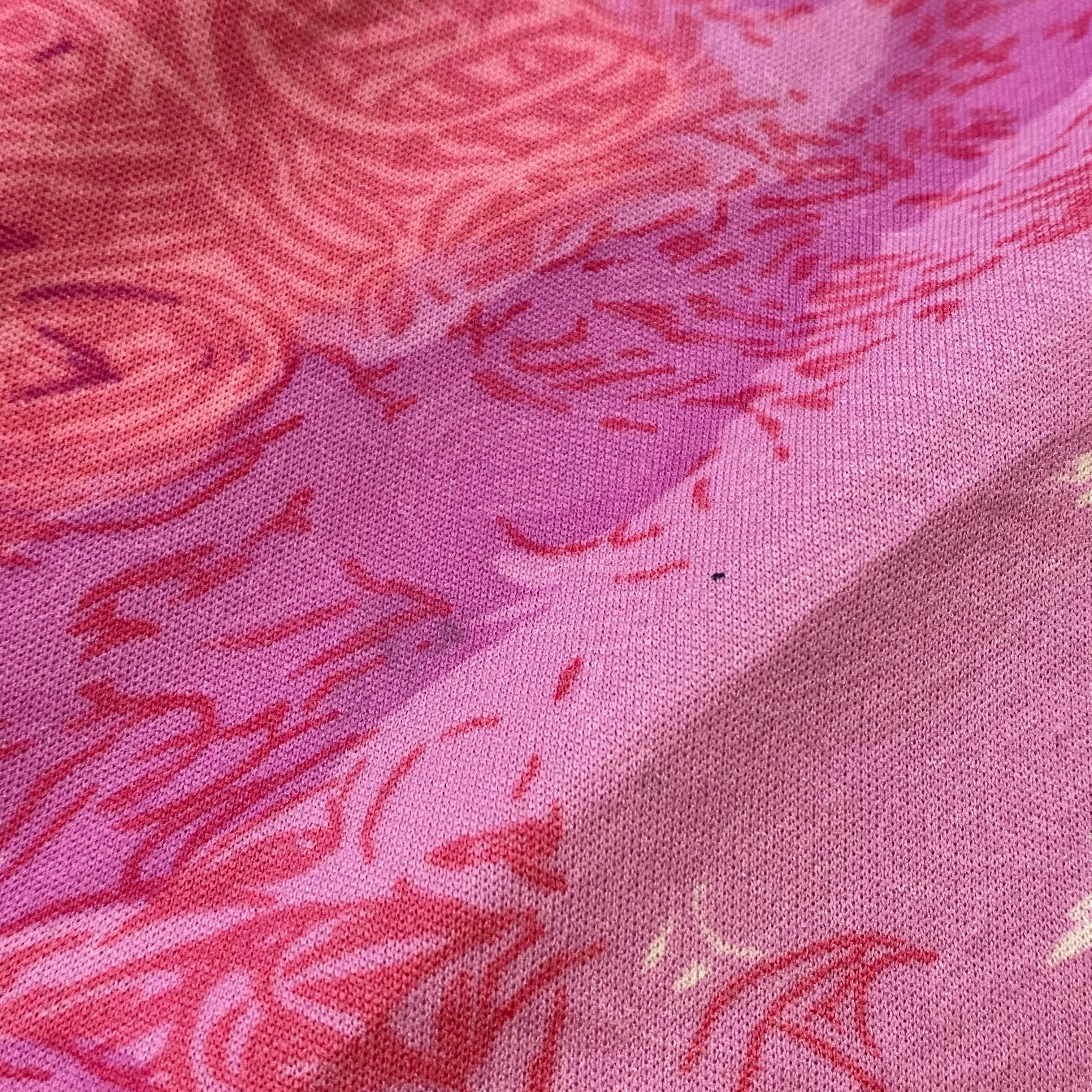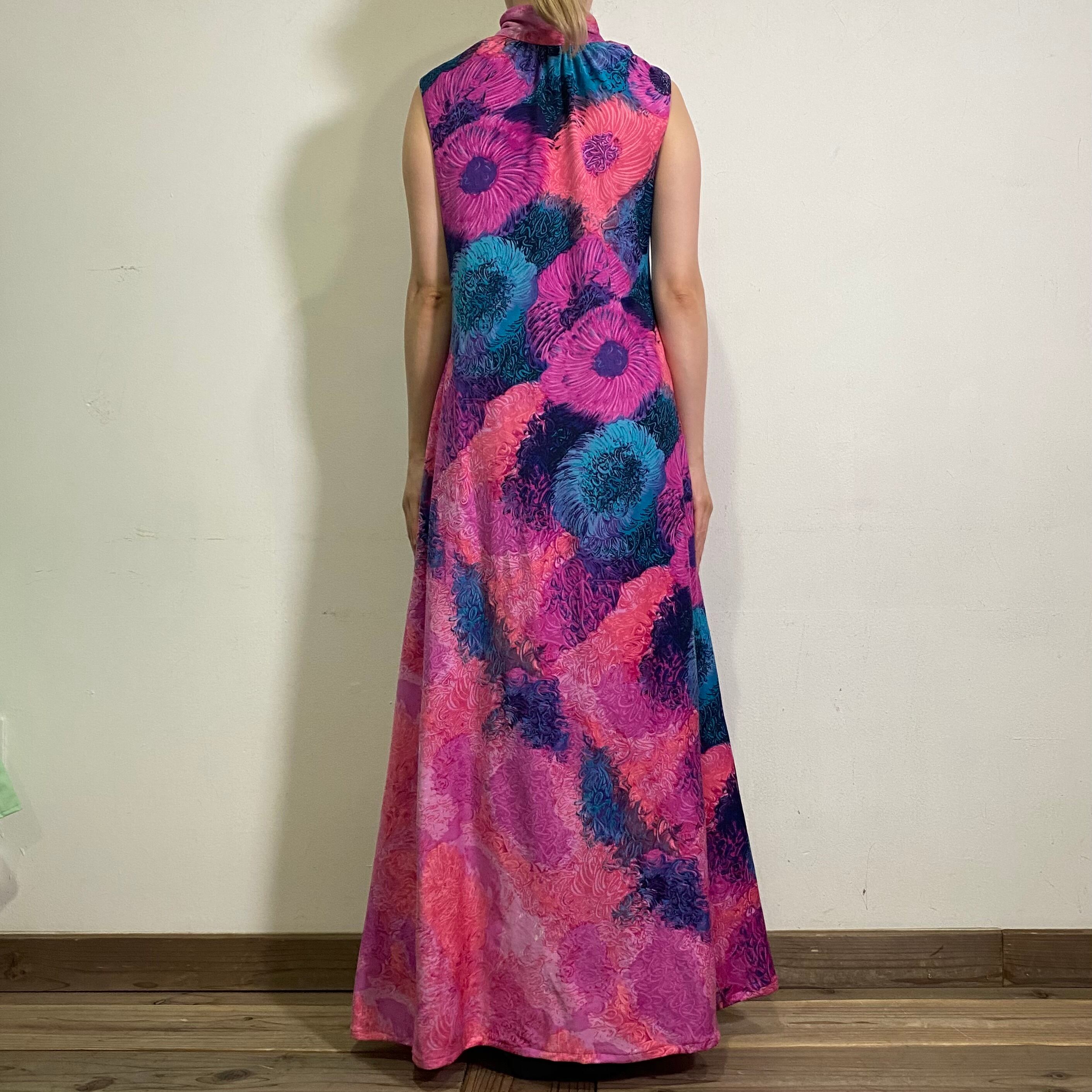 紫や水色、ピンクの色合いが可愛い、70年代の花柄ワンピースです。
