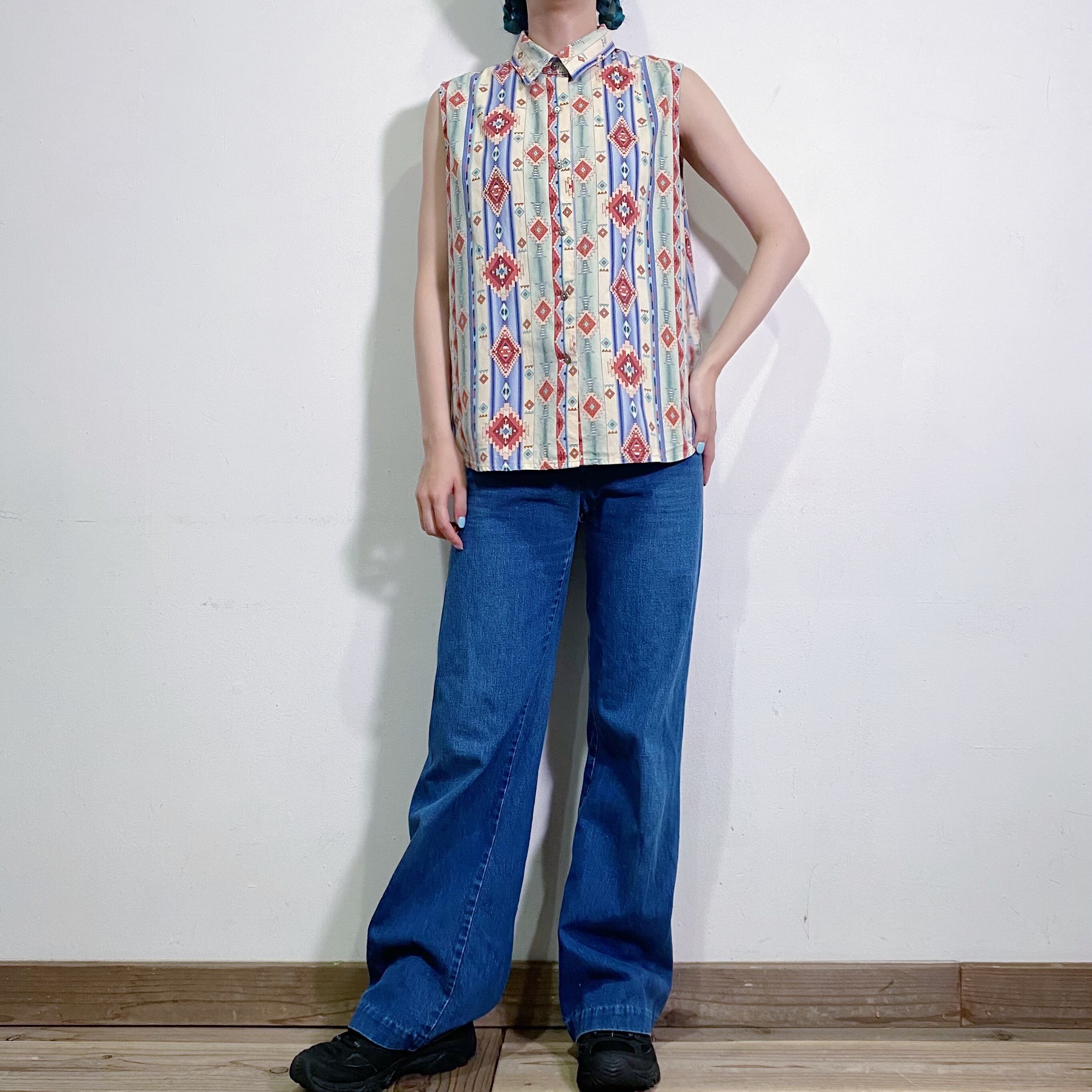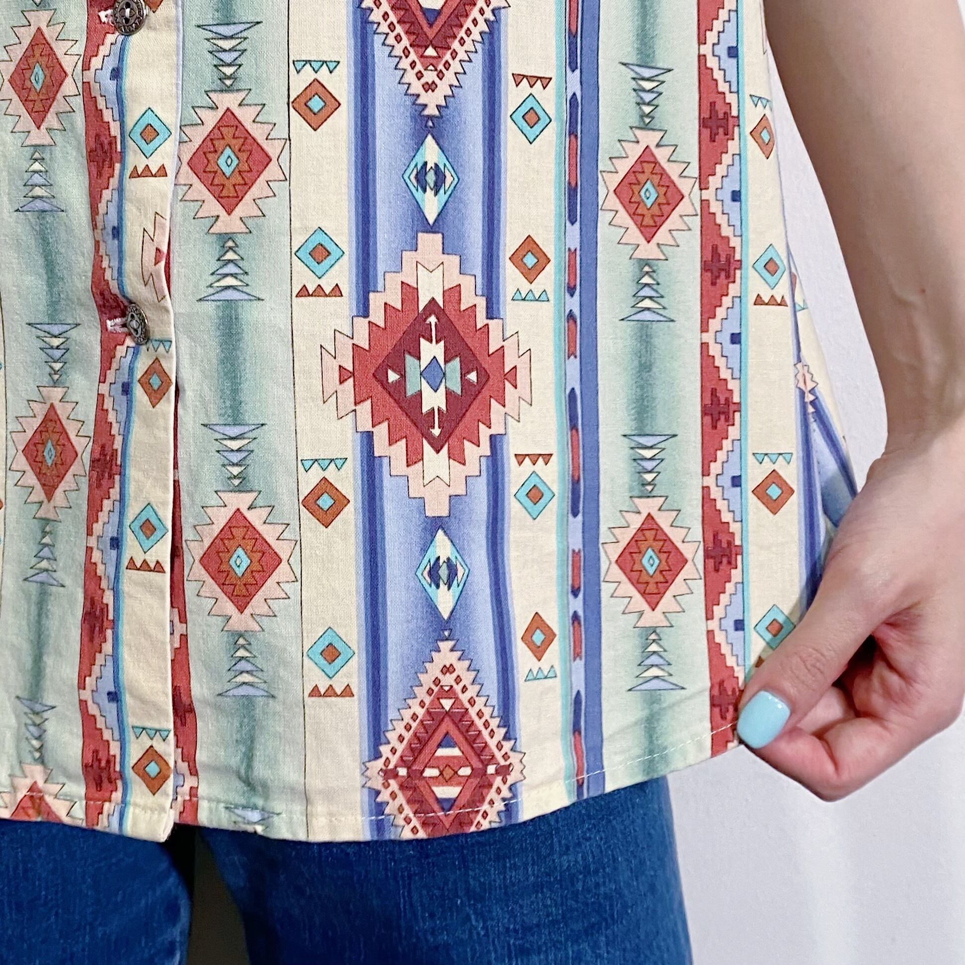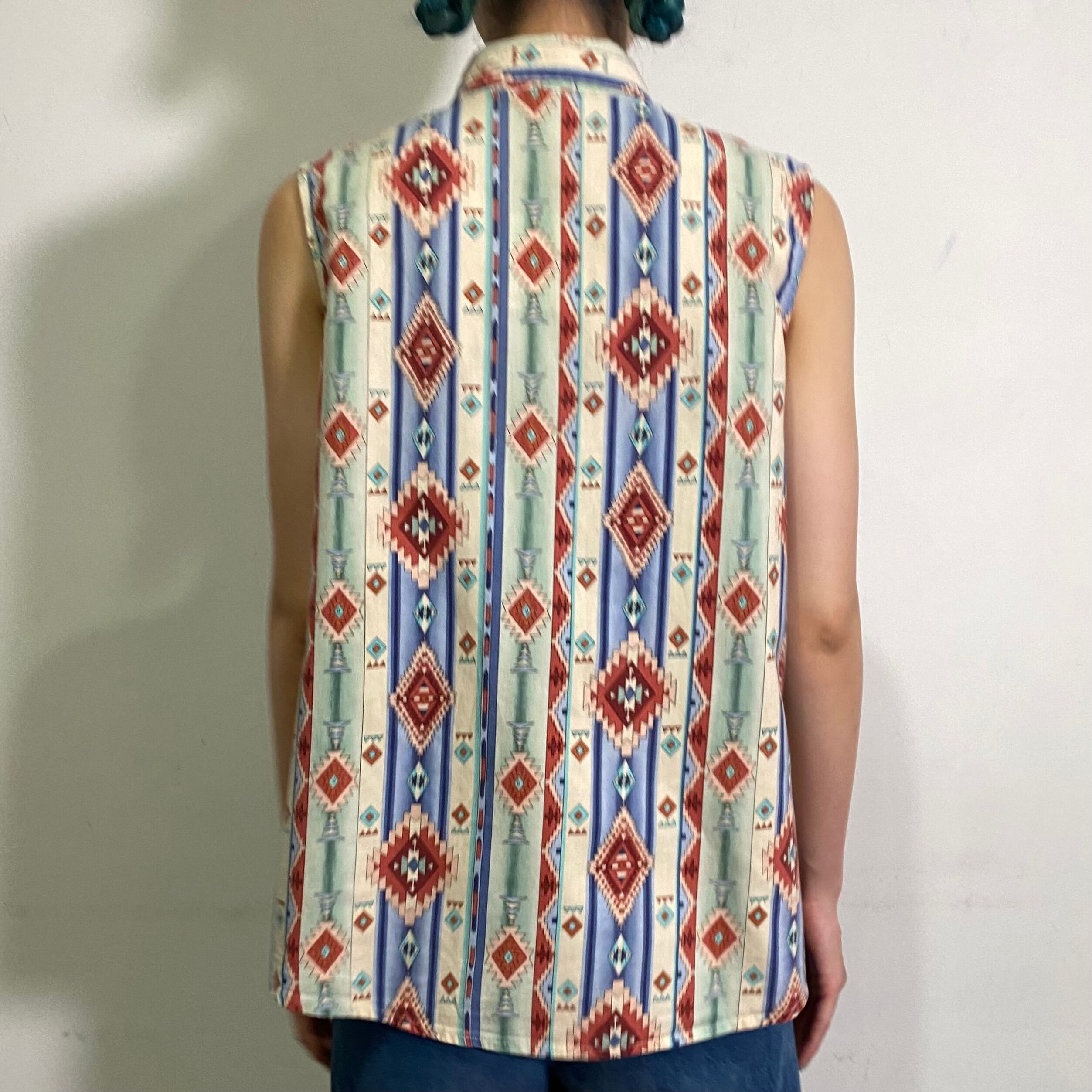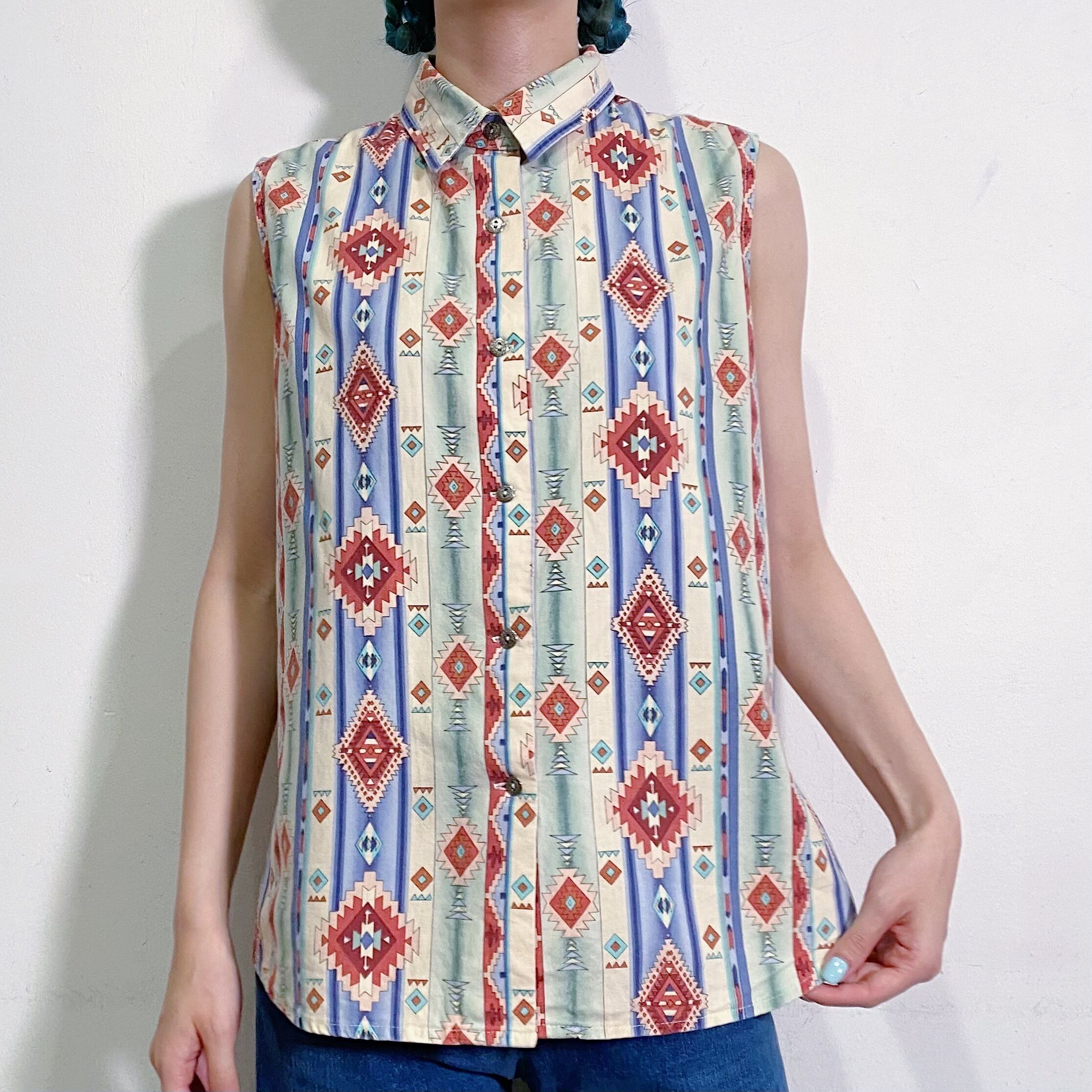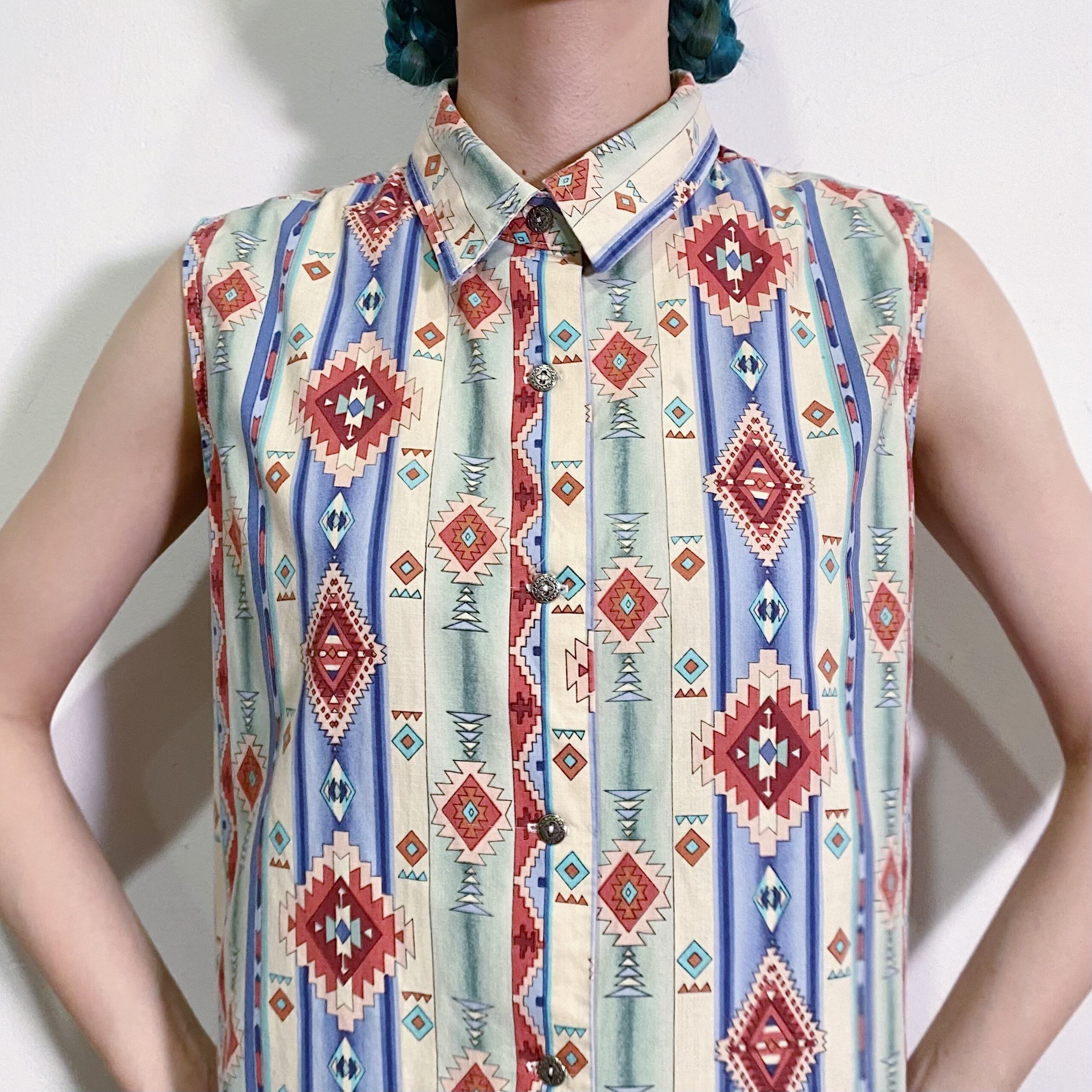 パステルっぽい色合いのネイティブ柄が可愛い、ノースリーブシャツです。