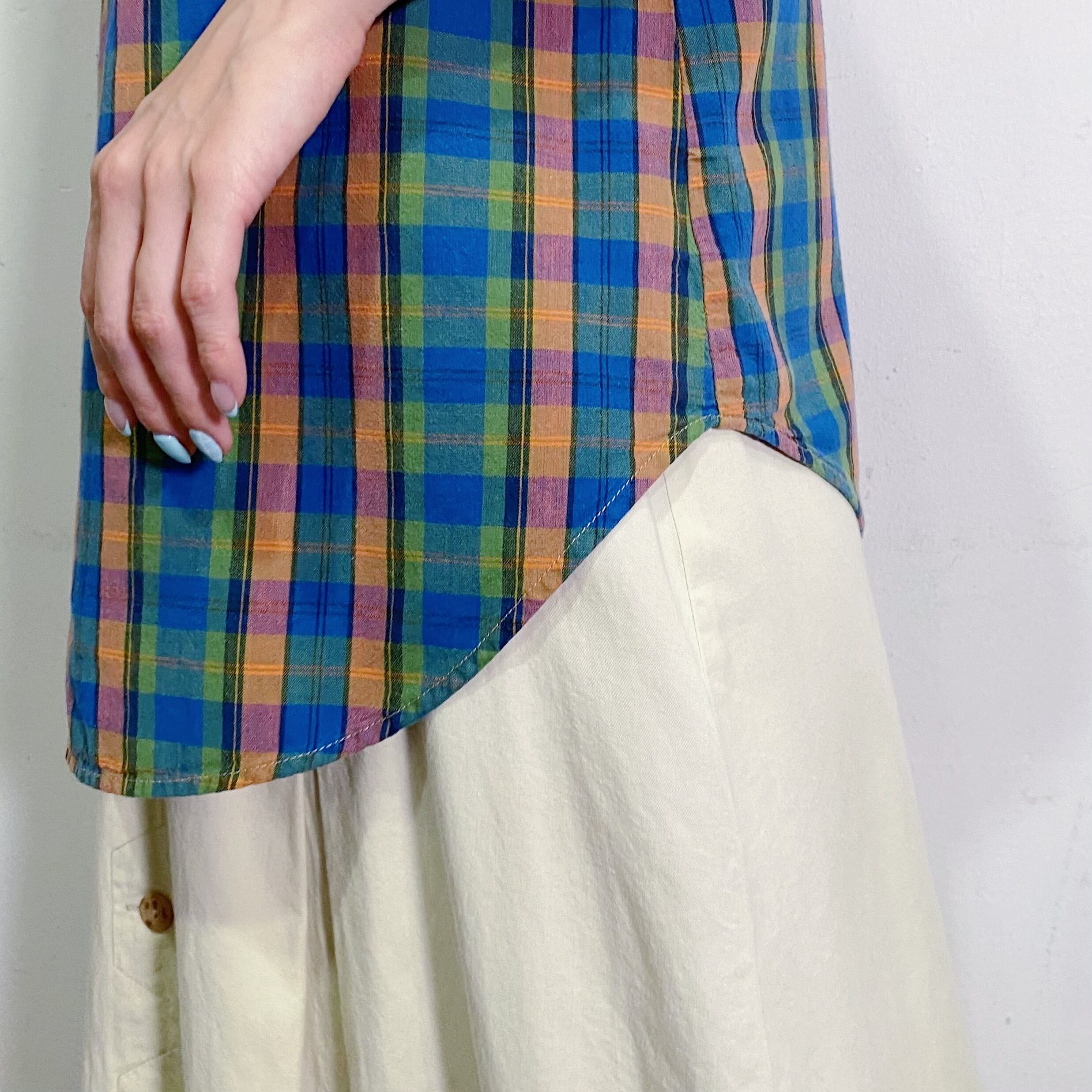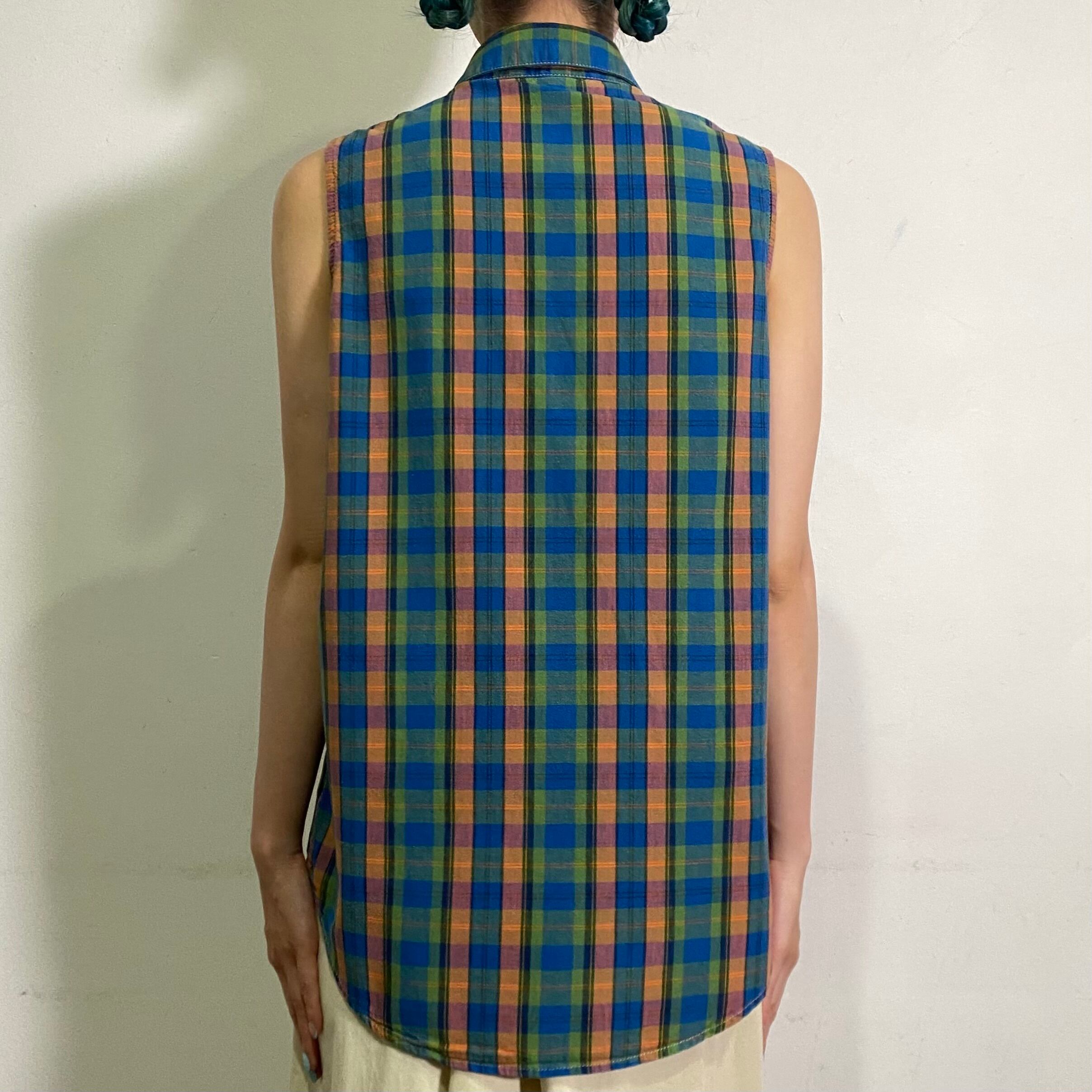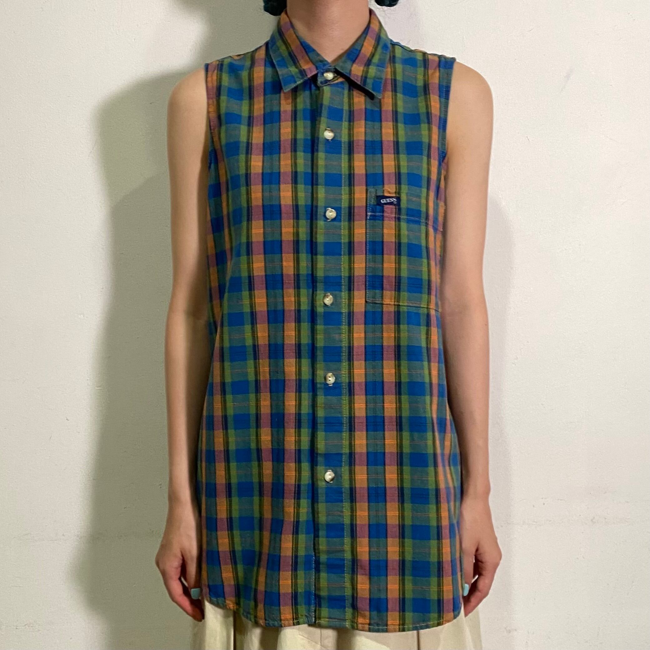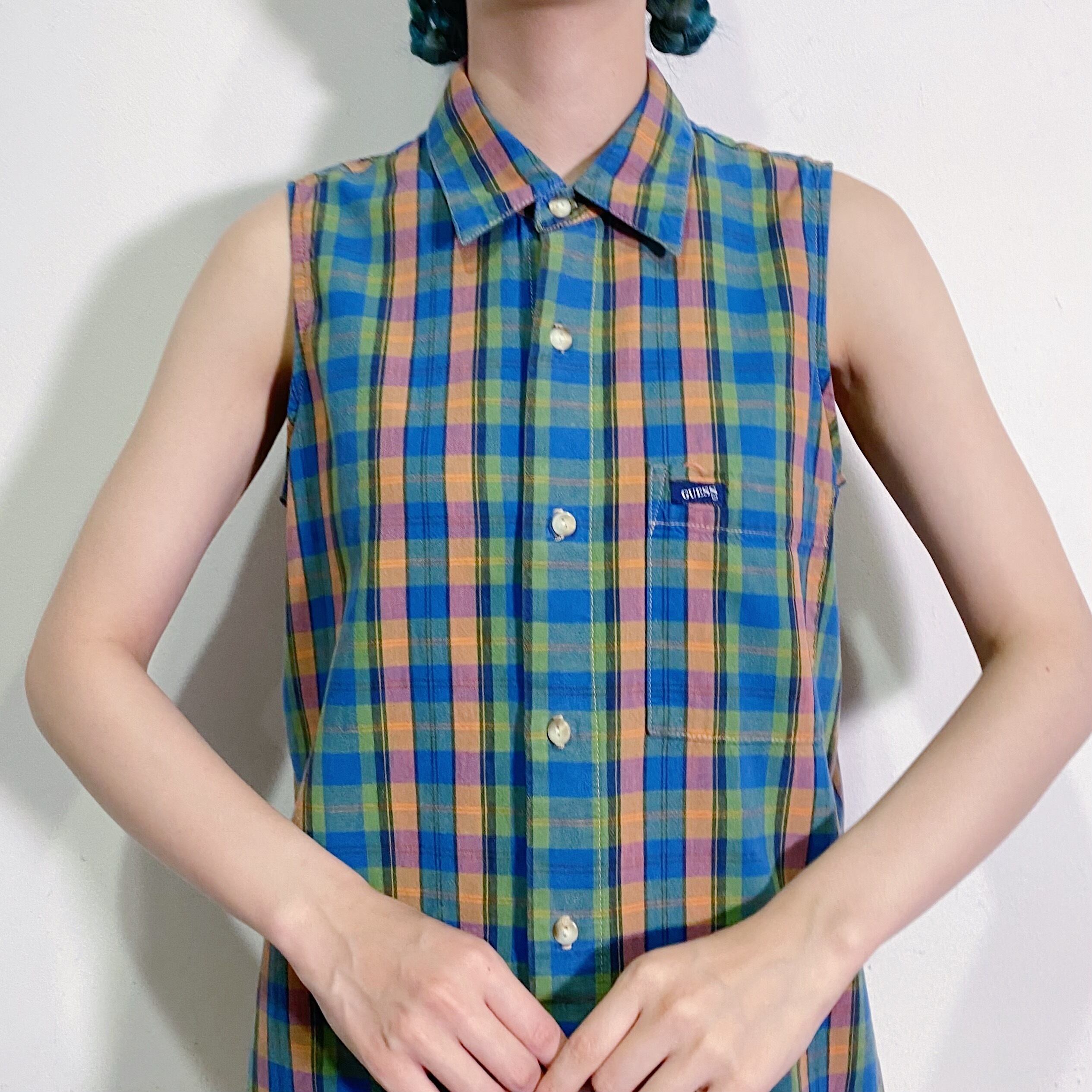 青、緑、オレンジのチェックが可愛い、GUESSのノースリーブシャツです。