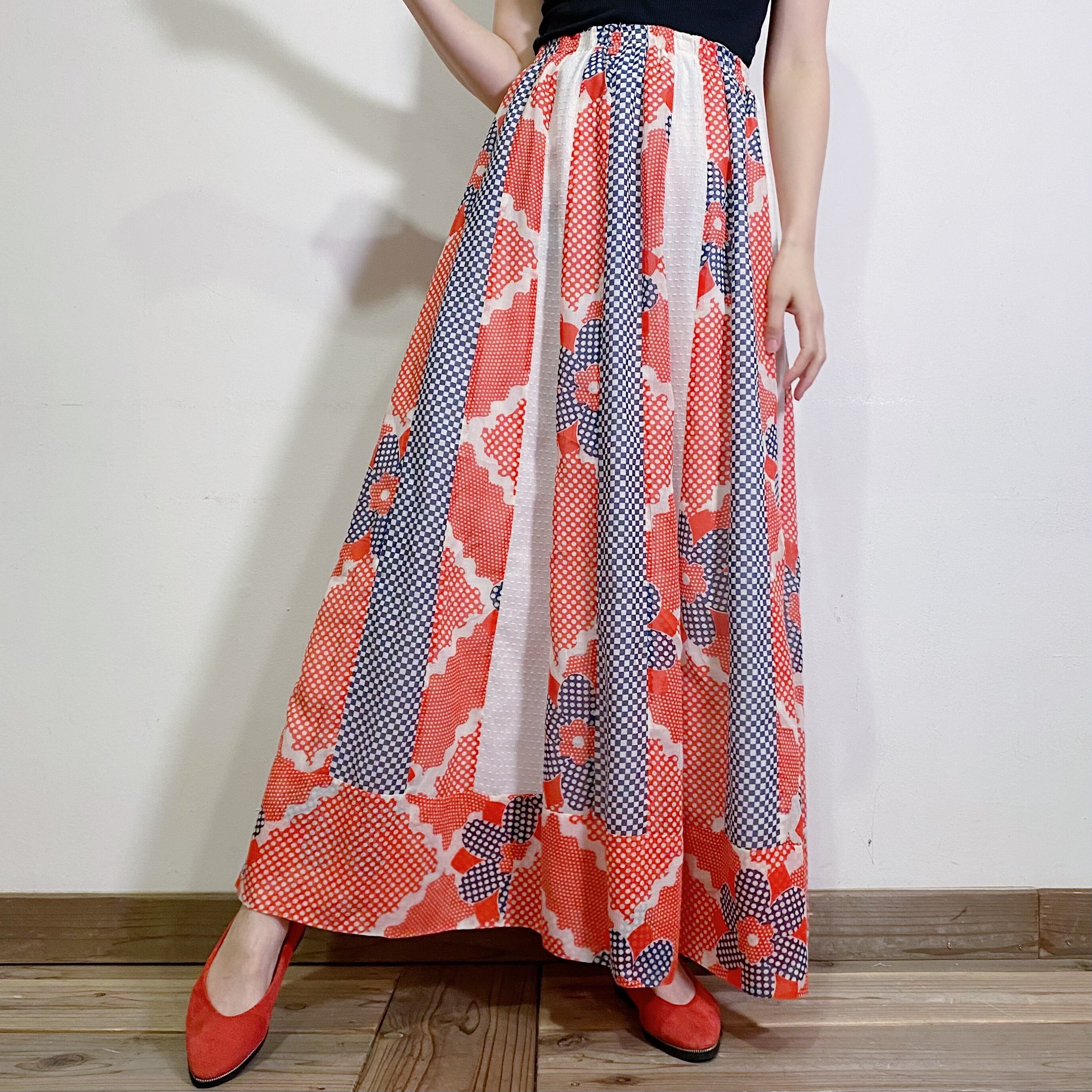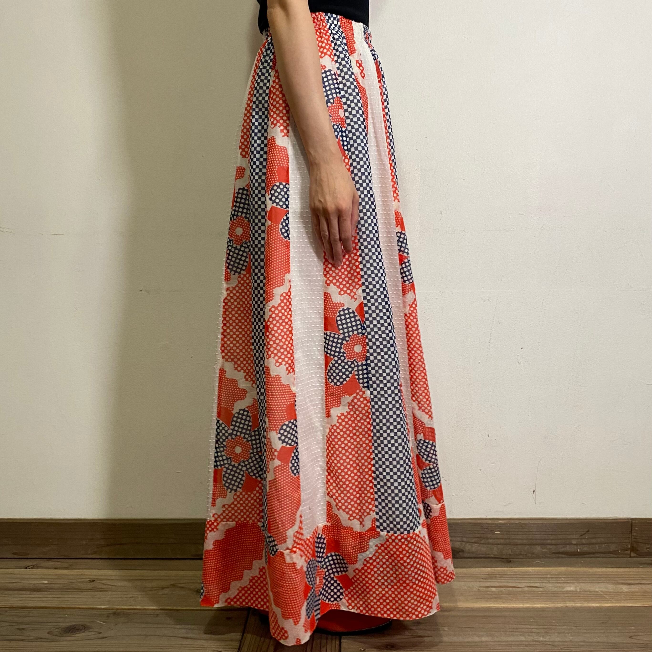 赤とネイビーの色合わせが可愛い、70年代のパッチワークスカートです。