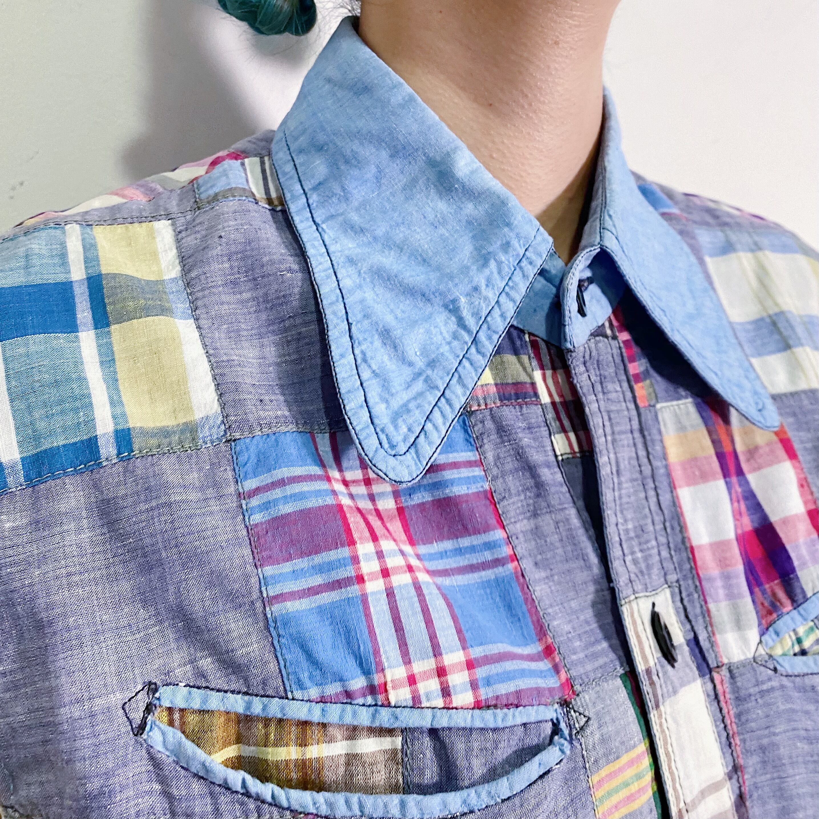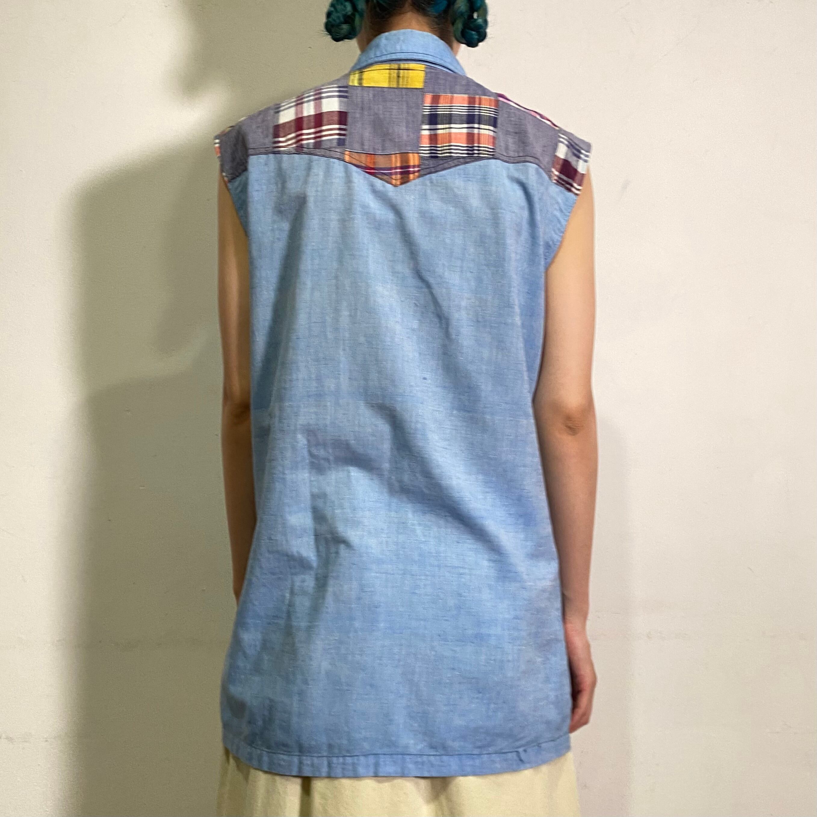 シャンブレー地に色々なチェックの組み合わせが可愛い、70年代のノースリーブシャツです。