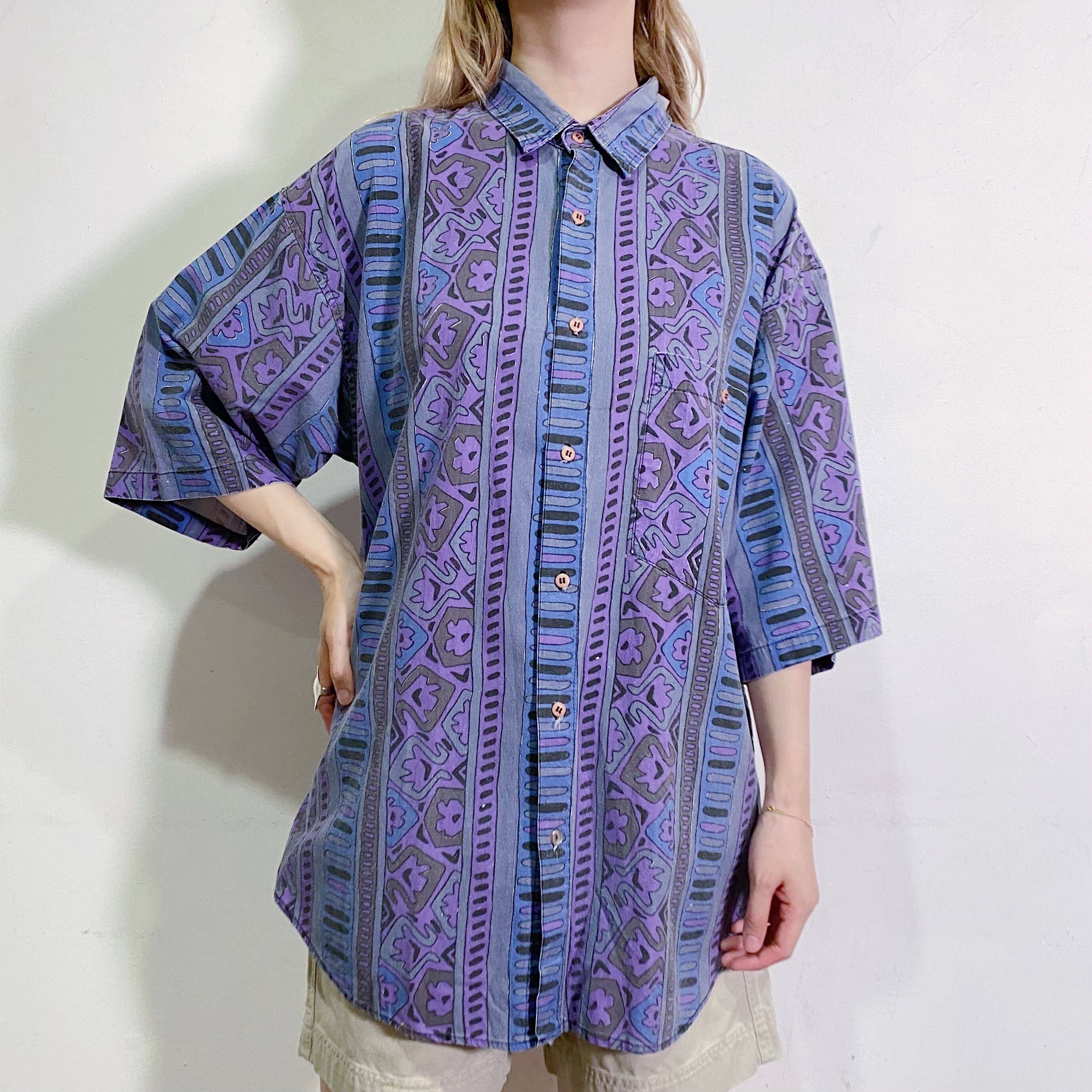 ブルーやパープル、グレーの色合わせが可愛い、半袖シャツです。