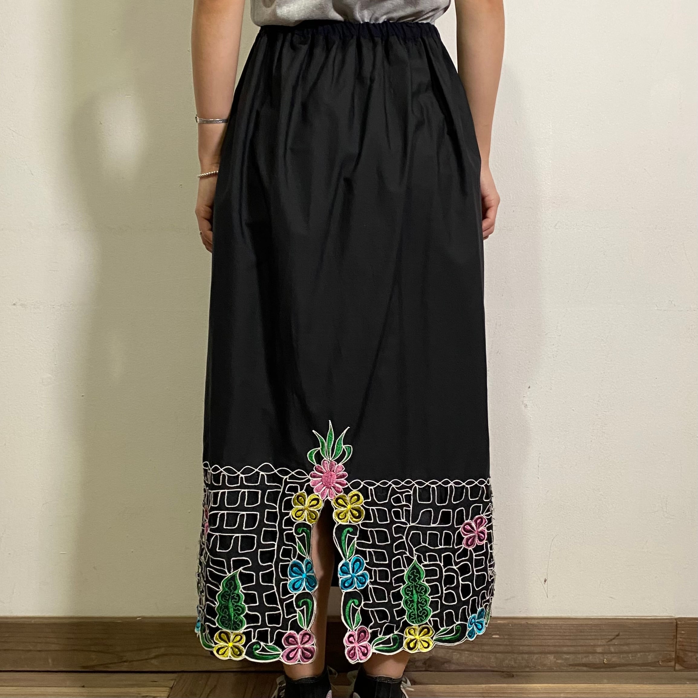 ブラックベースにカラフルなお花の刺繍が映える、スカートです。