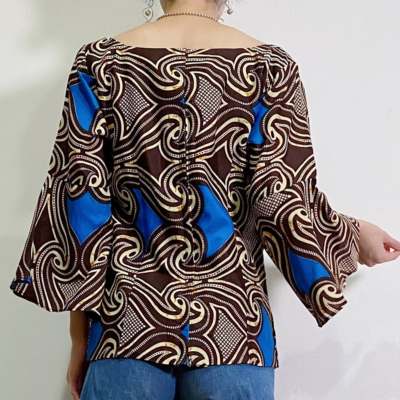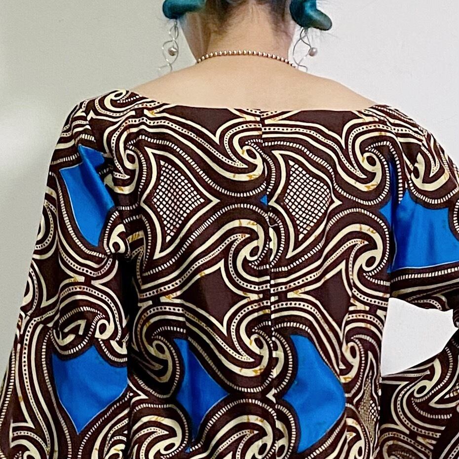 アフリカンバティックらしい凝ったデザインで、フレアスリーブに首元のユニークなカットラインがポイント。