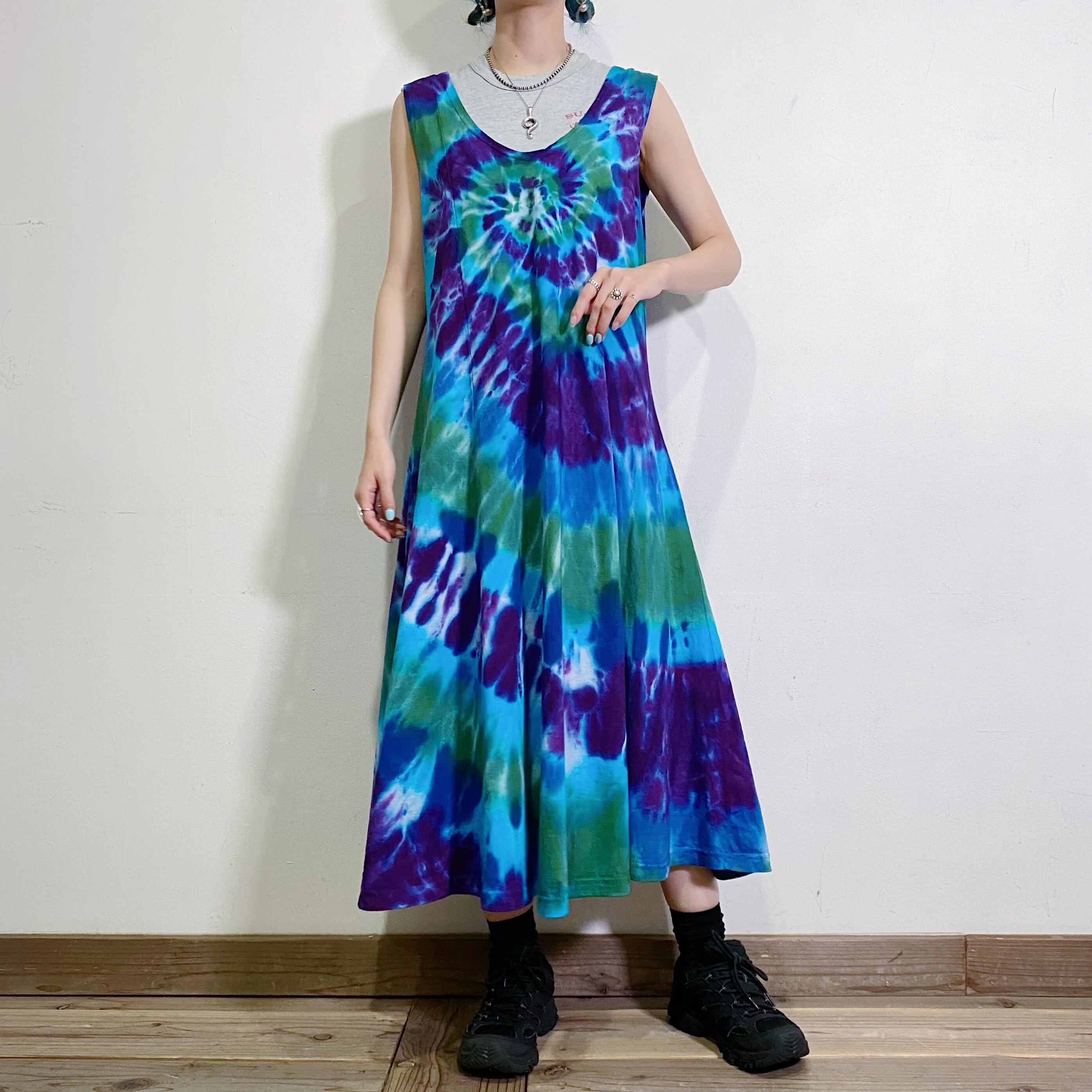 ブルー×グリーン×パープルのタイダイ柄が可愛い、ノースリーブワンピースです。