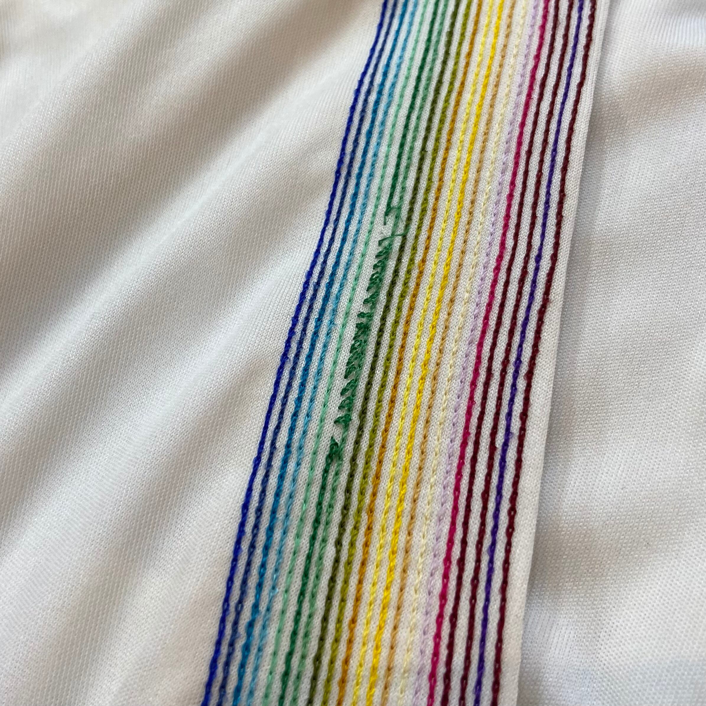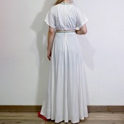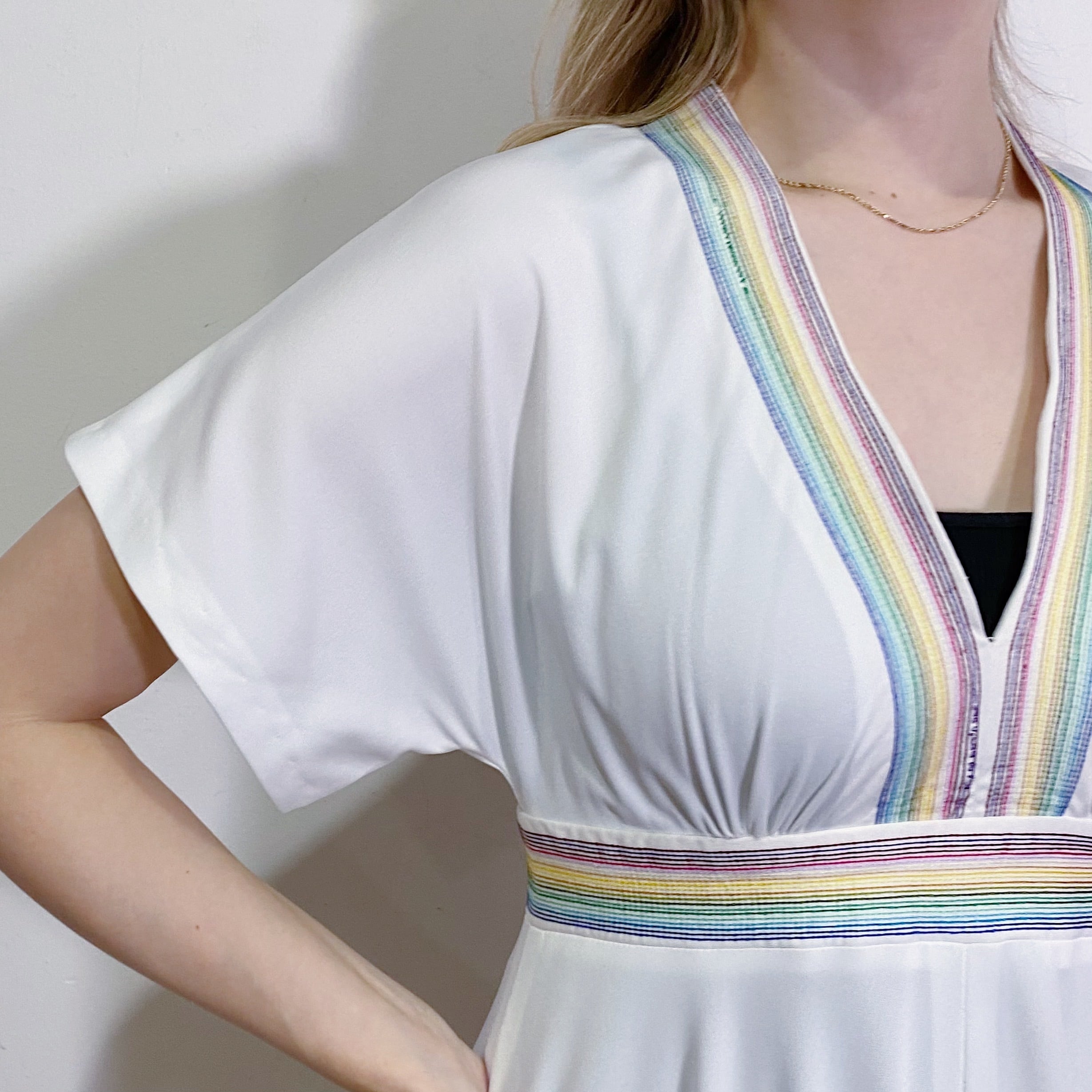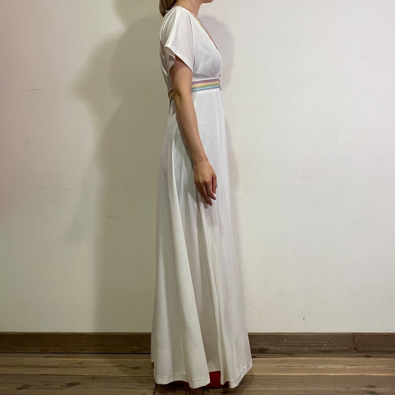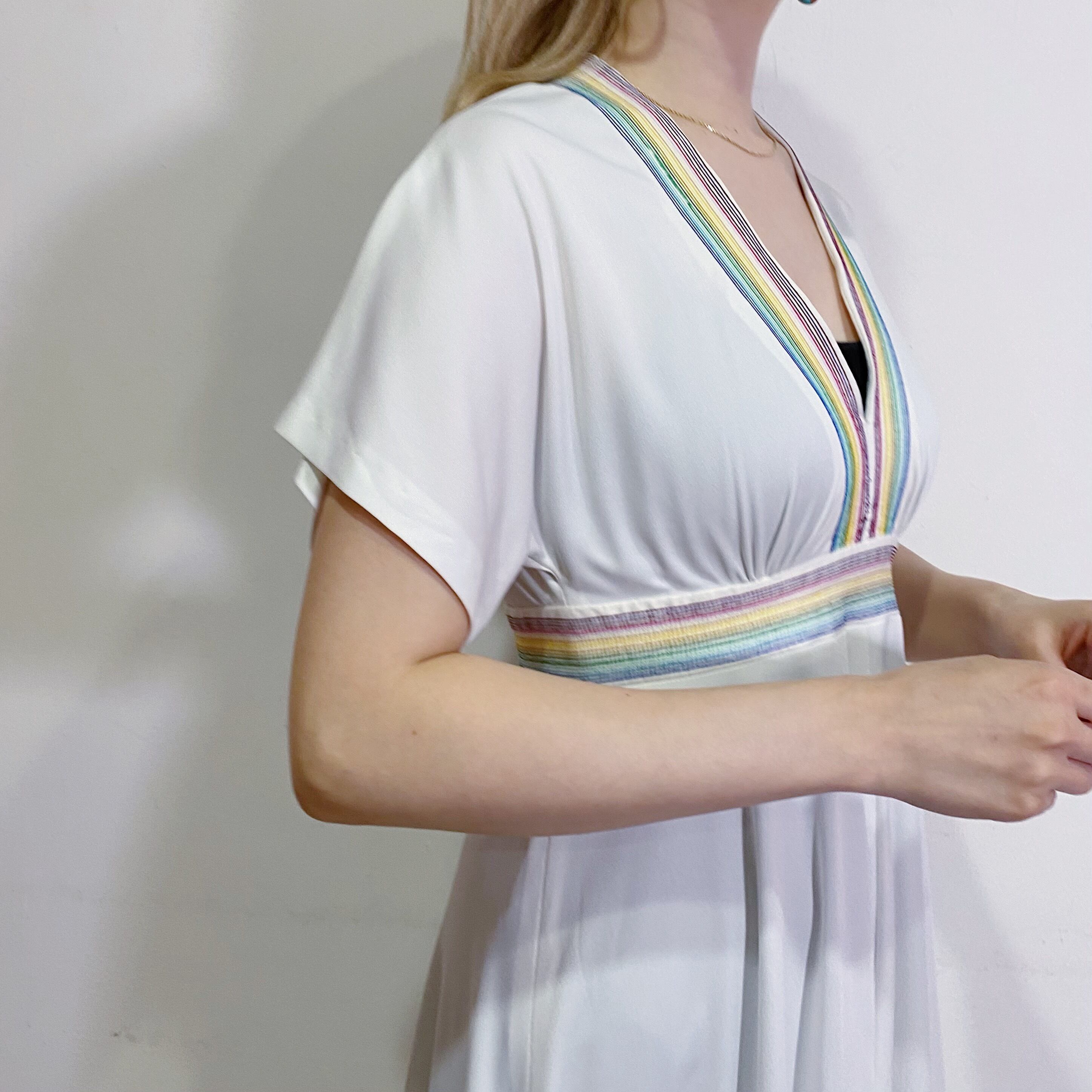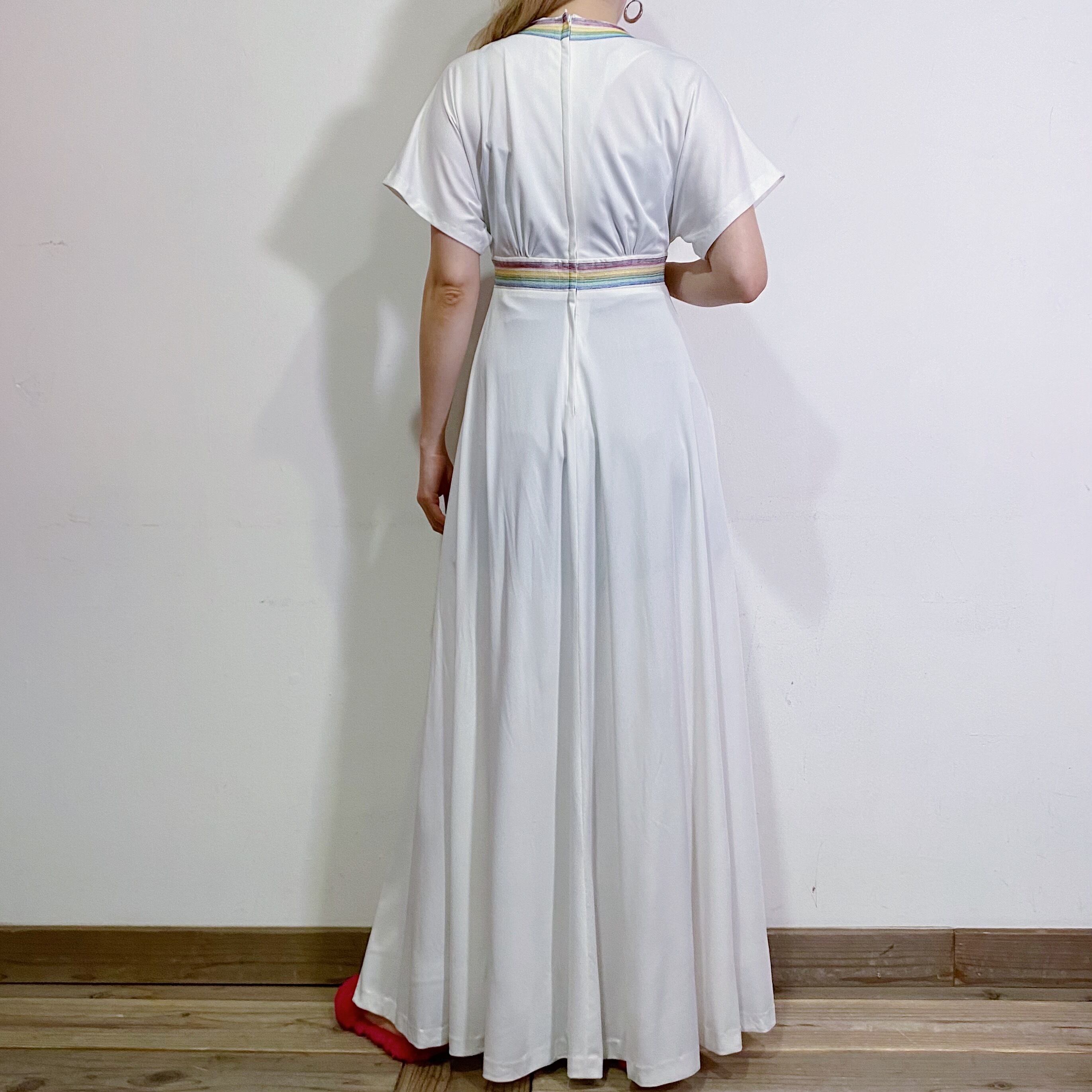 真っ白なボディに細かなレインボーステッチが可愛い、70年代のロングワンピースです。