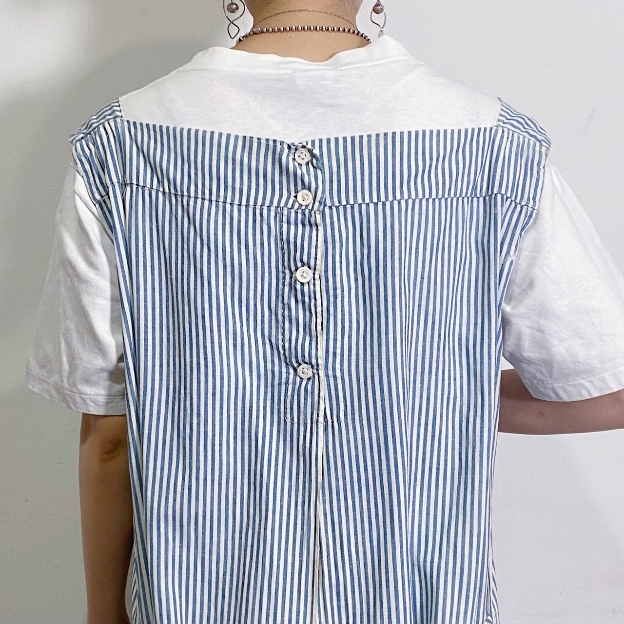 こちらは前後両方で着用できるようになっており、前で着たワンピーススタイルと、後ろで着た羽織スタイルの2way感覚で着て頂けますよ。