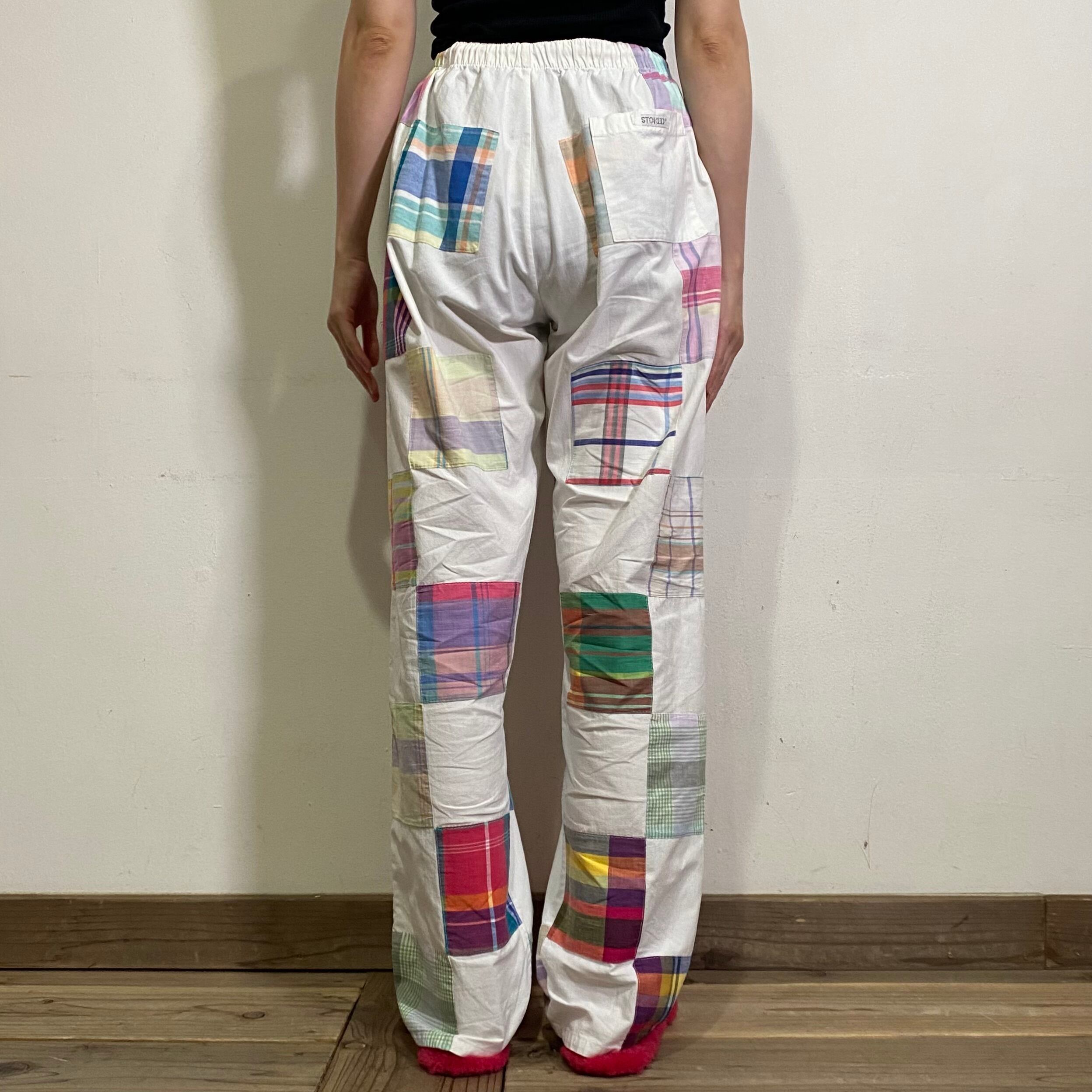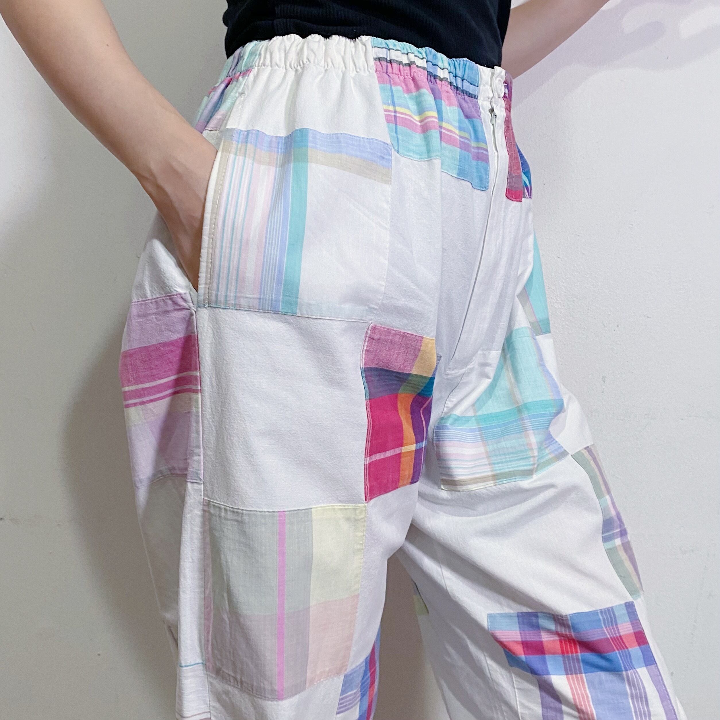淡い色合いのチェックの生地がパッチされた、とっても可愛いコットンパンツです。