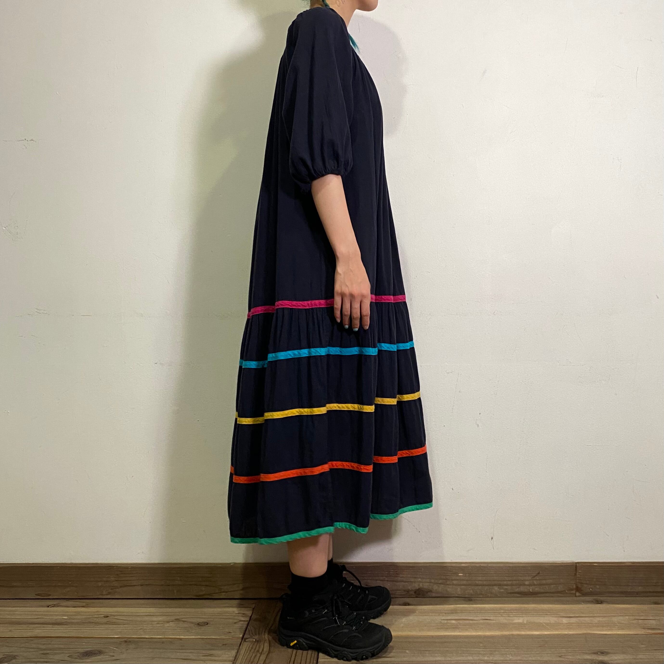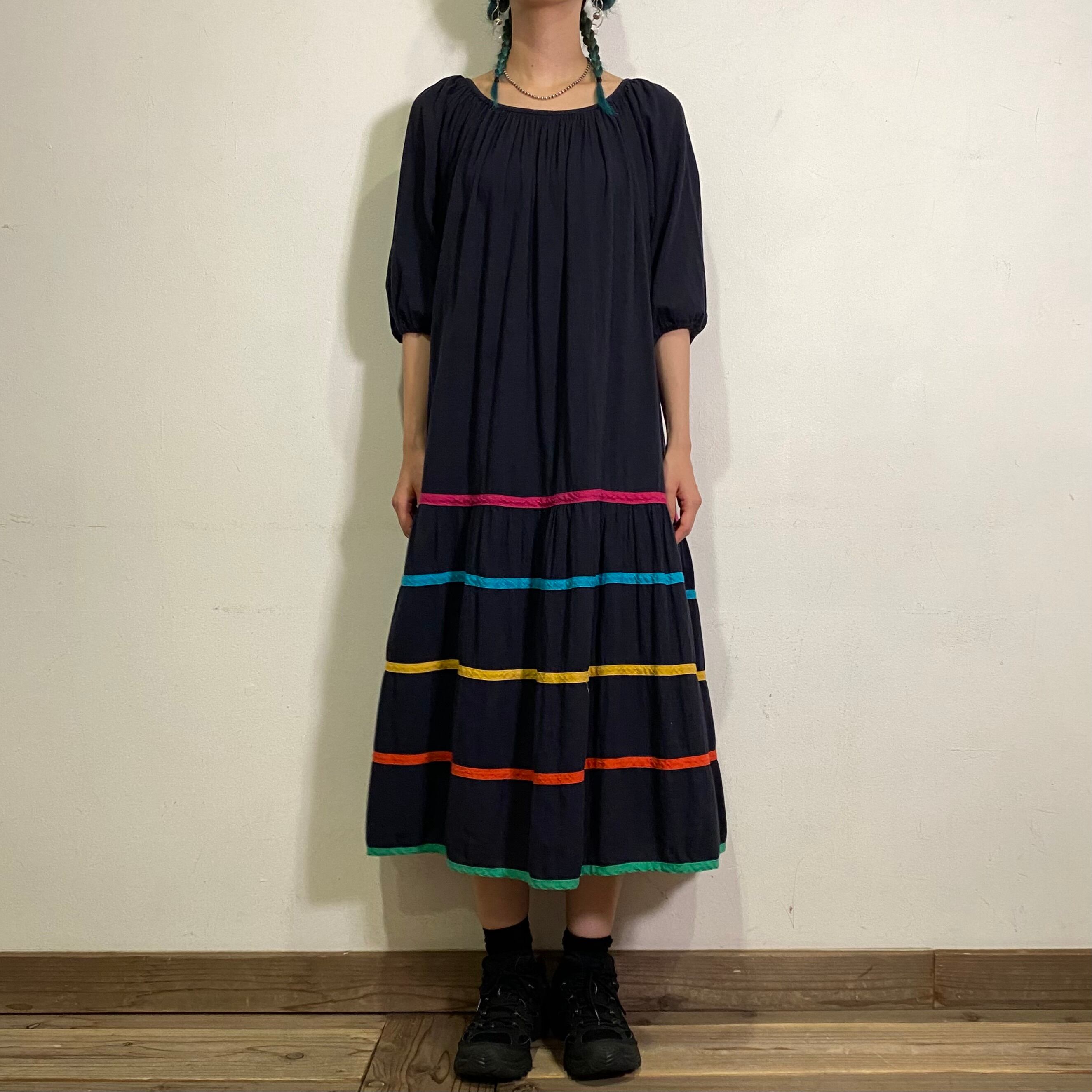 ブラックベースに裾のカラフルなテープが映える、80年代のワンピースです。