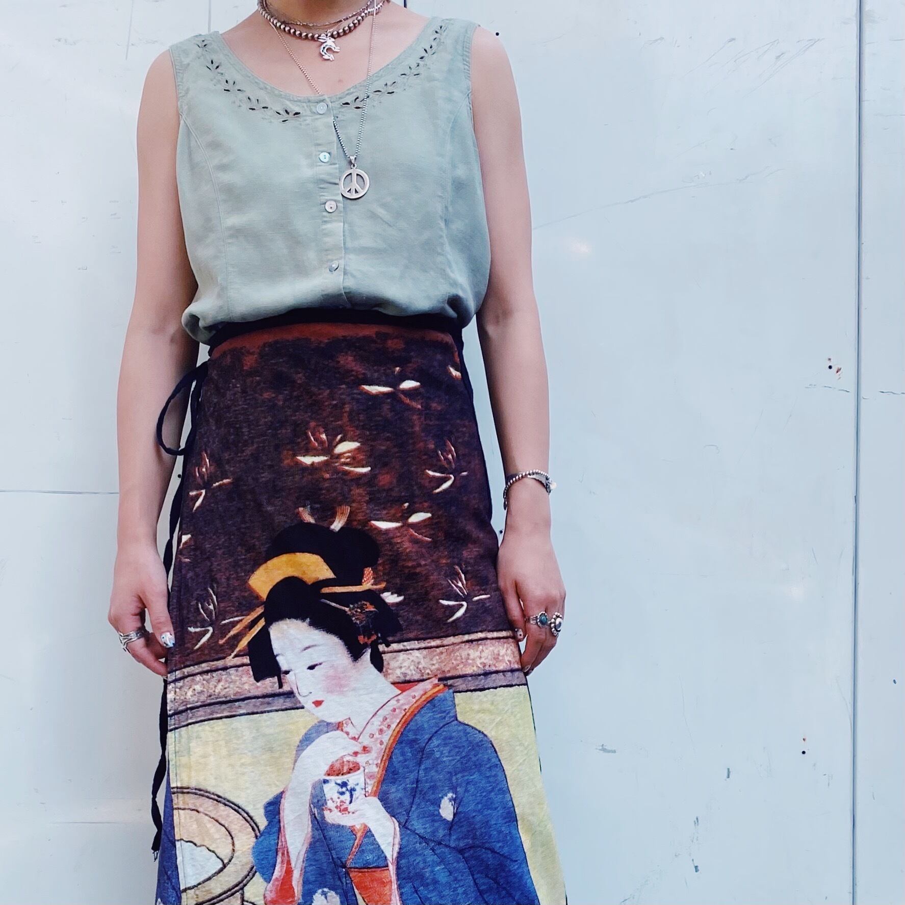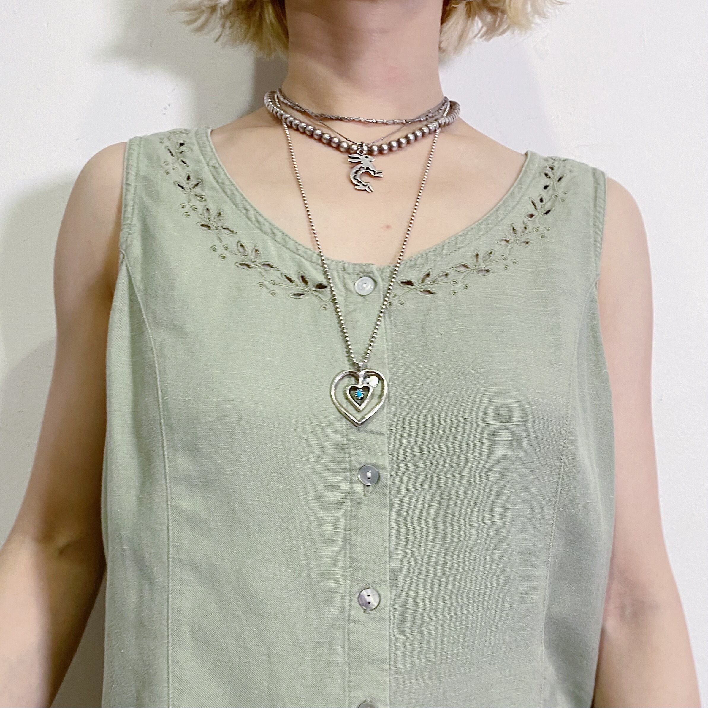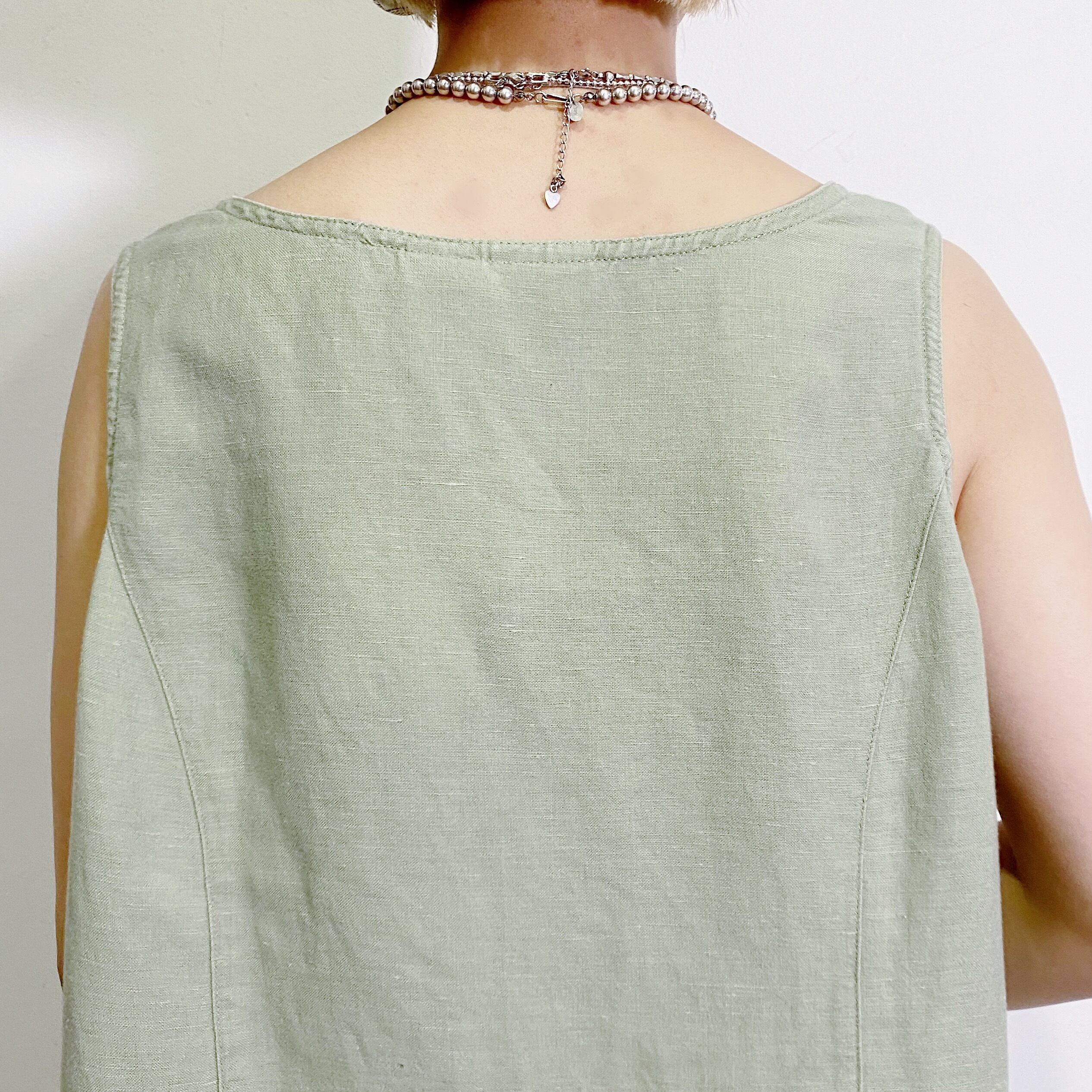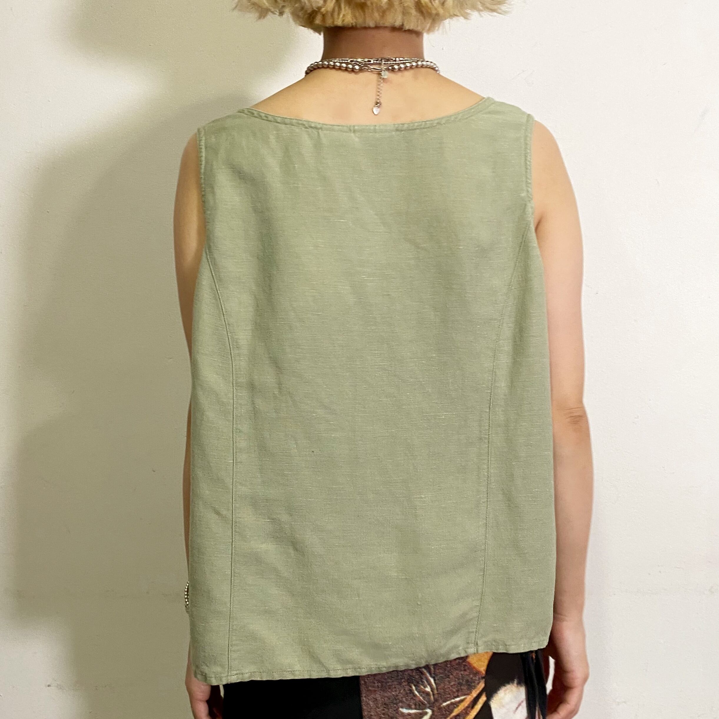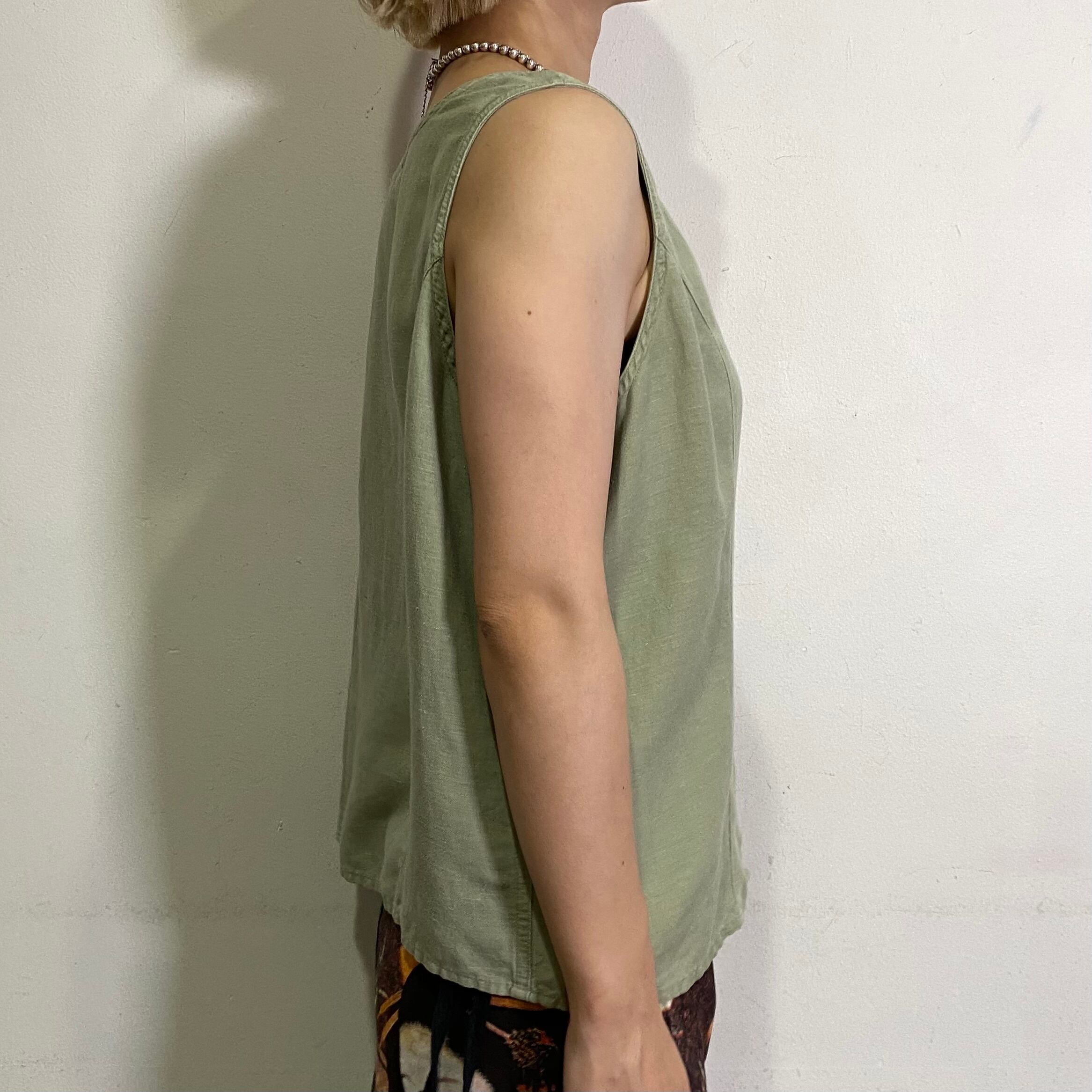 スモーキーなグリーンに首回りの刺繍が可愛い、ノースリーブトップスです。