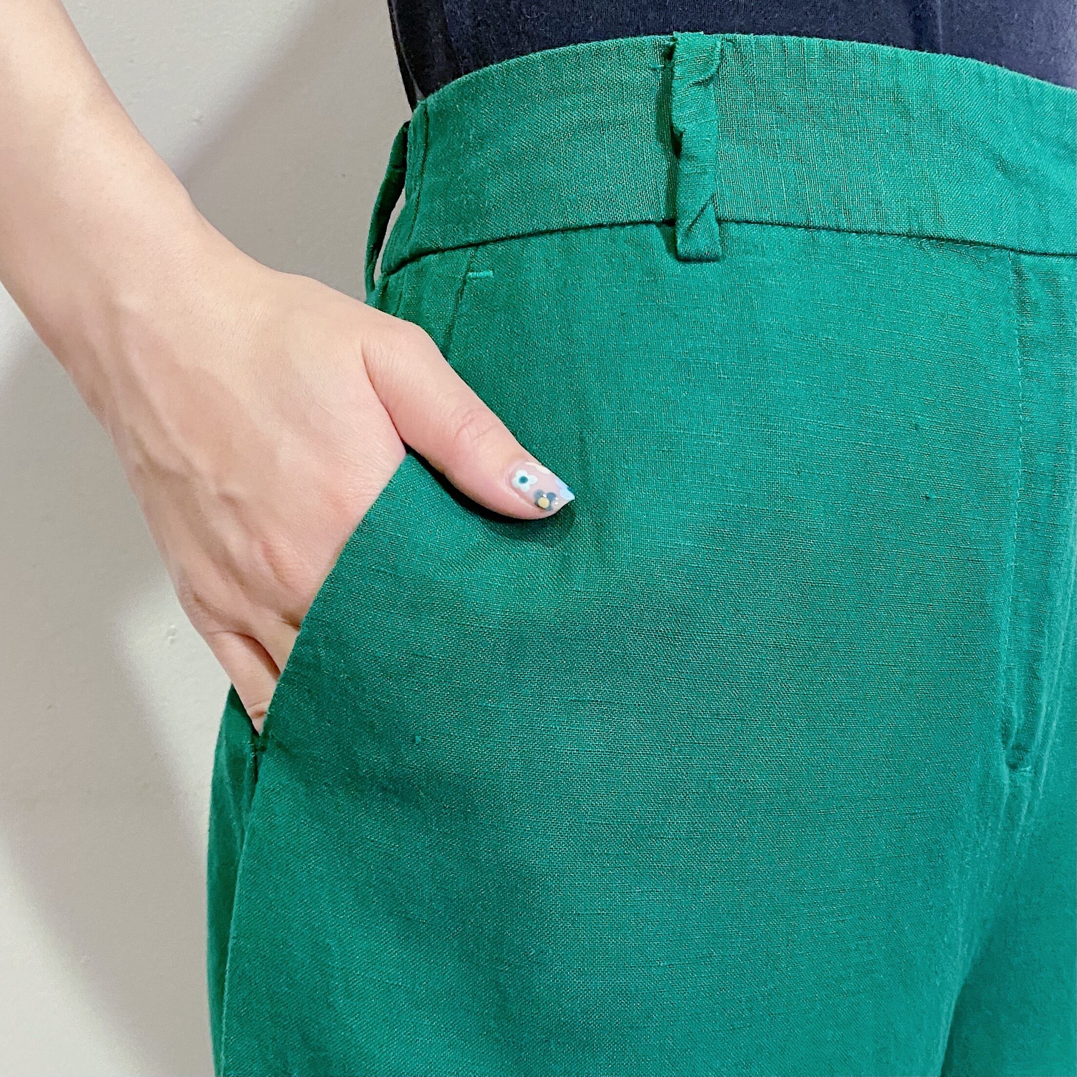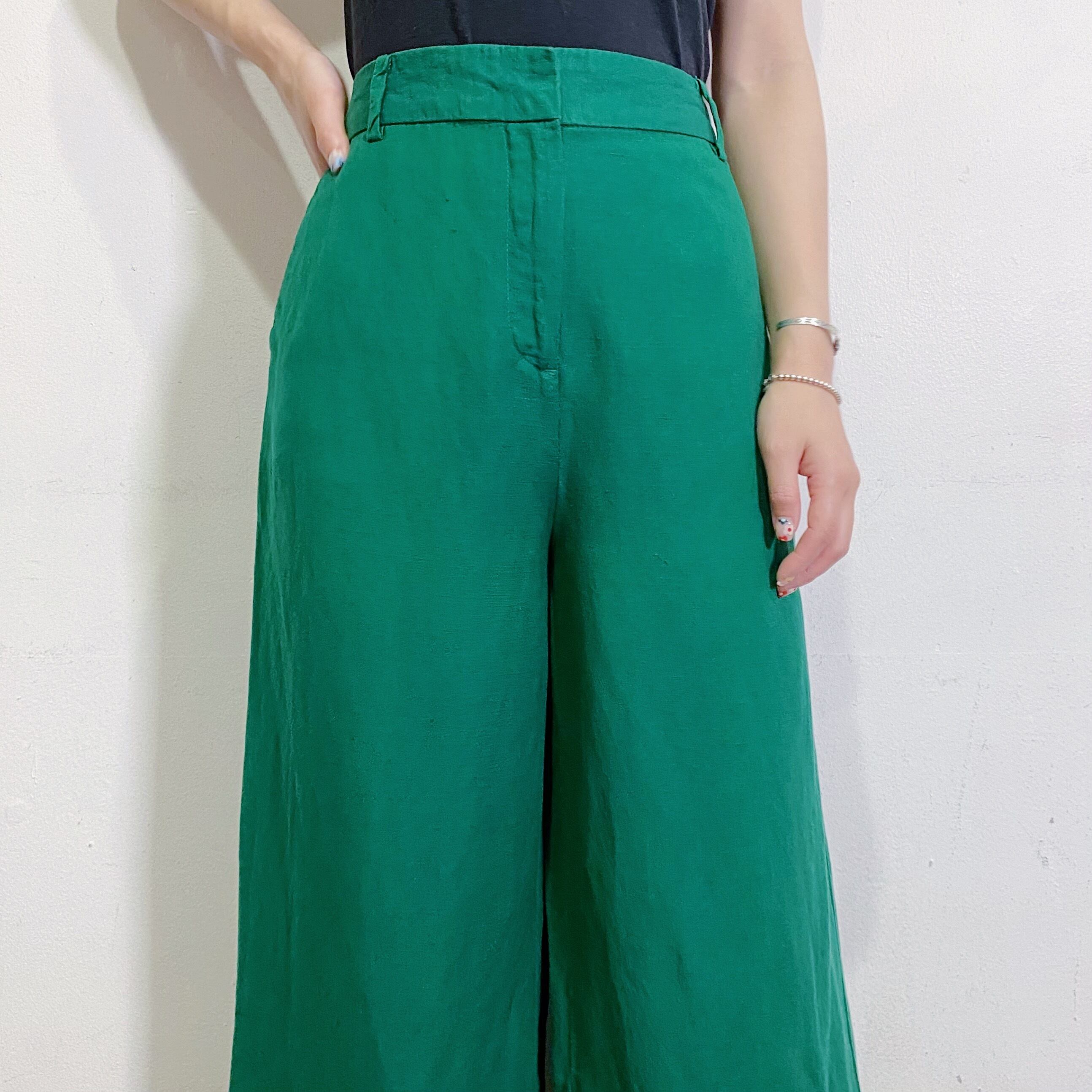 グリーンの色合いとワイドなシルエットが可愛いパンツです。