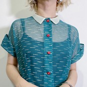 ホワイトの小さな襟や、赤いラインストーンの入ったボタンがアクセントになった一枚。