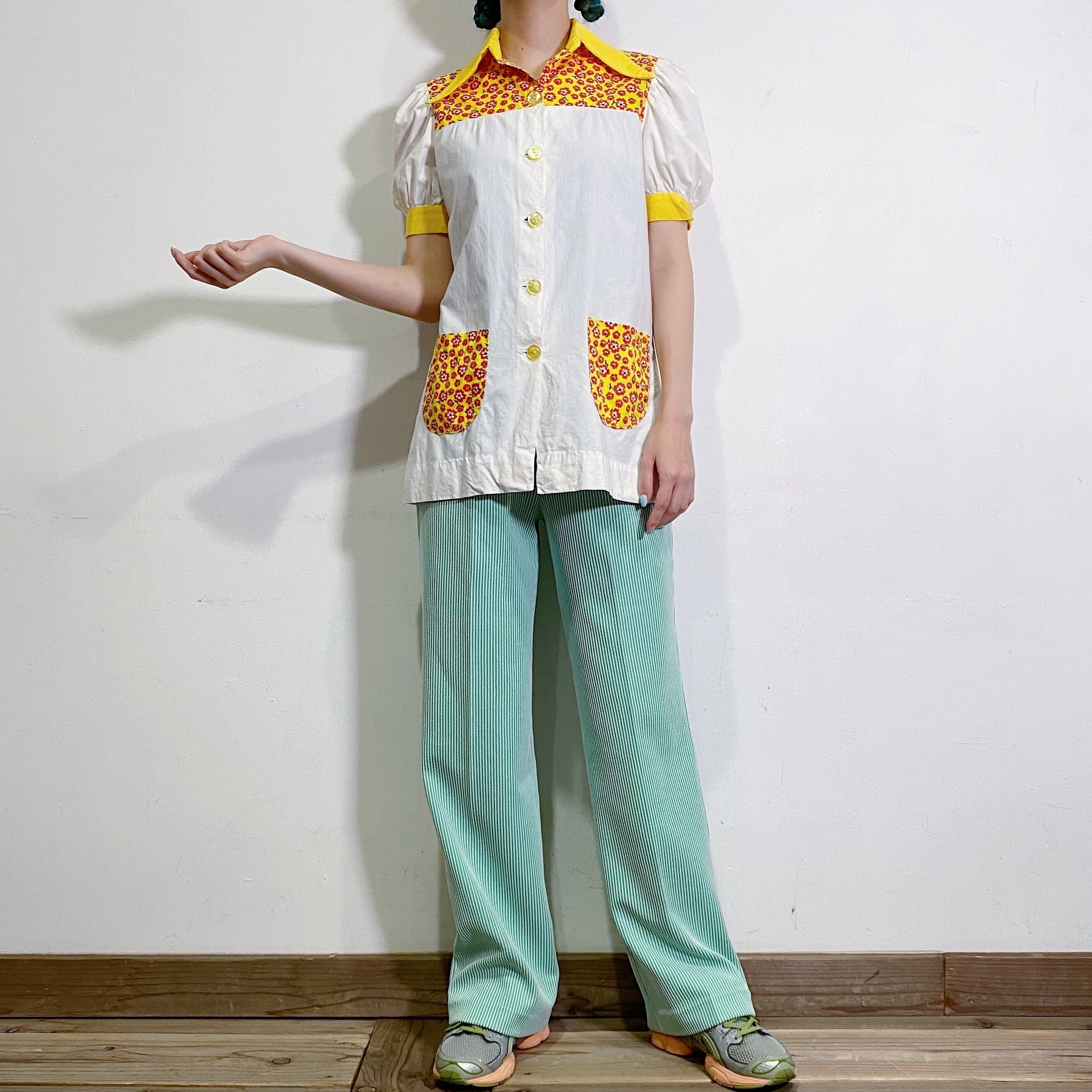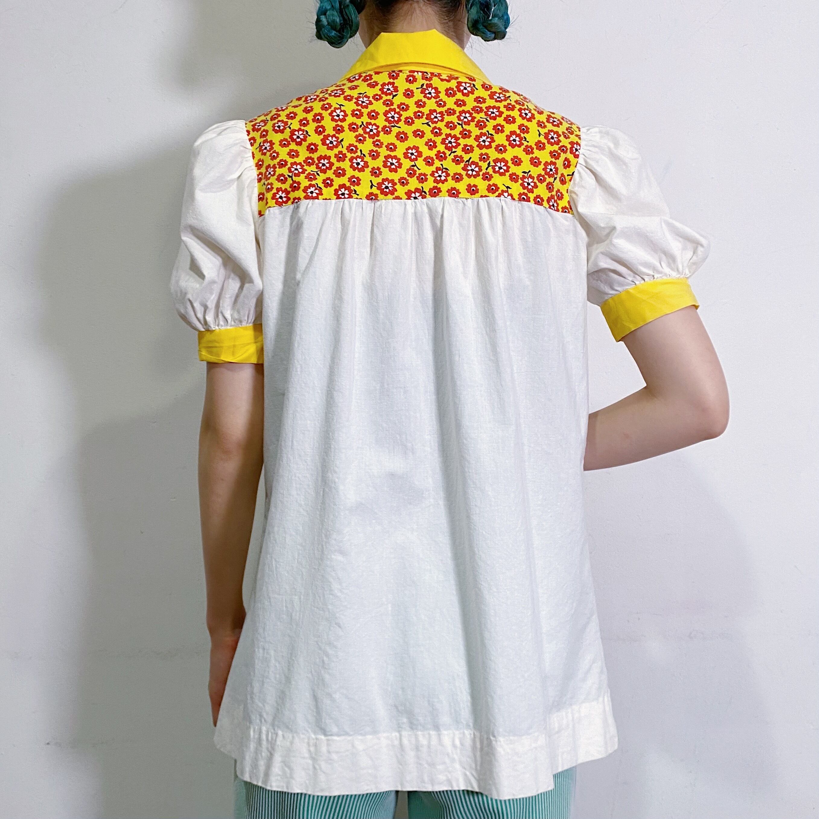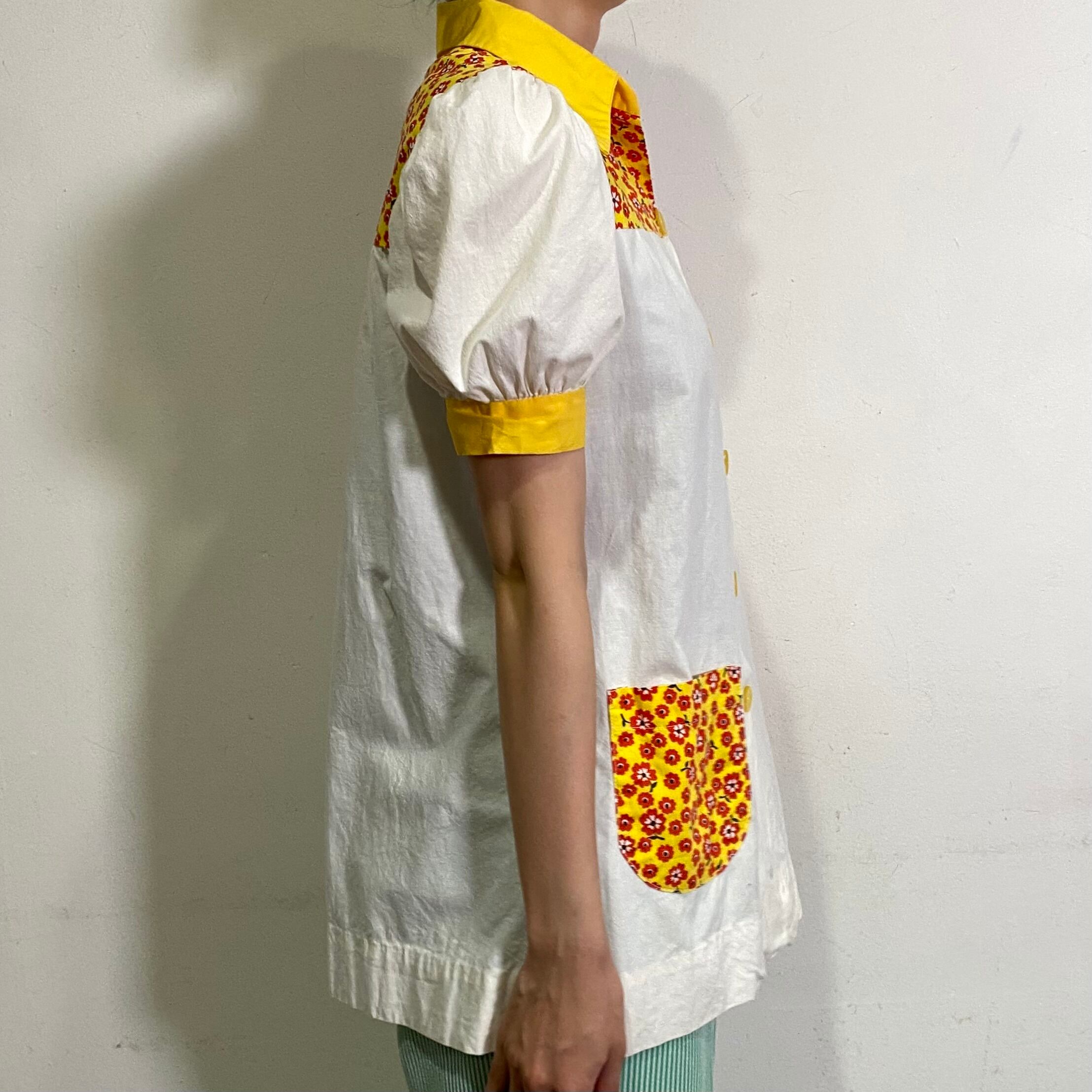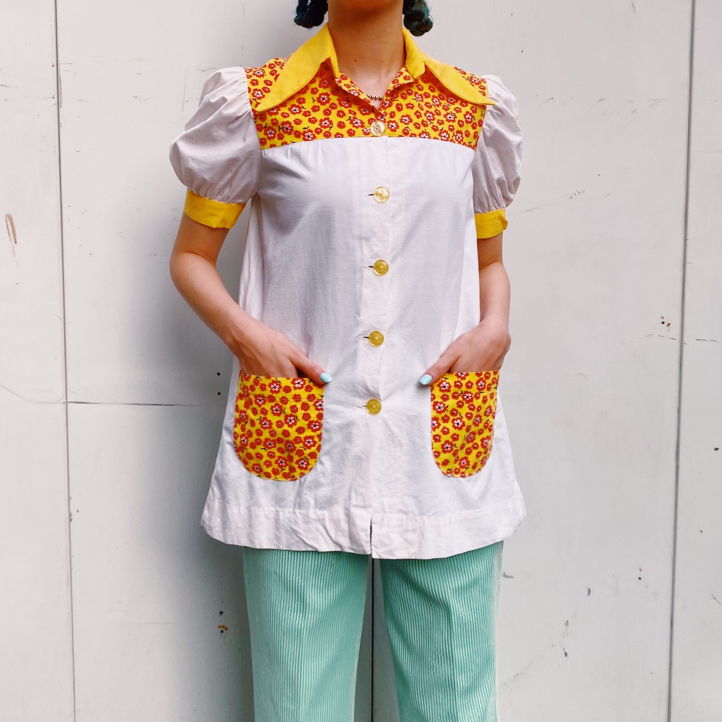 黄色に赤の花柄が可愛い、70年代の半袖シャツです。