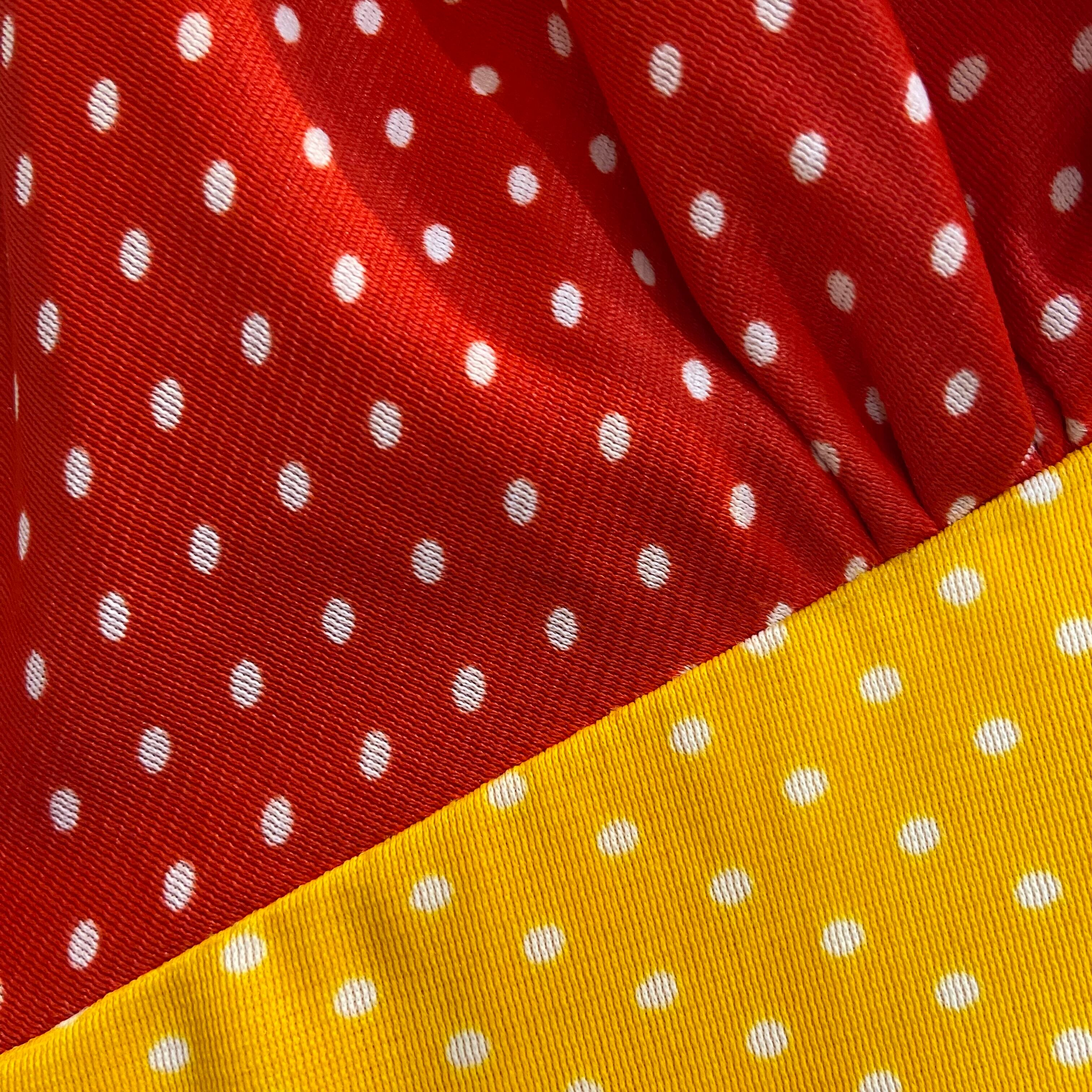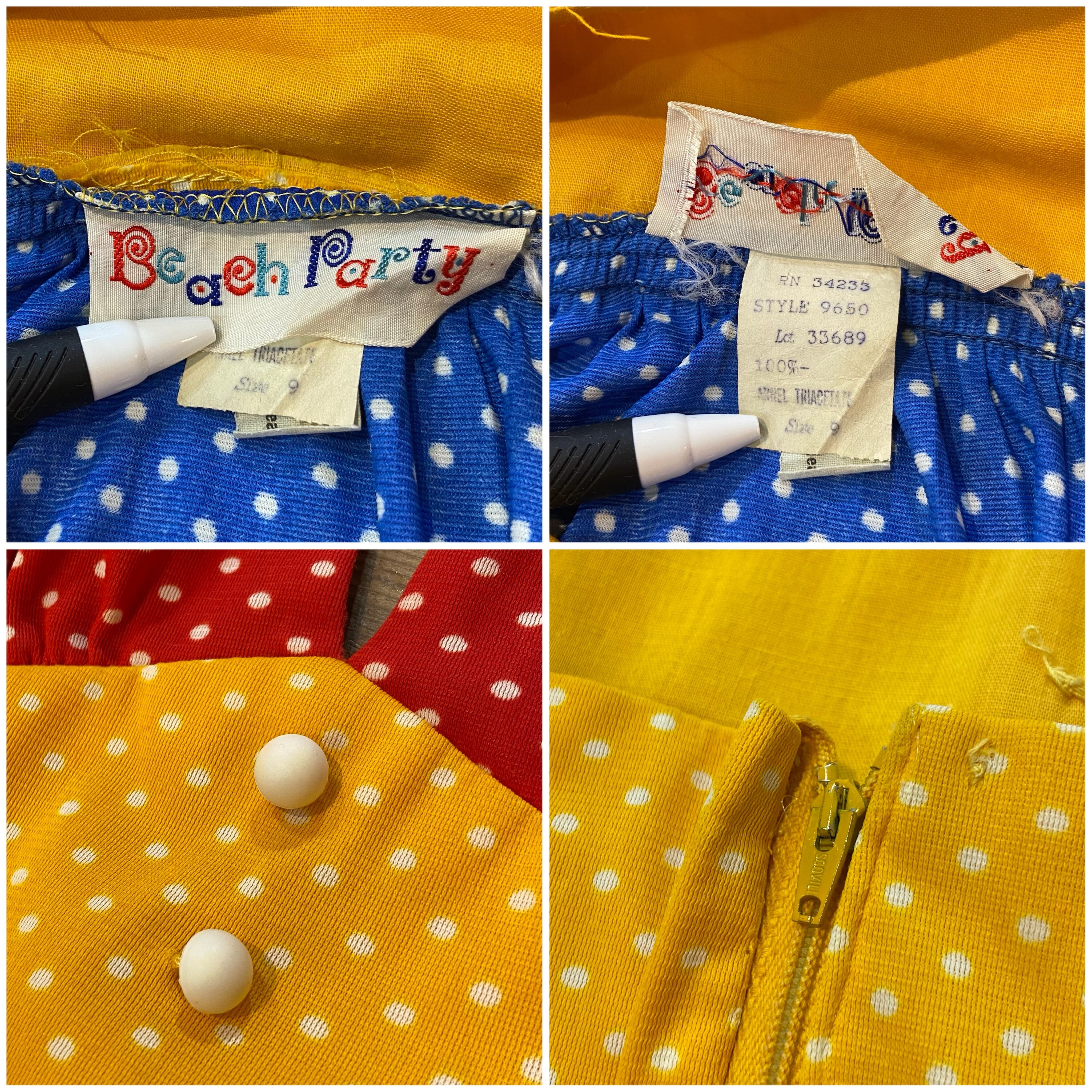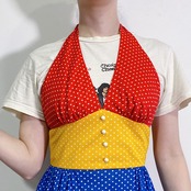レッド・イエロー・ブルー・グリーンの切り替えデザインが可愛い、70年代のホルターネックワンピースです。