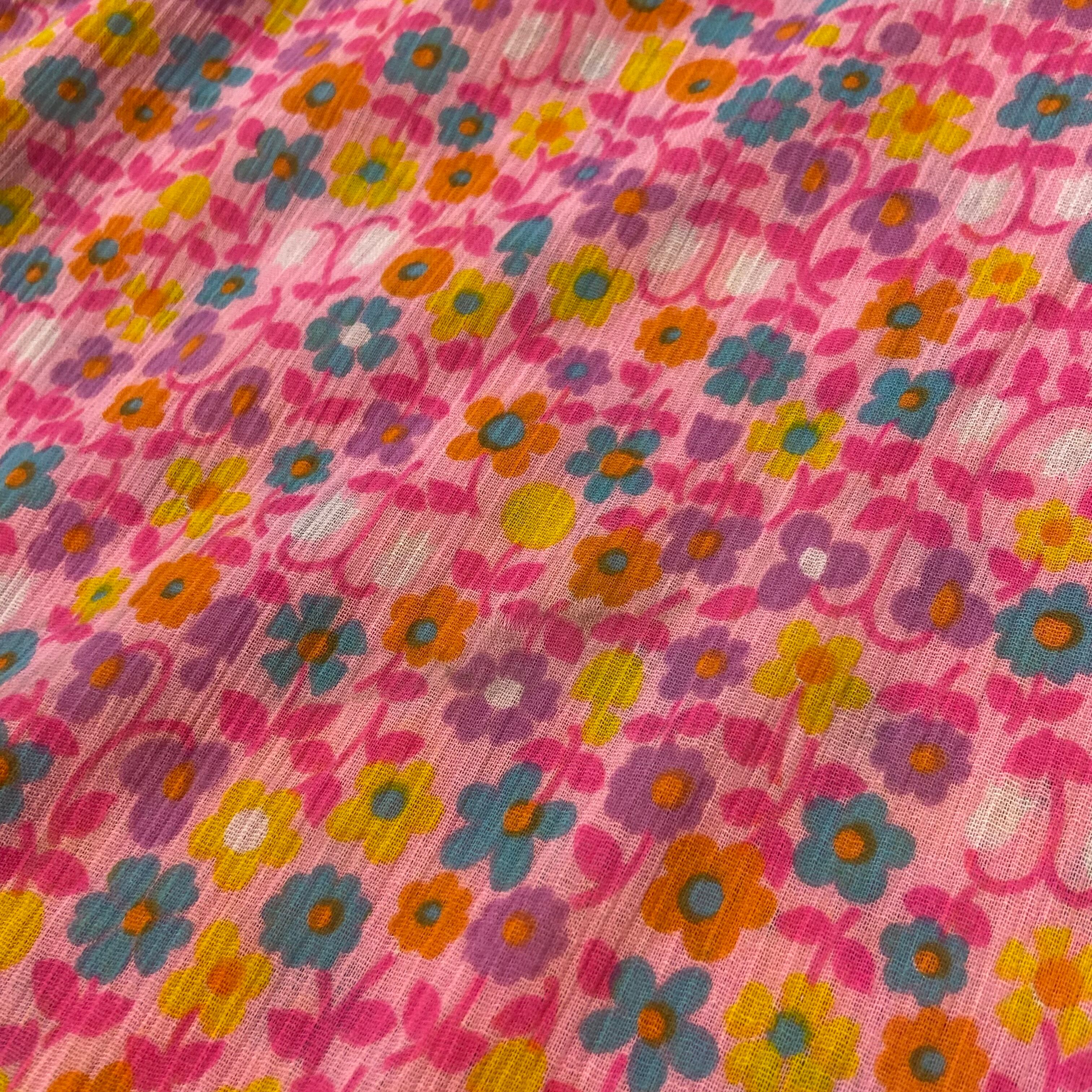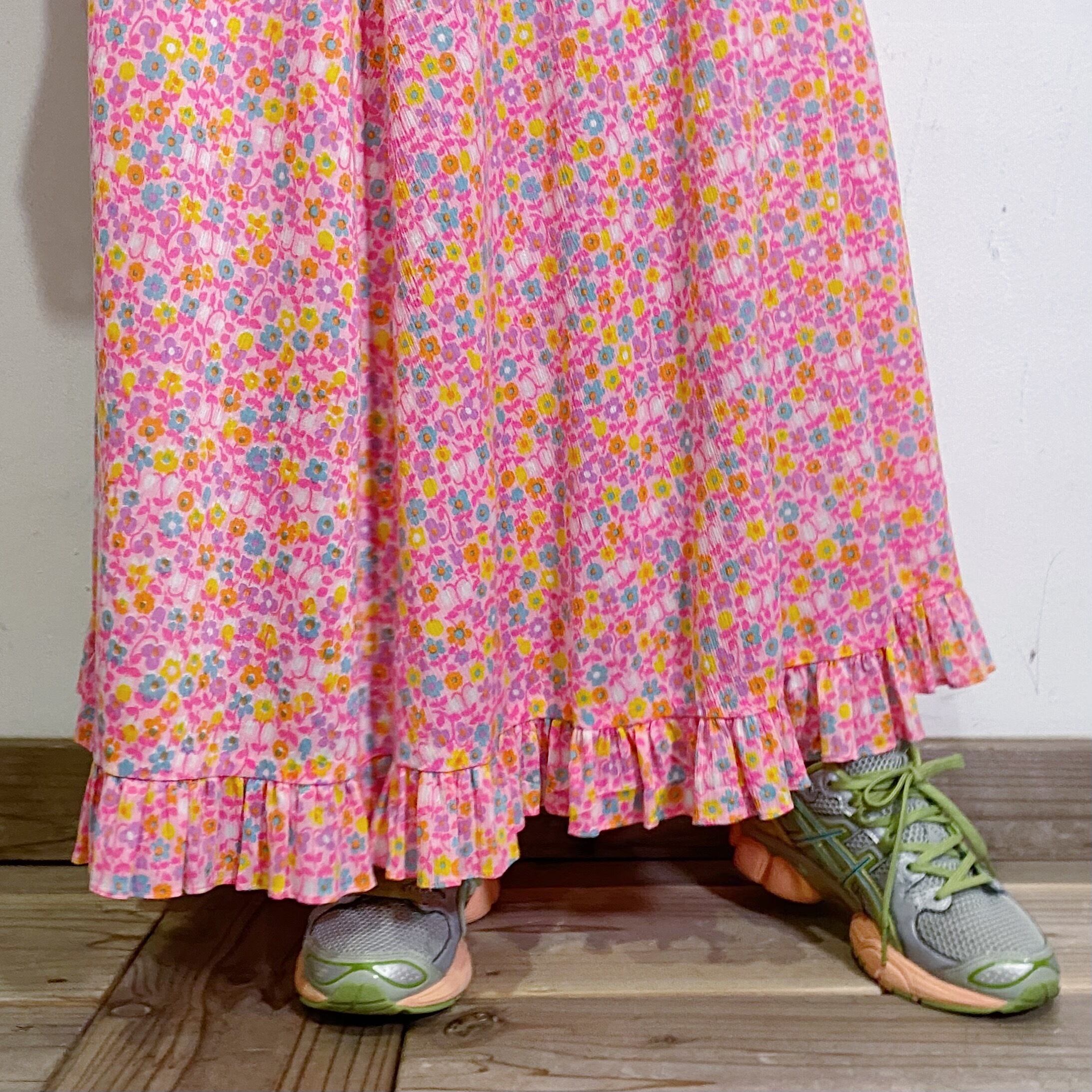 ピンクカラーにカラフルな小花柄がとってもハッピーで可愛い、70年代のロングワンピースです。