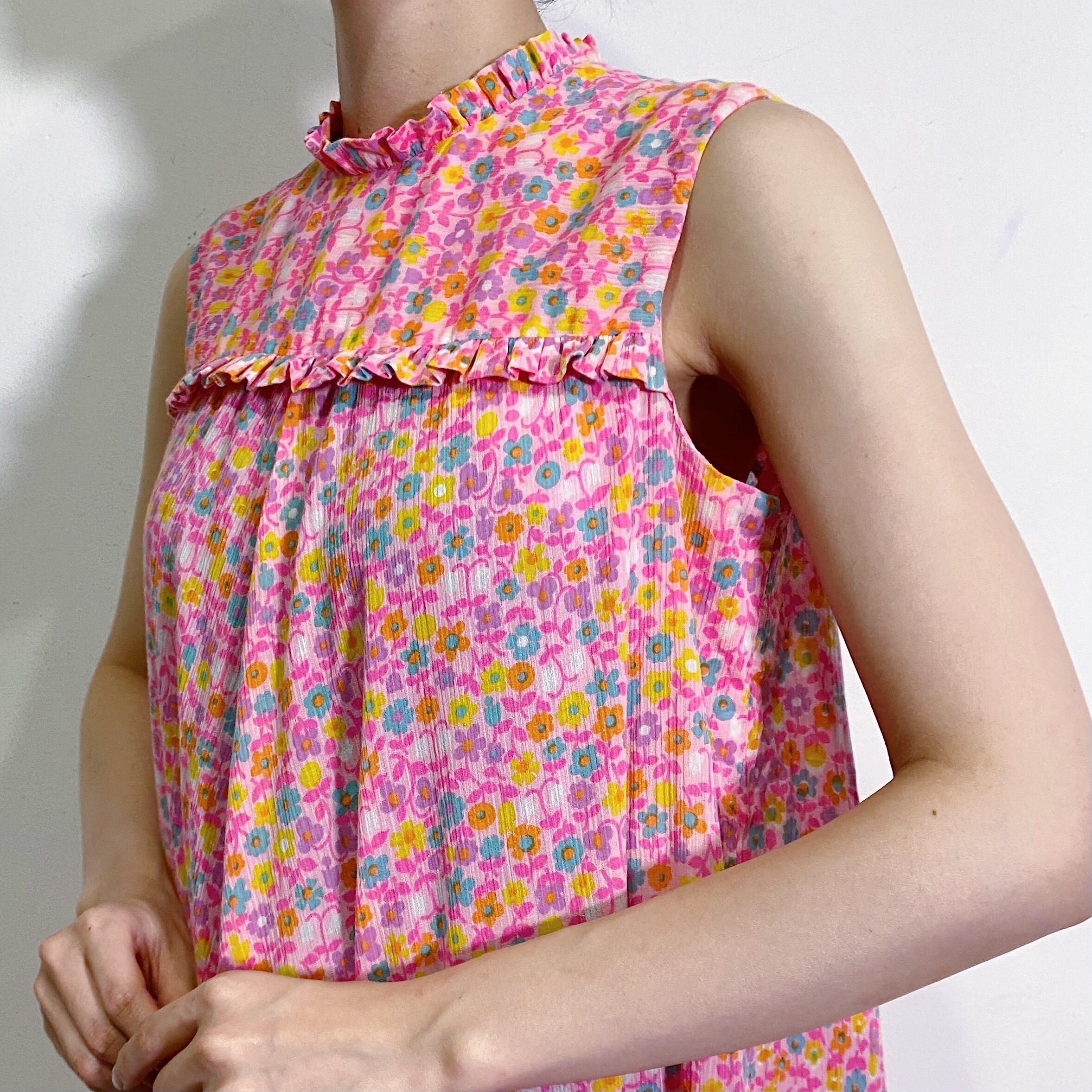 70s pink flower printed sleeveless dress