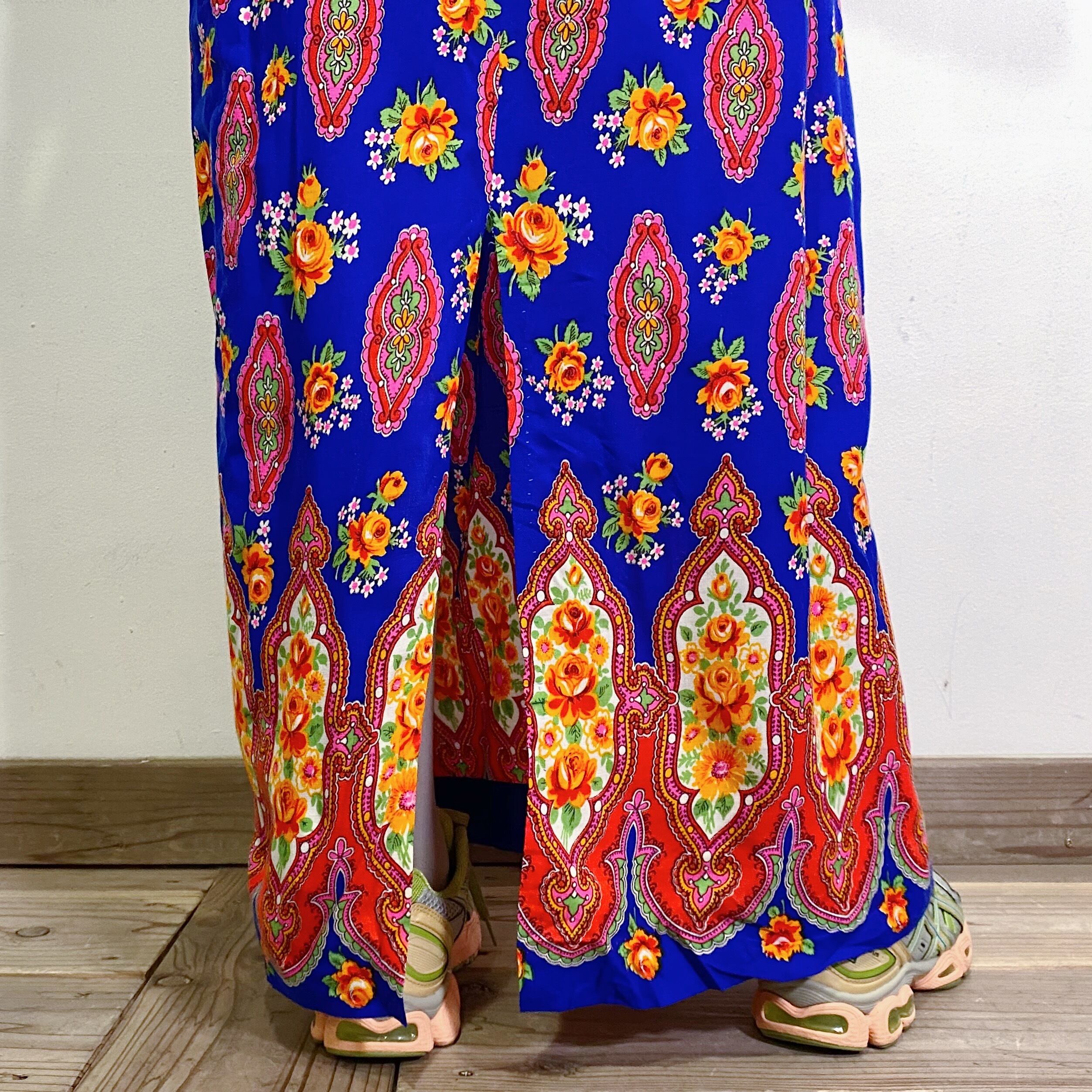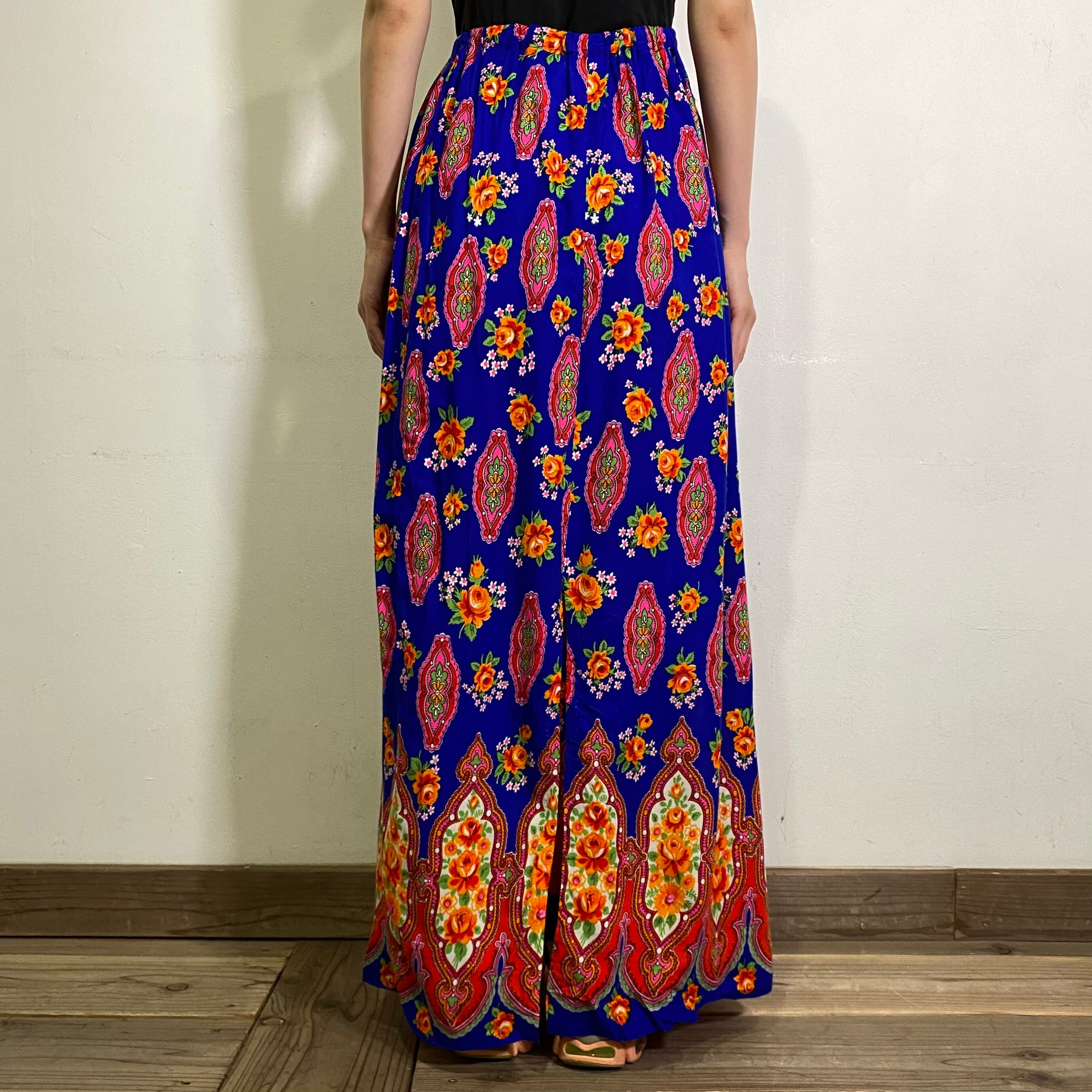ブルーベースにピンクやオレンジの鮮やかな色合いがとても可愛い、70年代のロングスカートです。