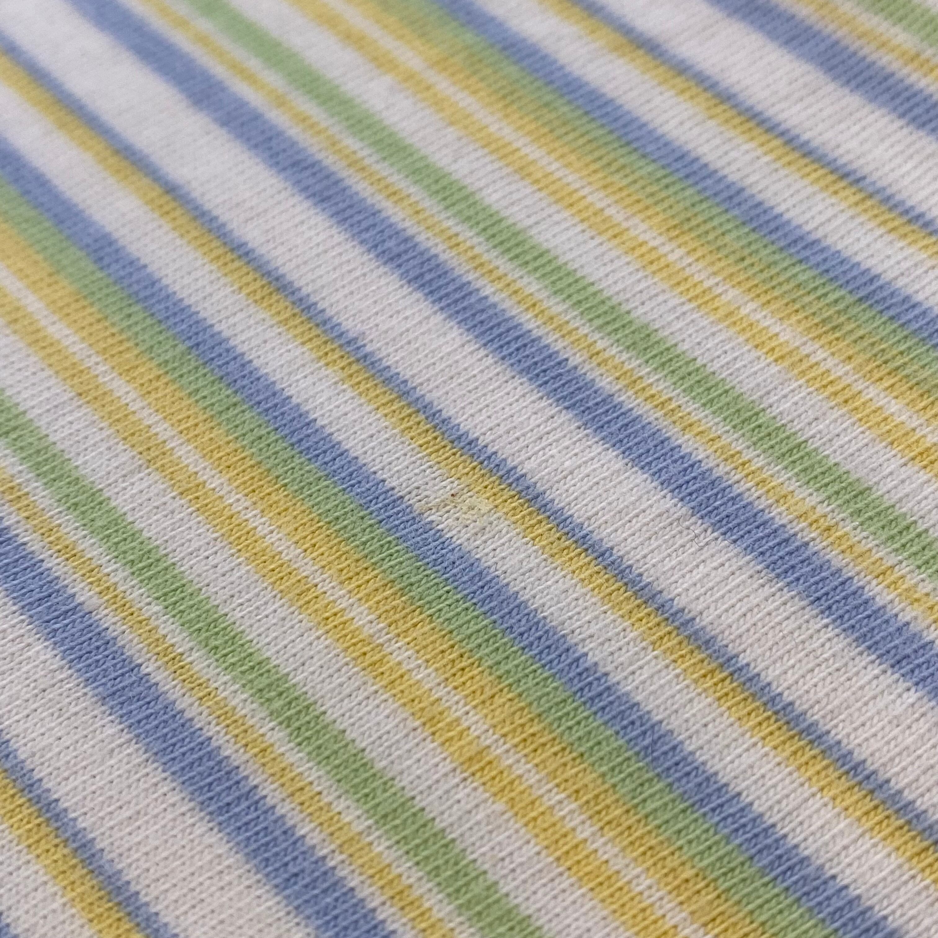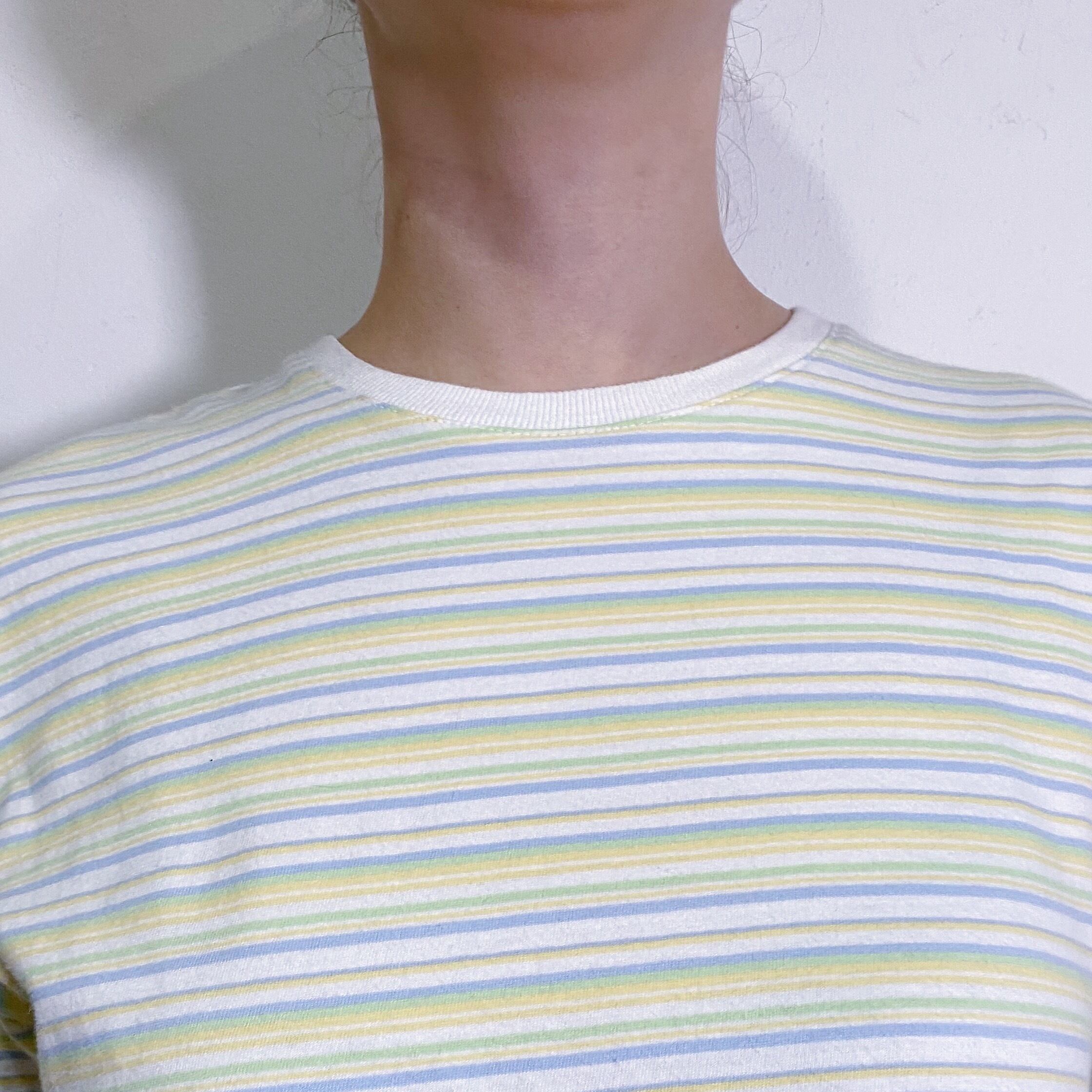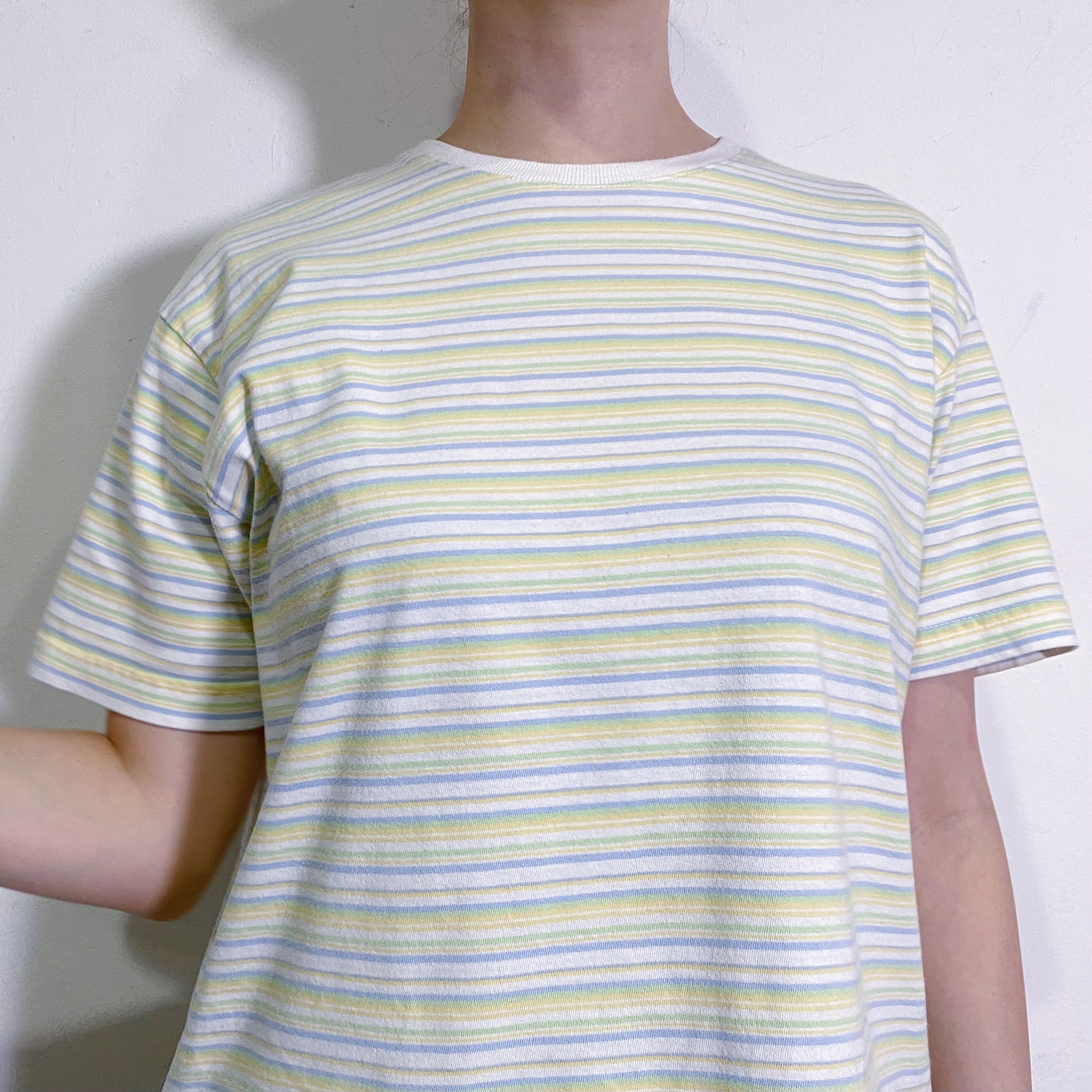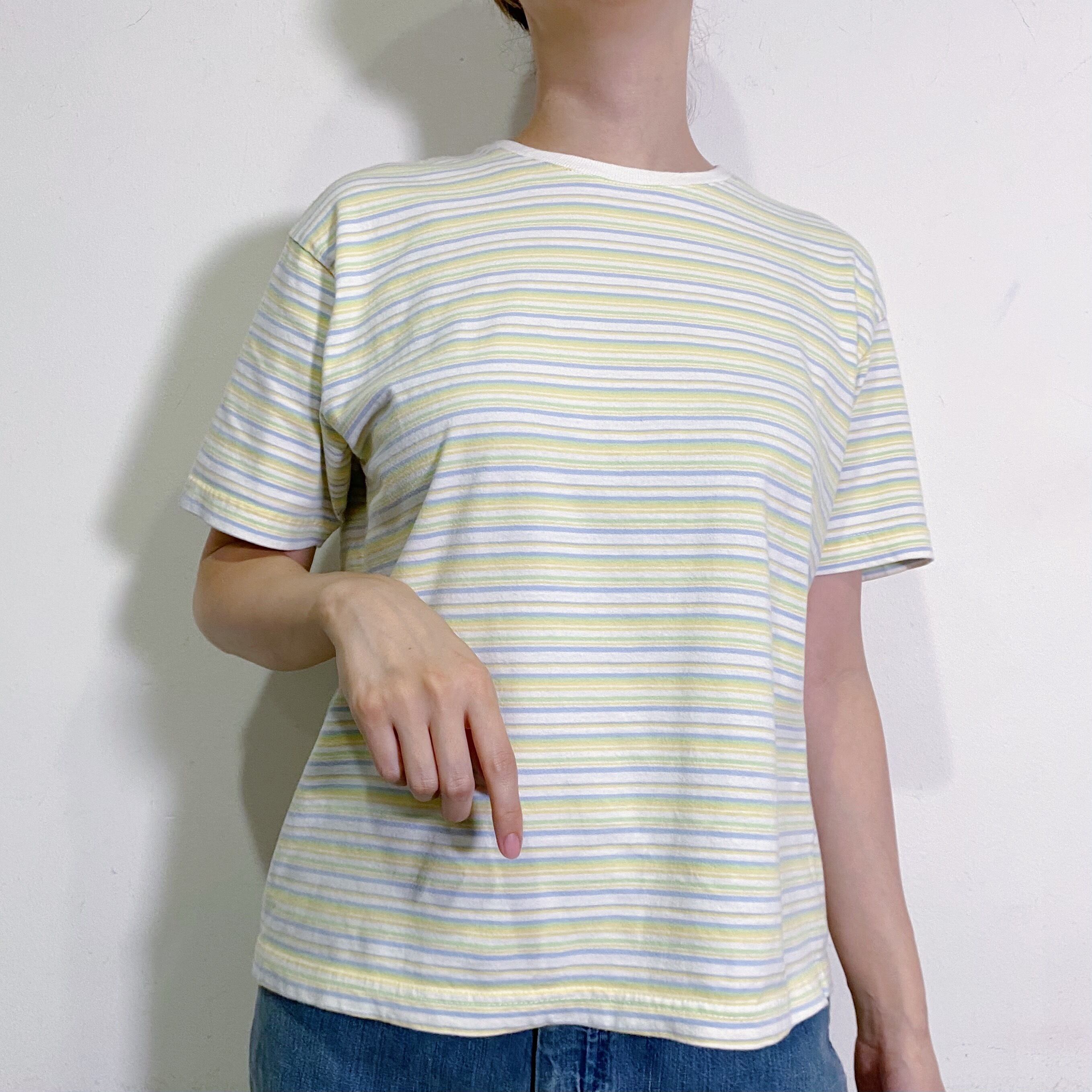 イエローやブルーなどの淡い色合いのストライプが可愛い、Tシャツです。