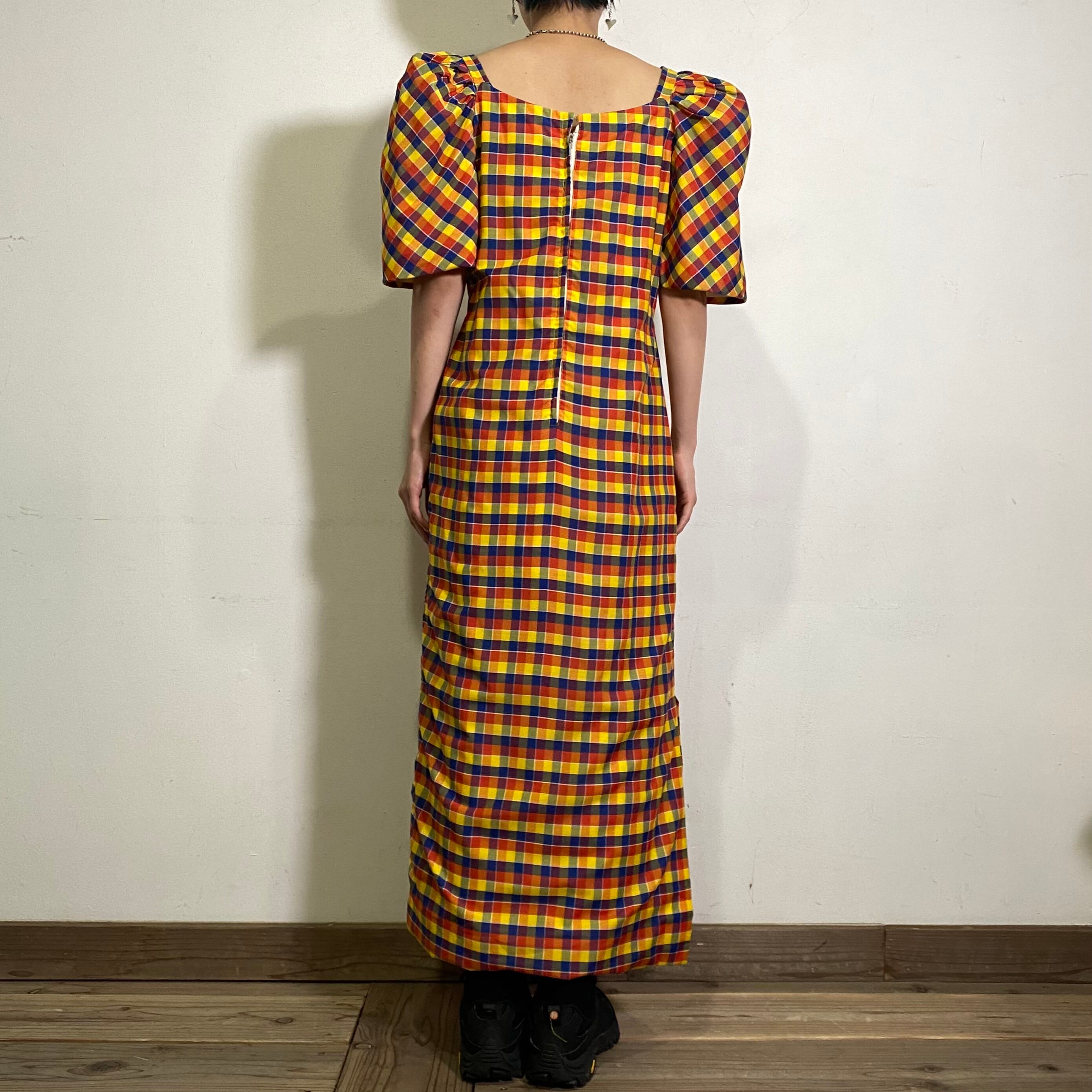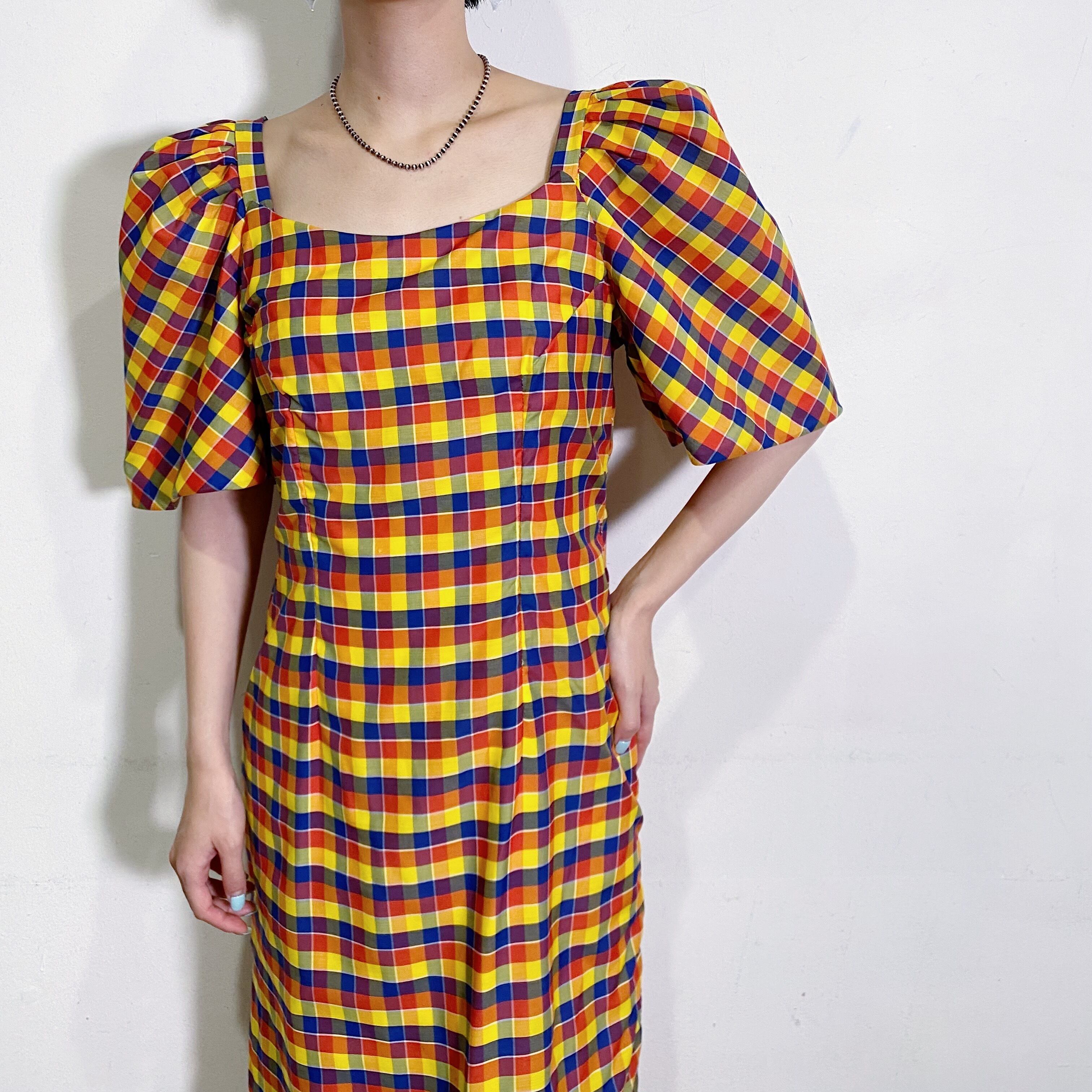 レッド・イエロー・ブルーのレインボーチェックが最高に可愛い、70年代頃のワンピースです。
