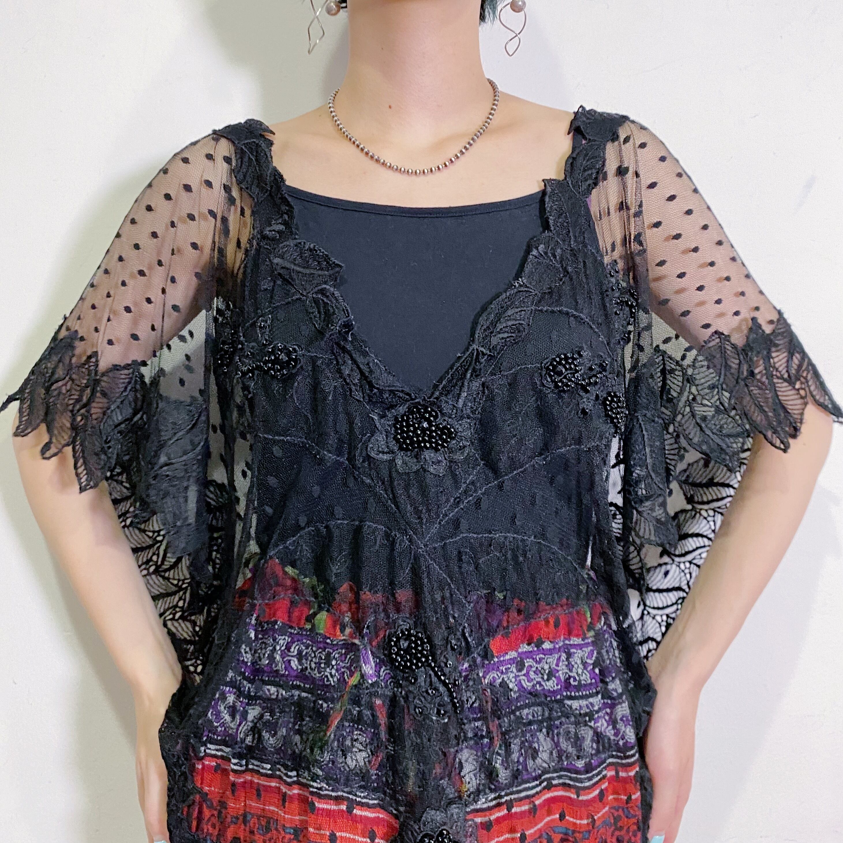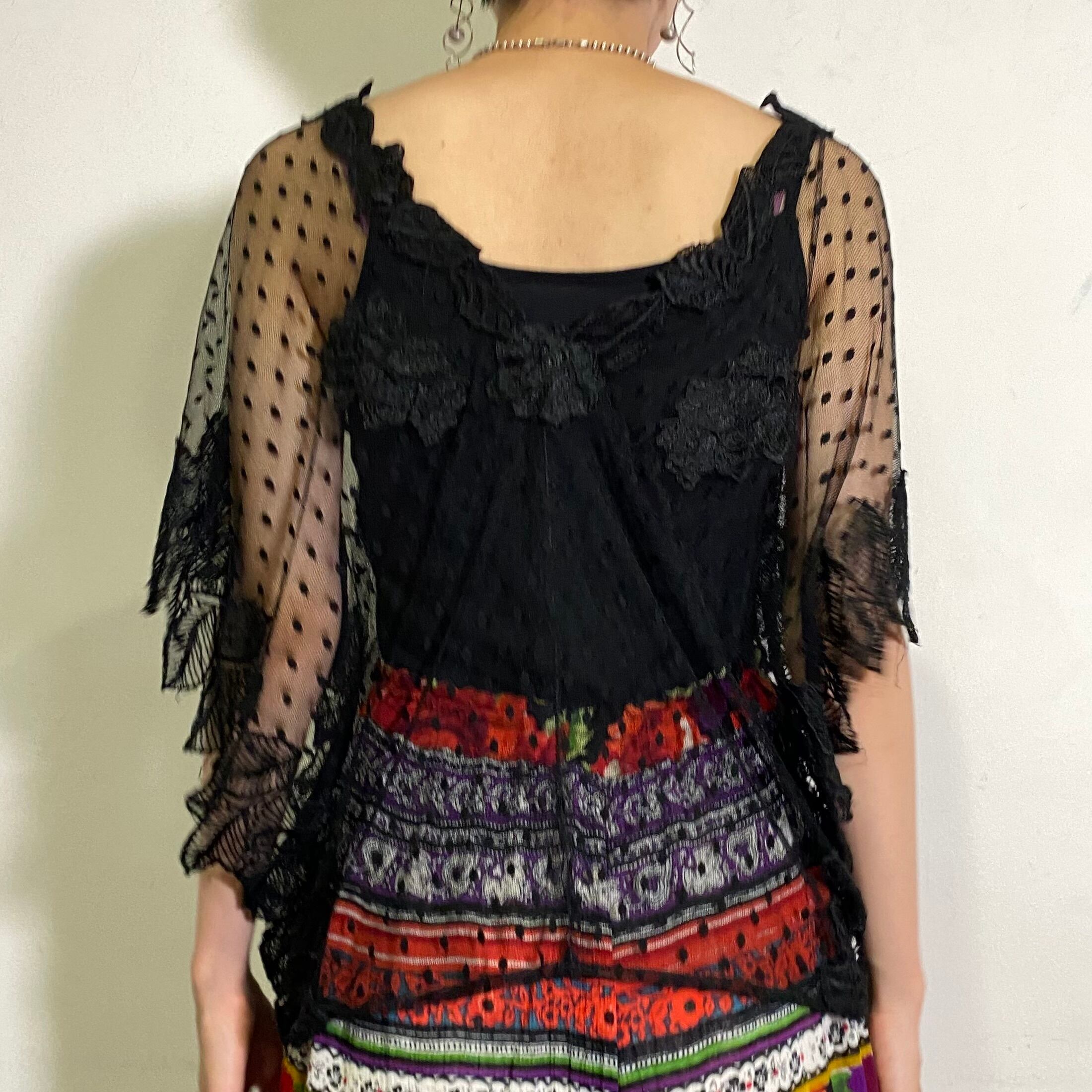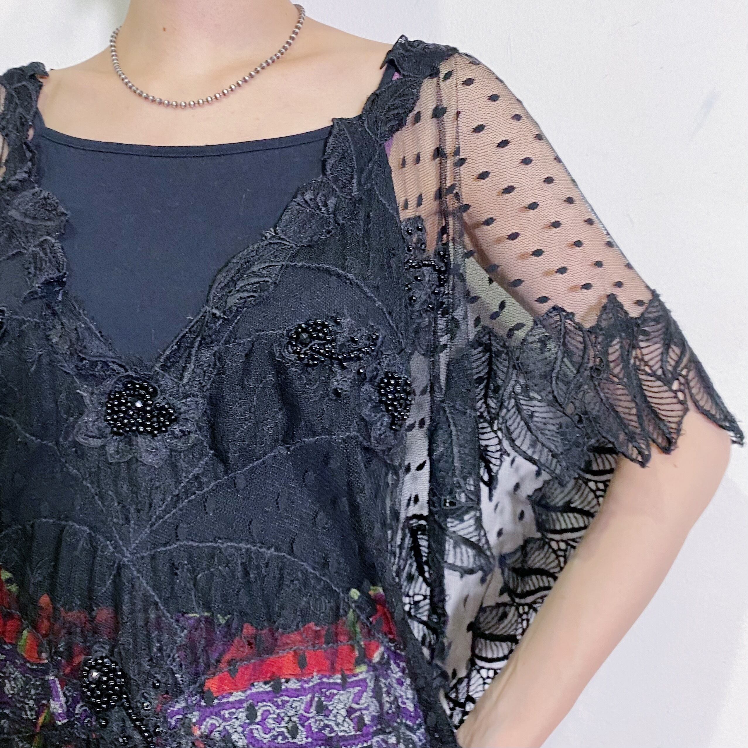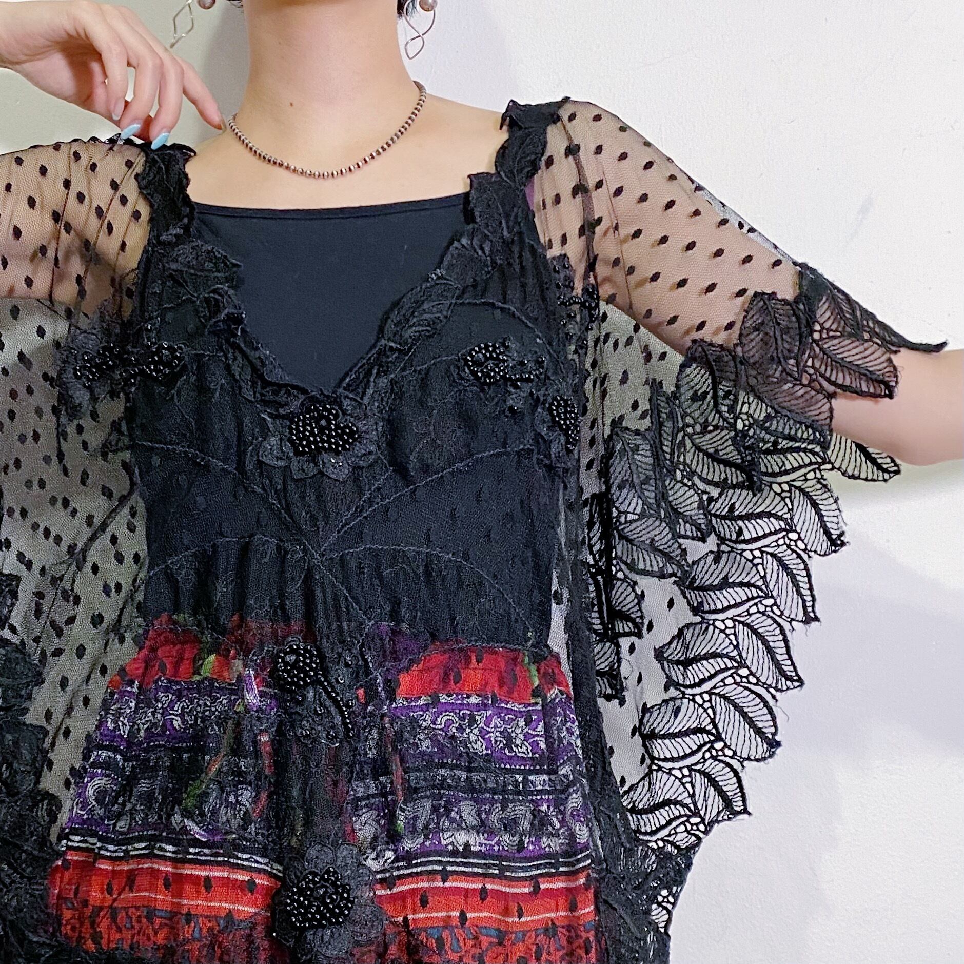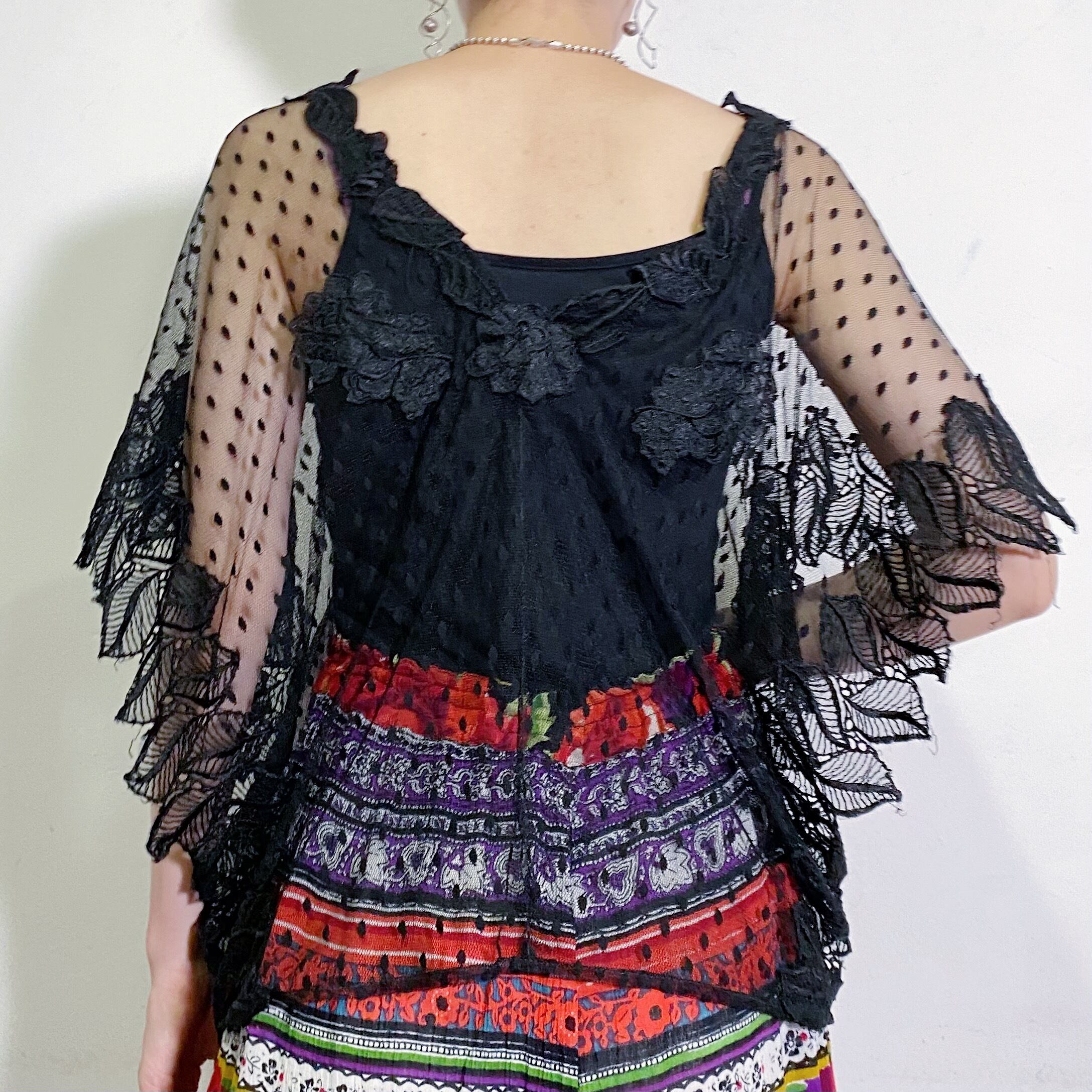 オールブラックカラーのドットと葉っぱの総レースのデザインが素敵な、80年代のトップスです。
