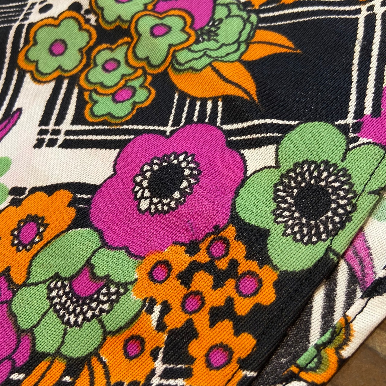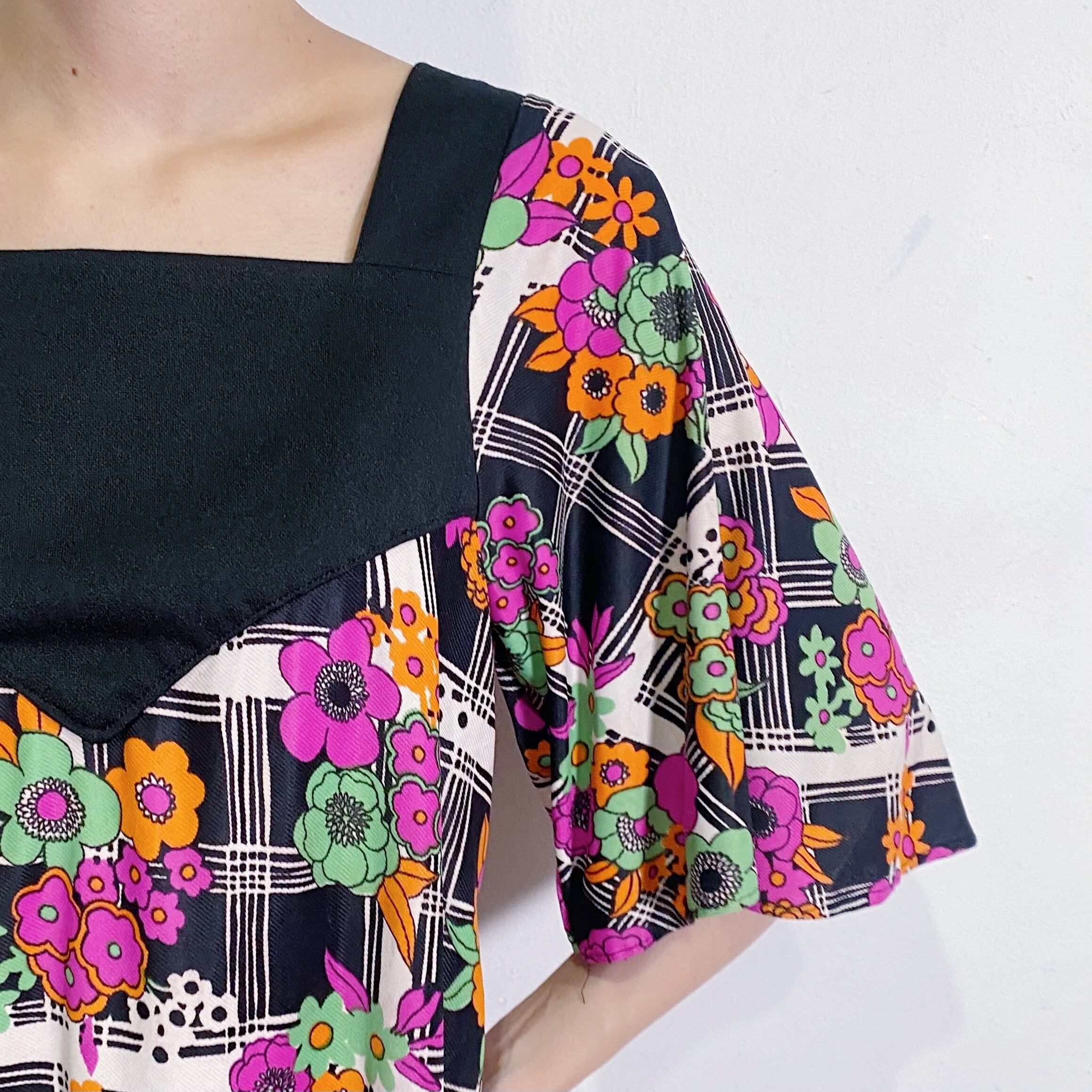 チェックと花柄の組み合わせがレトロ可愛い、70年代のワンピースです。