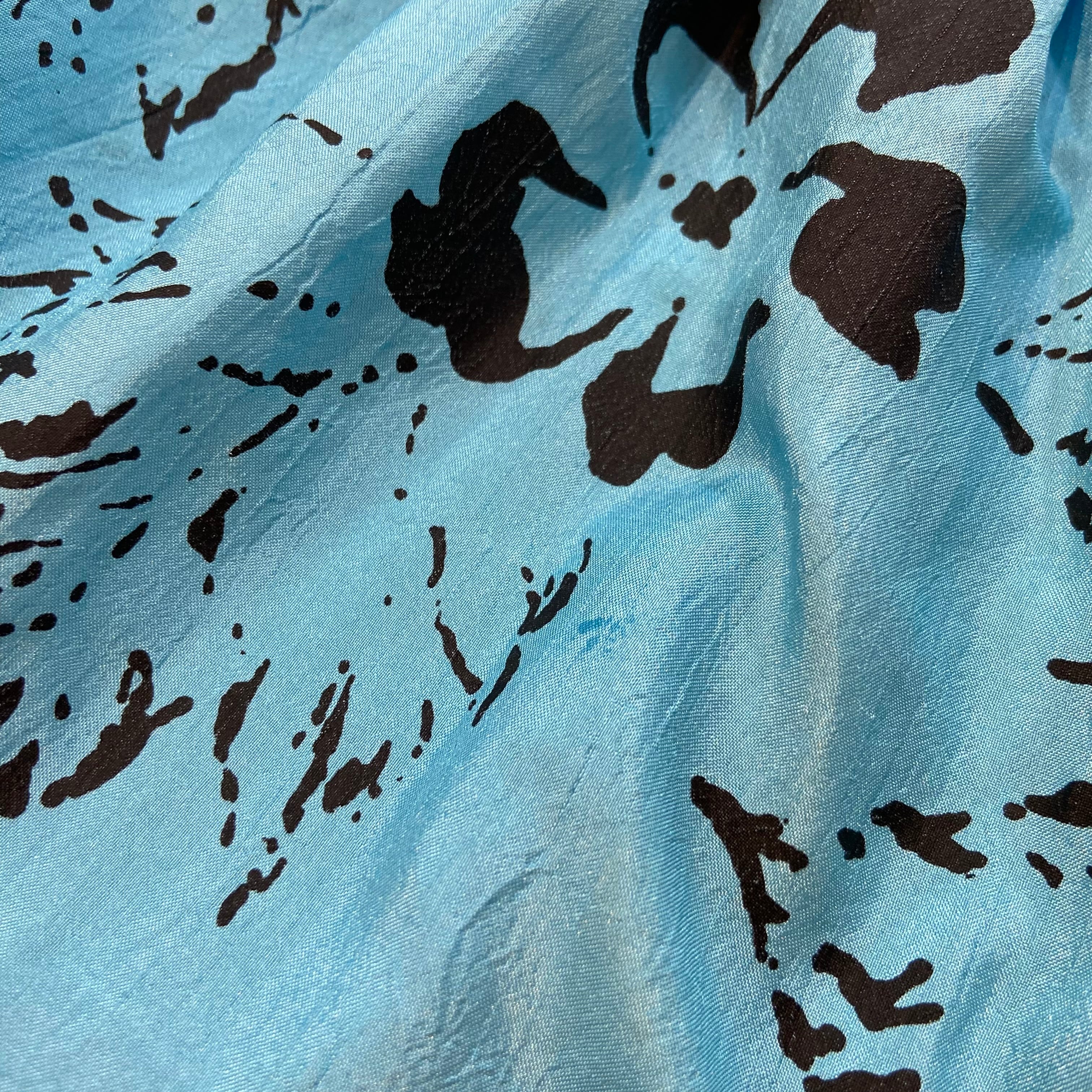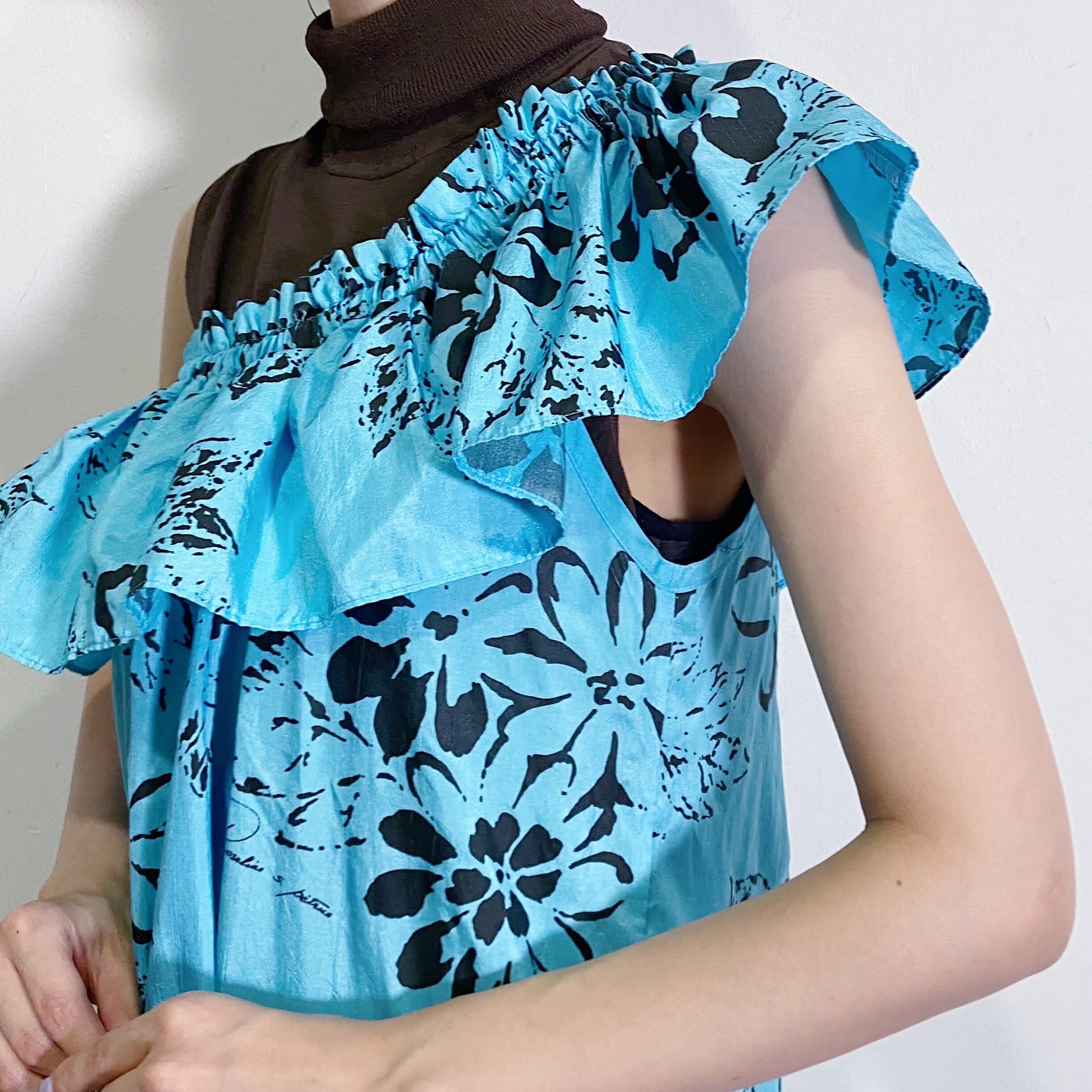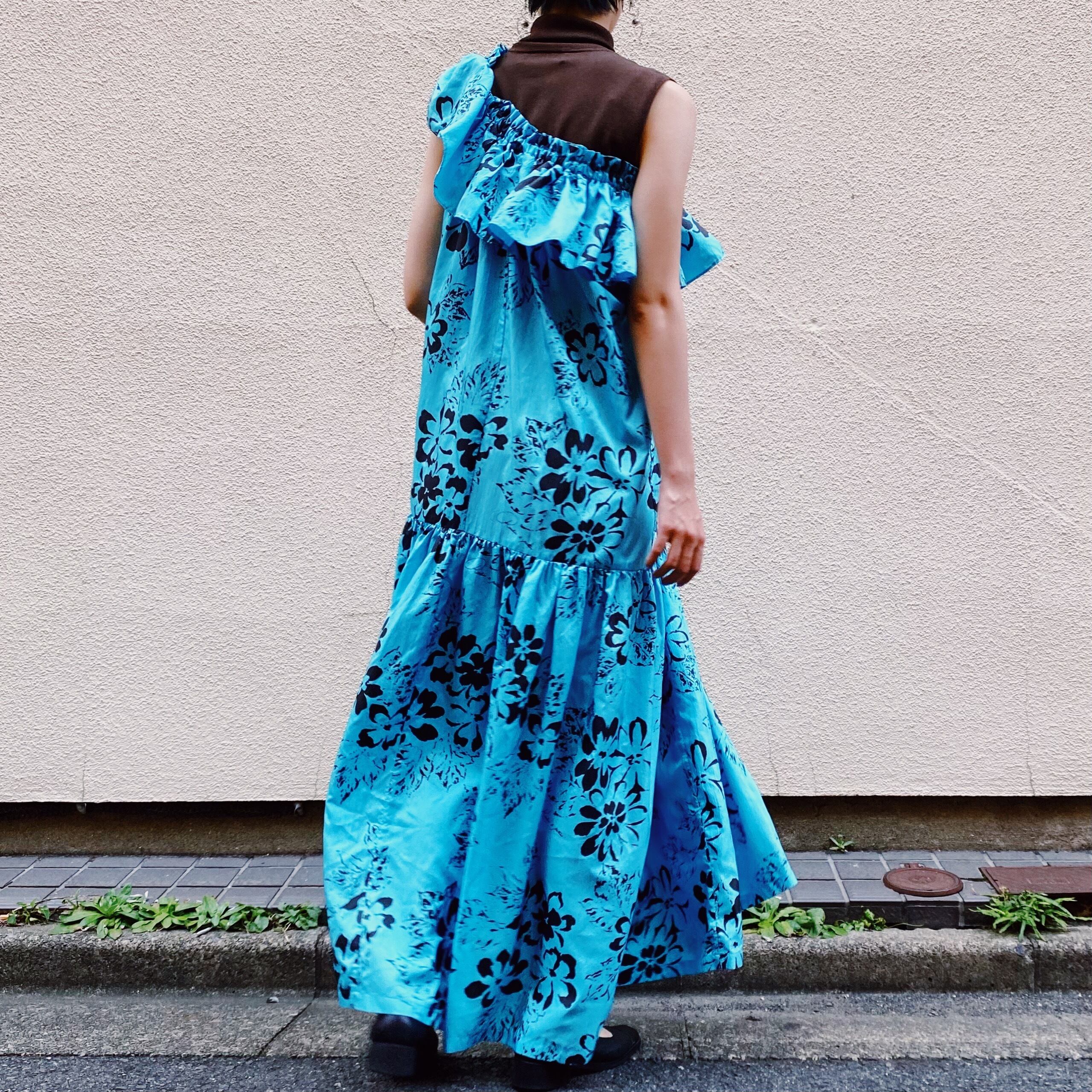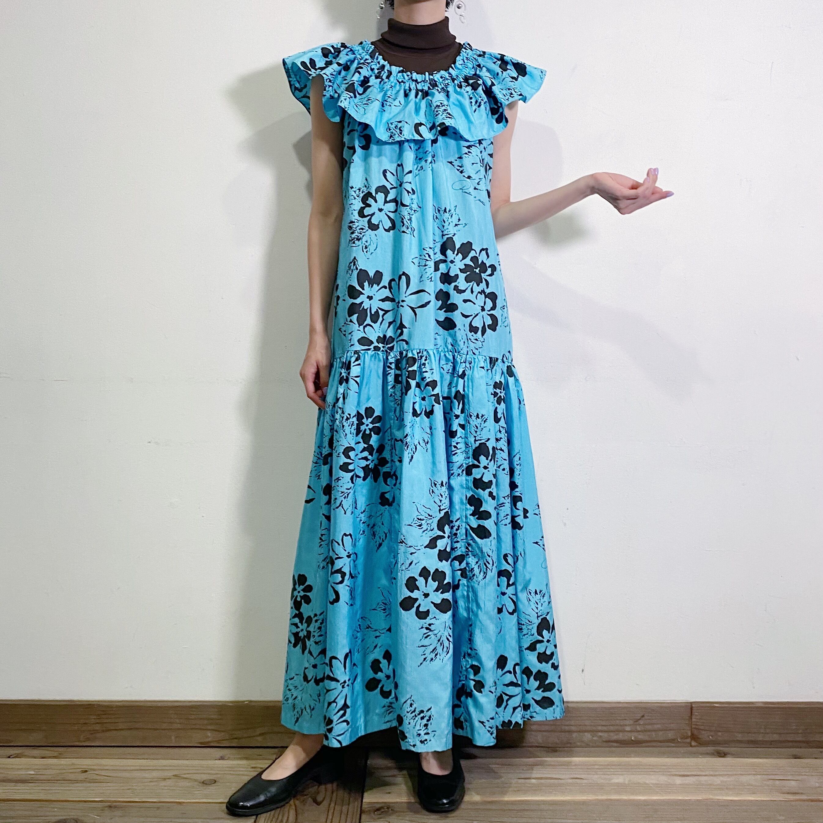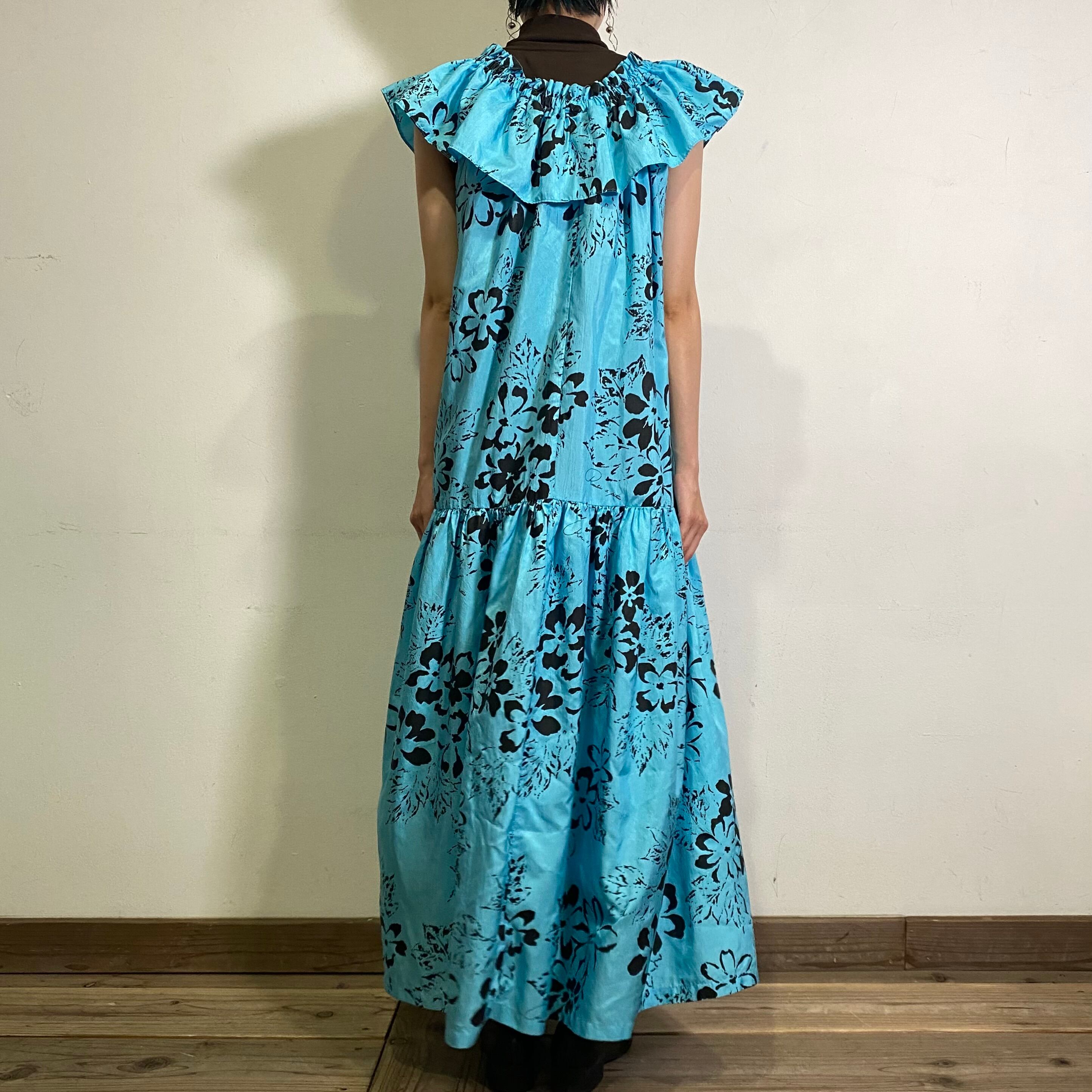 サックスブルーカラーにブラックカラーのお花のペイントのような柄が可愛い、70年代のロングワンピースです。