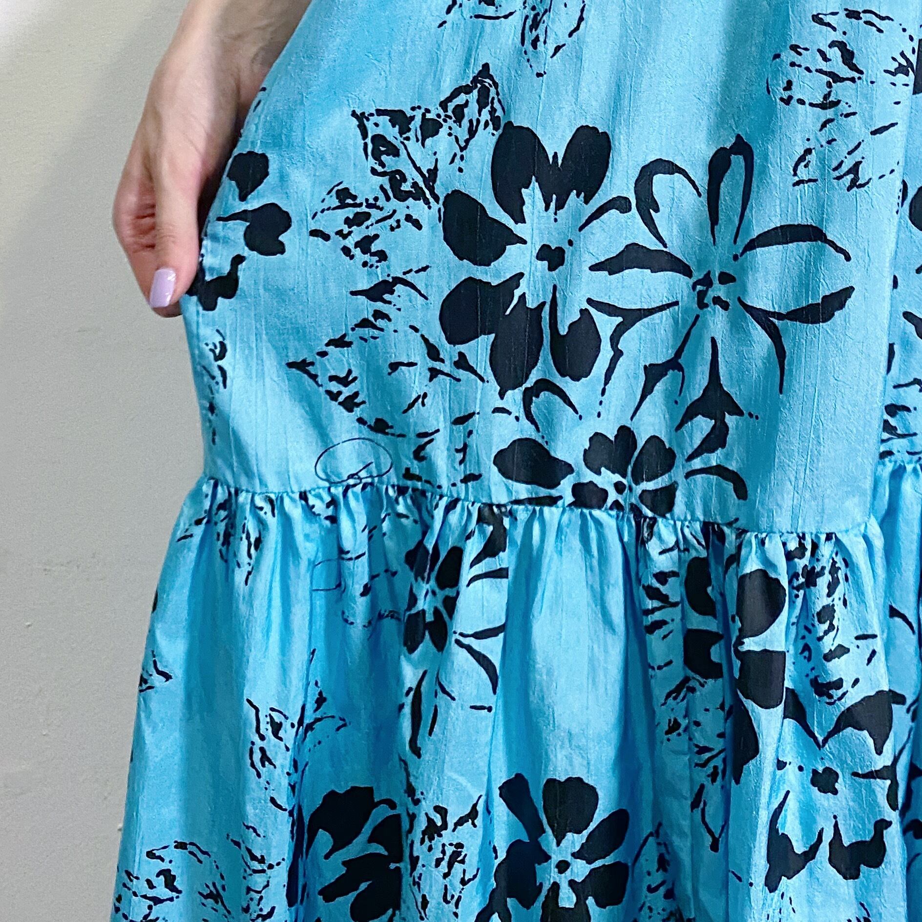 70s sax blur and black flower printed long Hawaiian dress