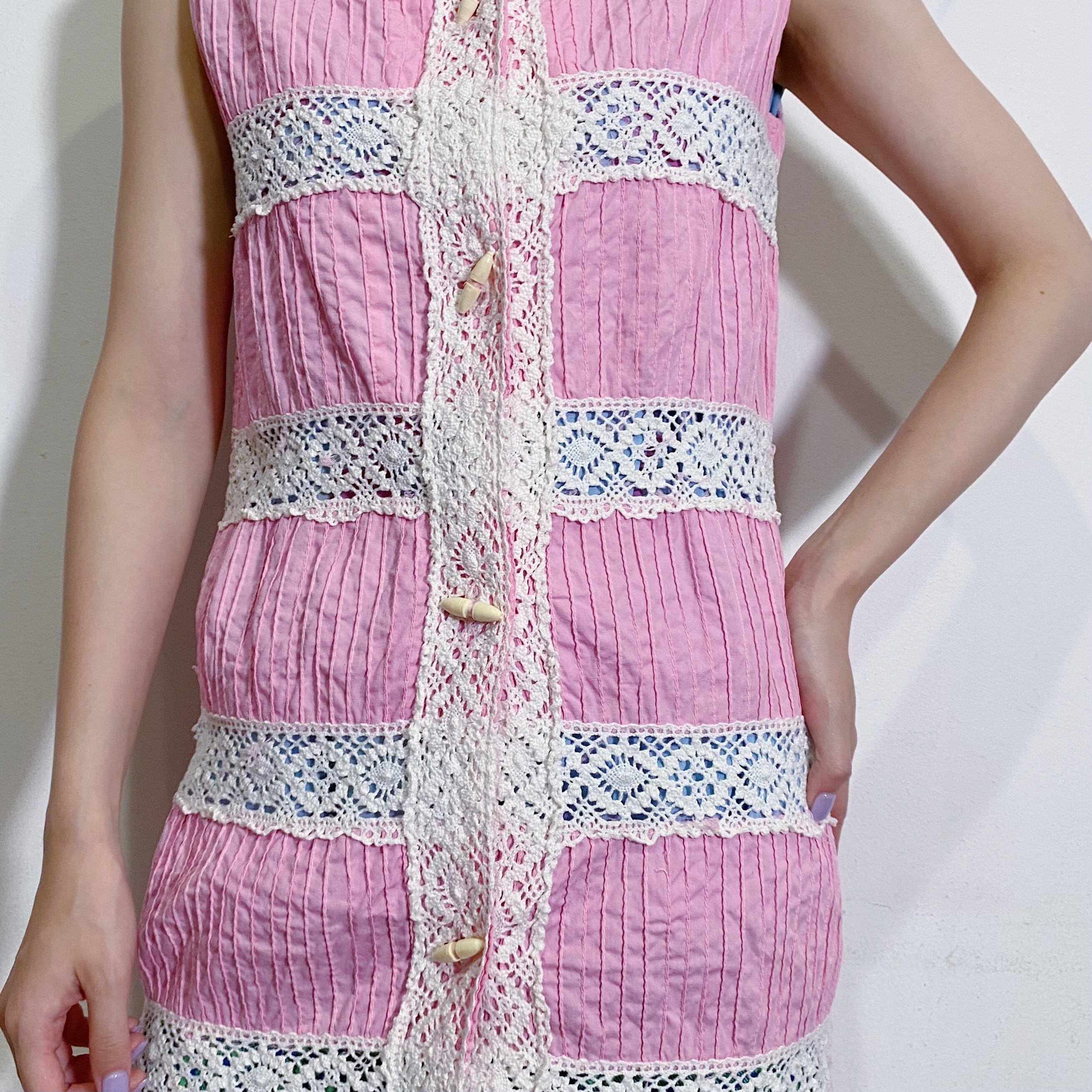 ピンクカラーとホワイトクロシェの組み合わせが可愛い、70年代のメキシカンミニワンピースです。