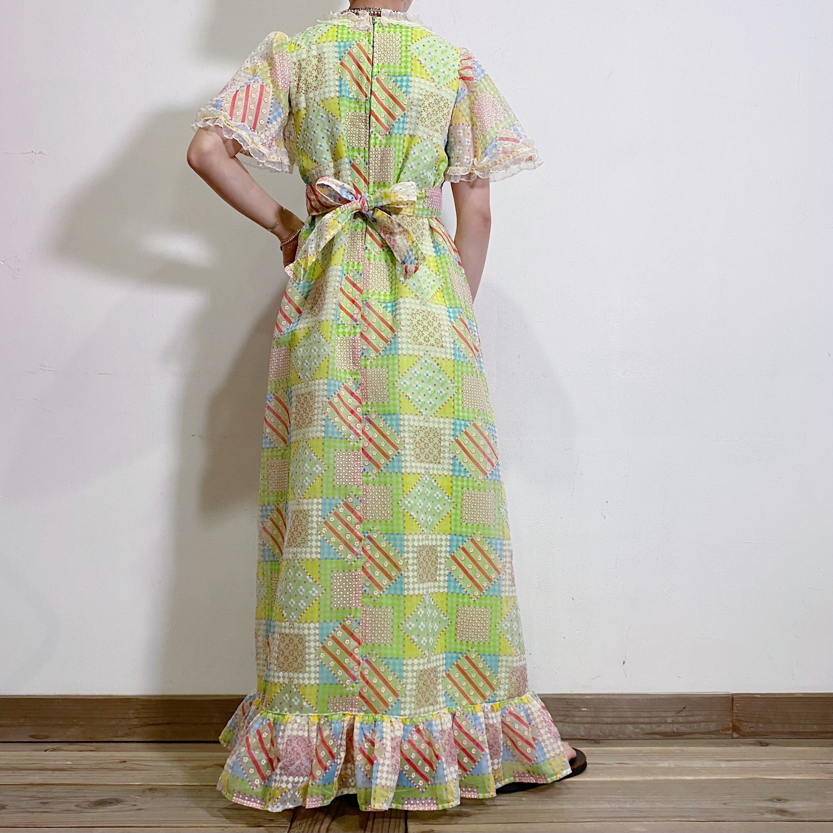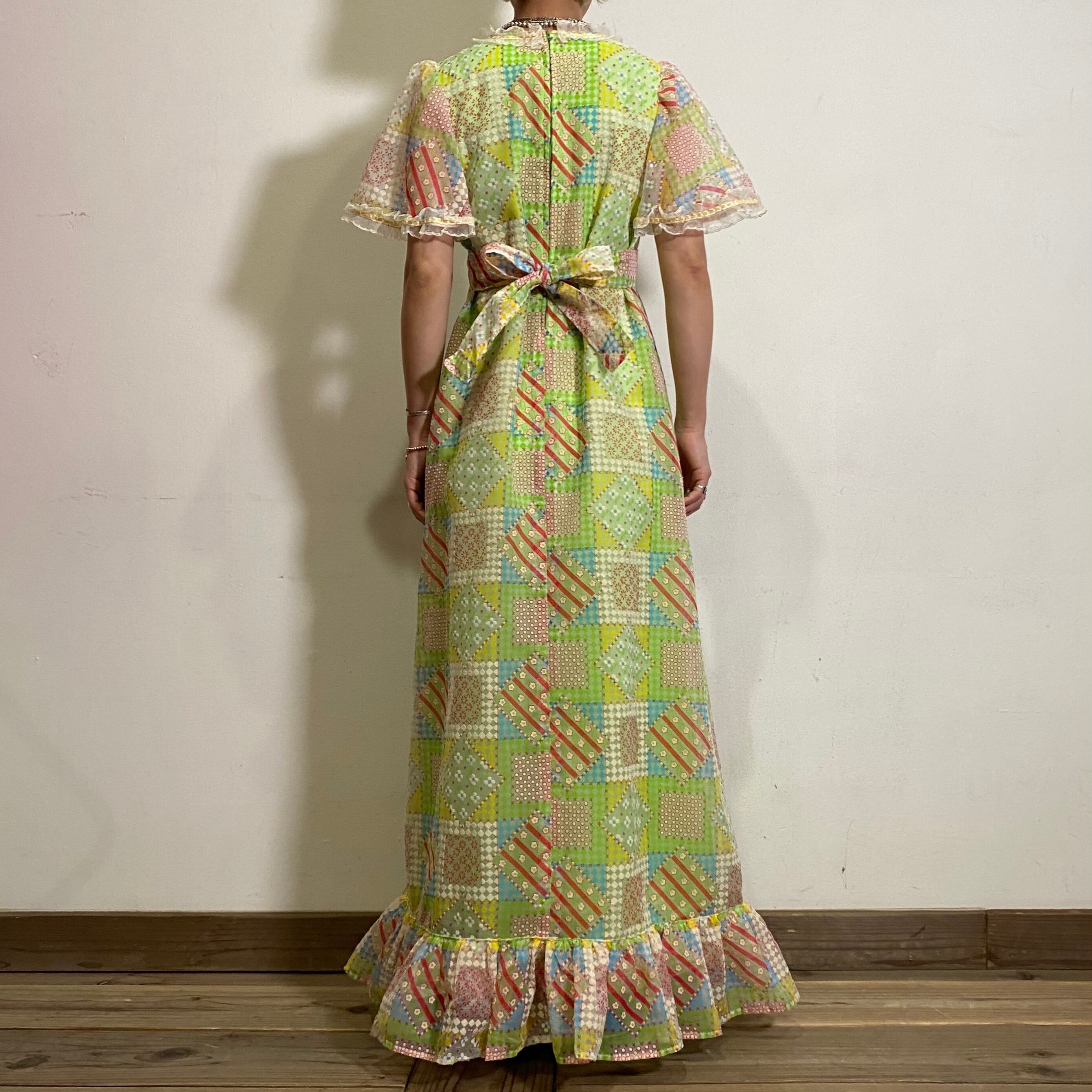 カラフルでハッピーな色合いのパッチワークプリントがとても可愛い、70年代のロングワンピースです。