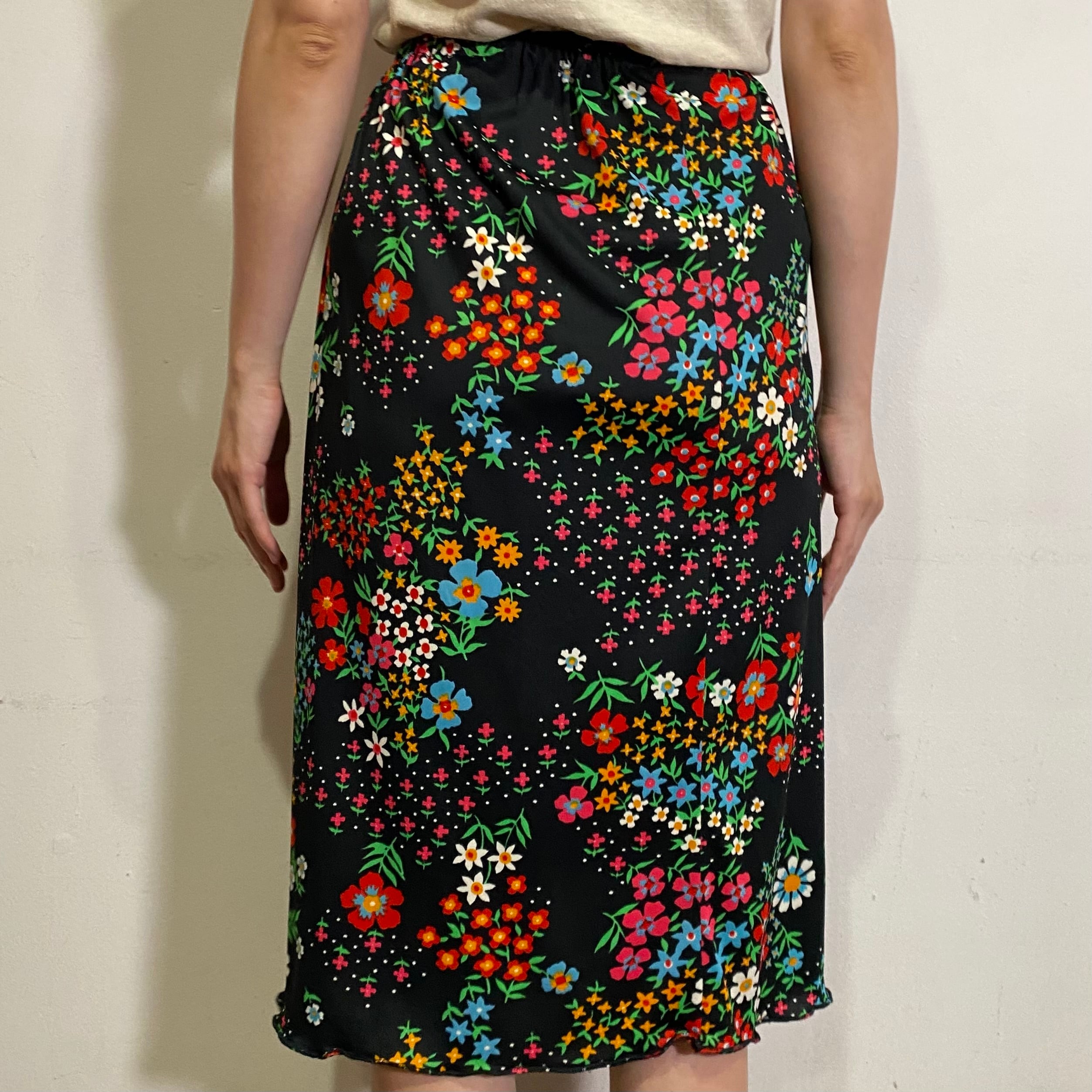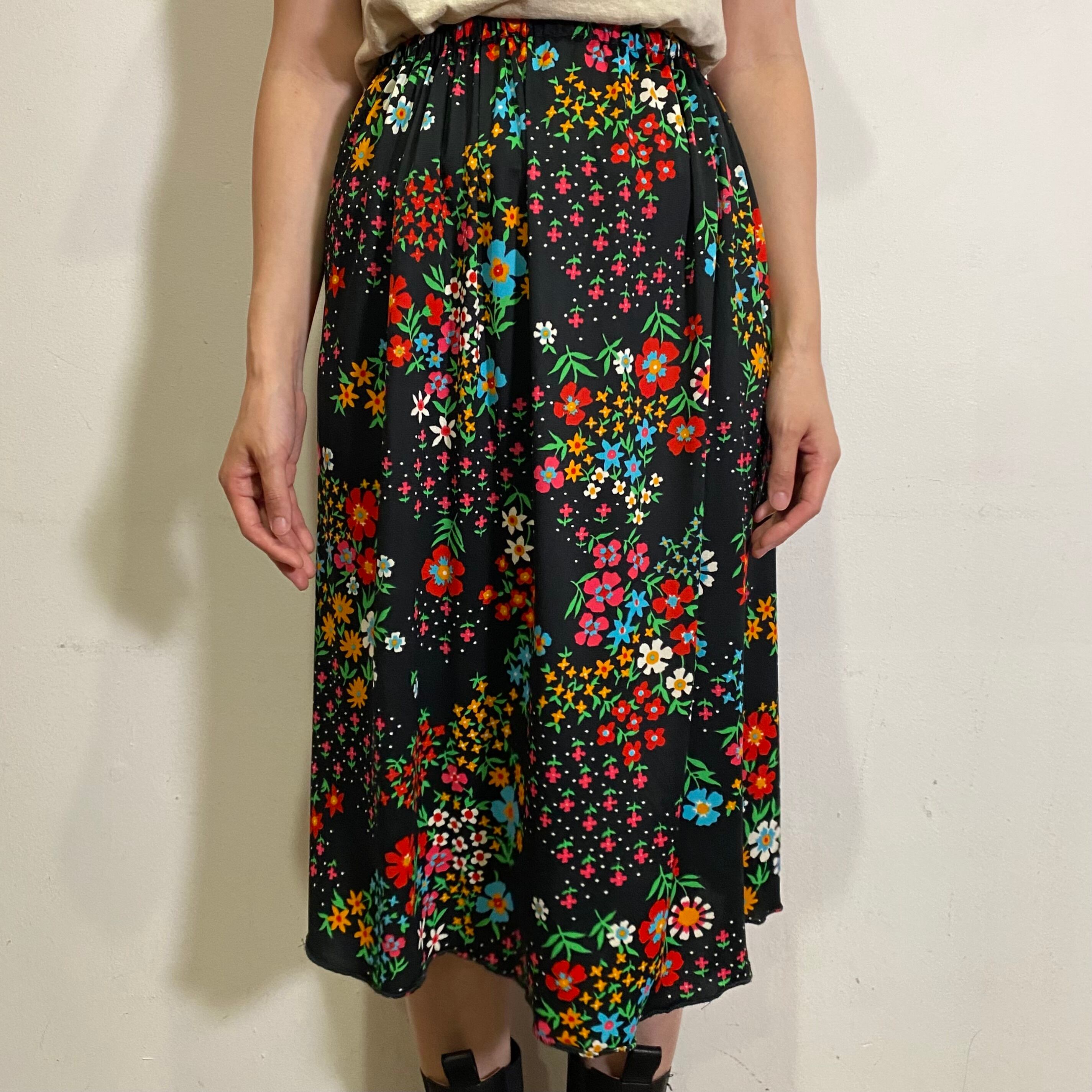 ブラックベースにカラフルな花柄が映える、70年代のスカートです。
