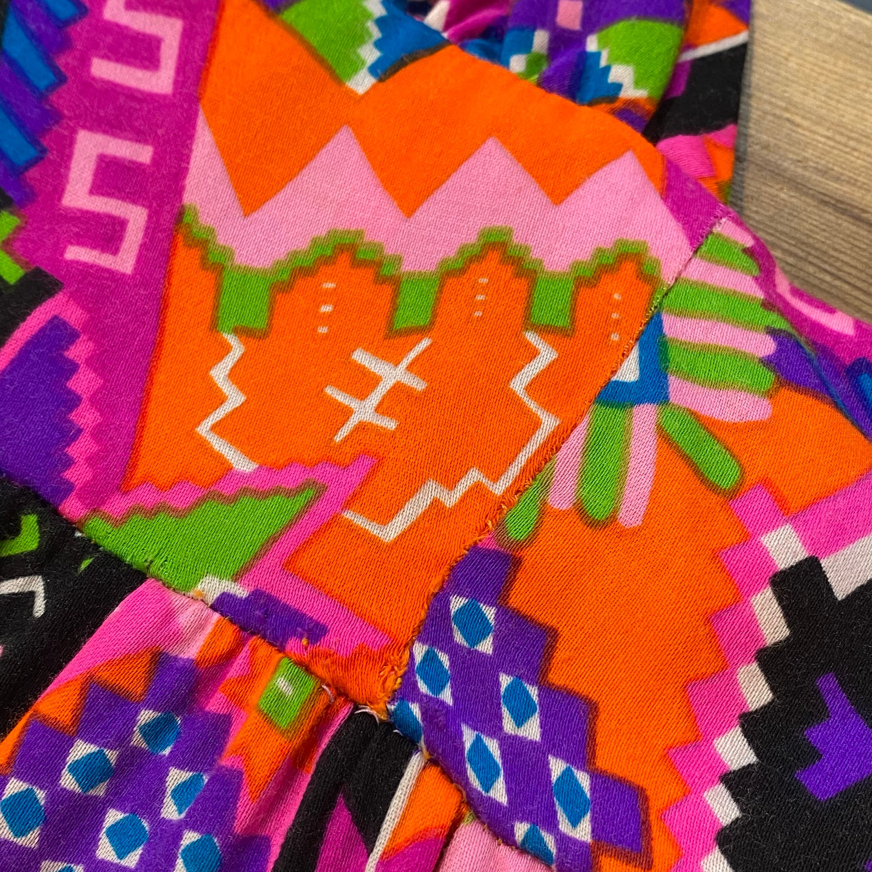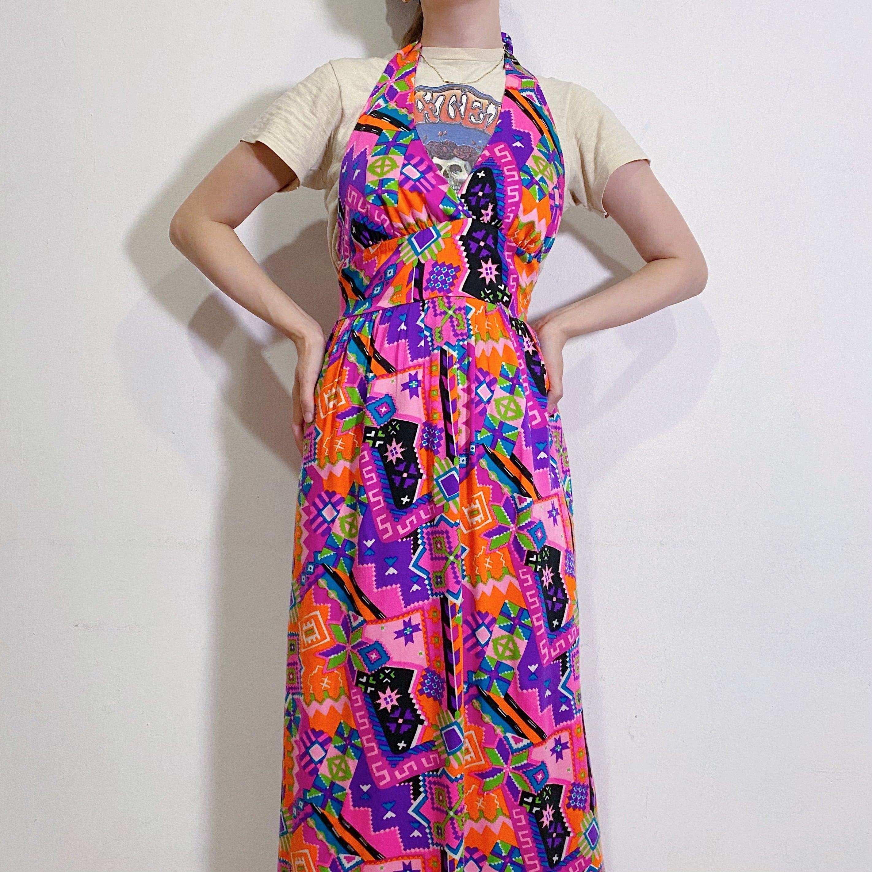 ピンクやオレンジなどのカラフルでサイケなテキスタイルが可愛い、70年代のホルターネックワンピースです。