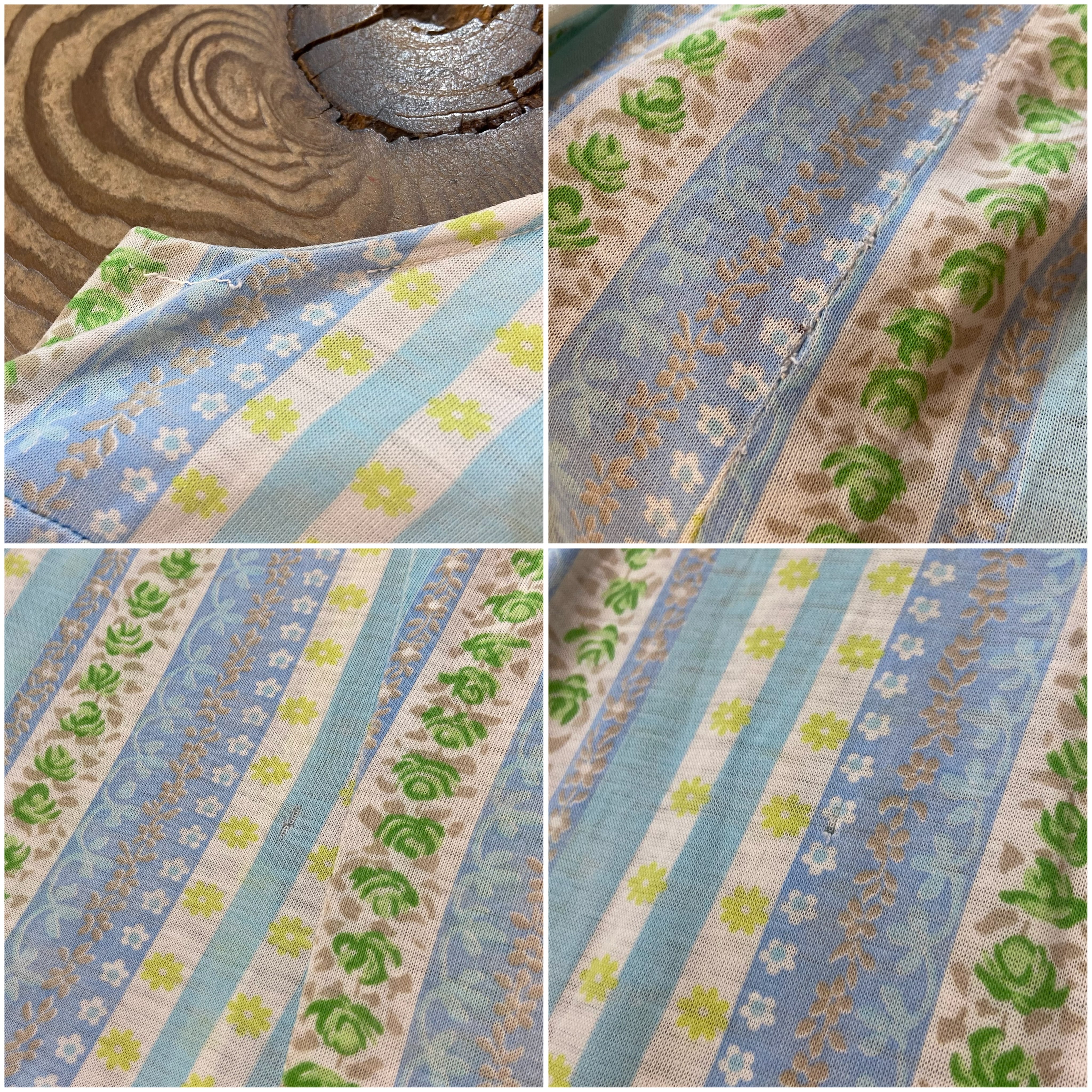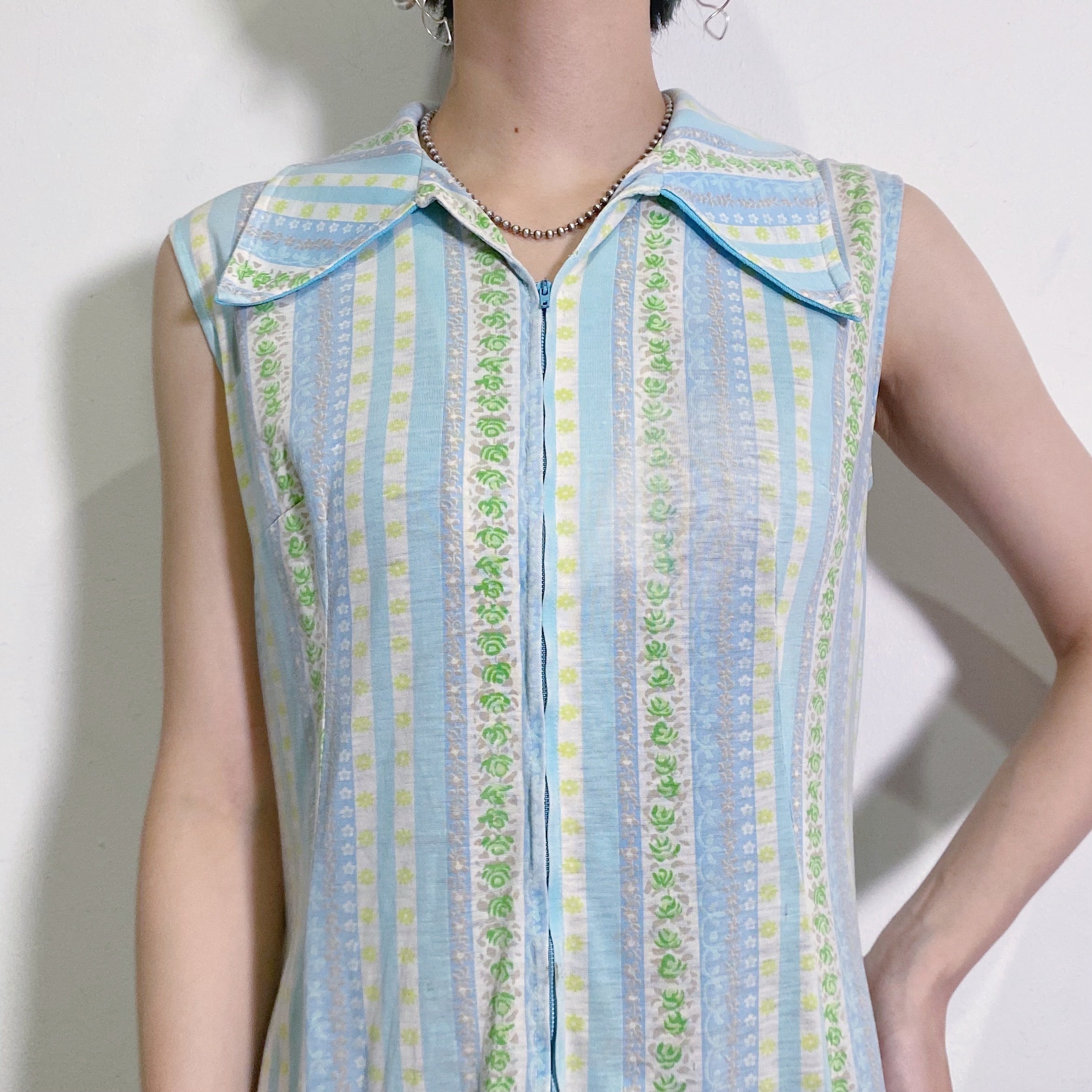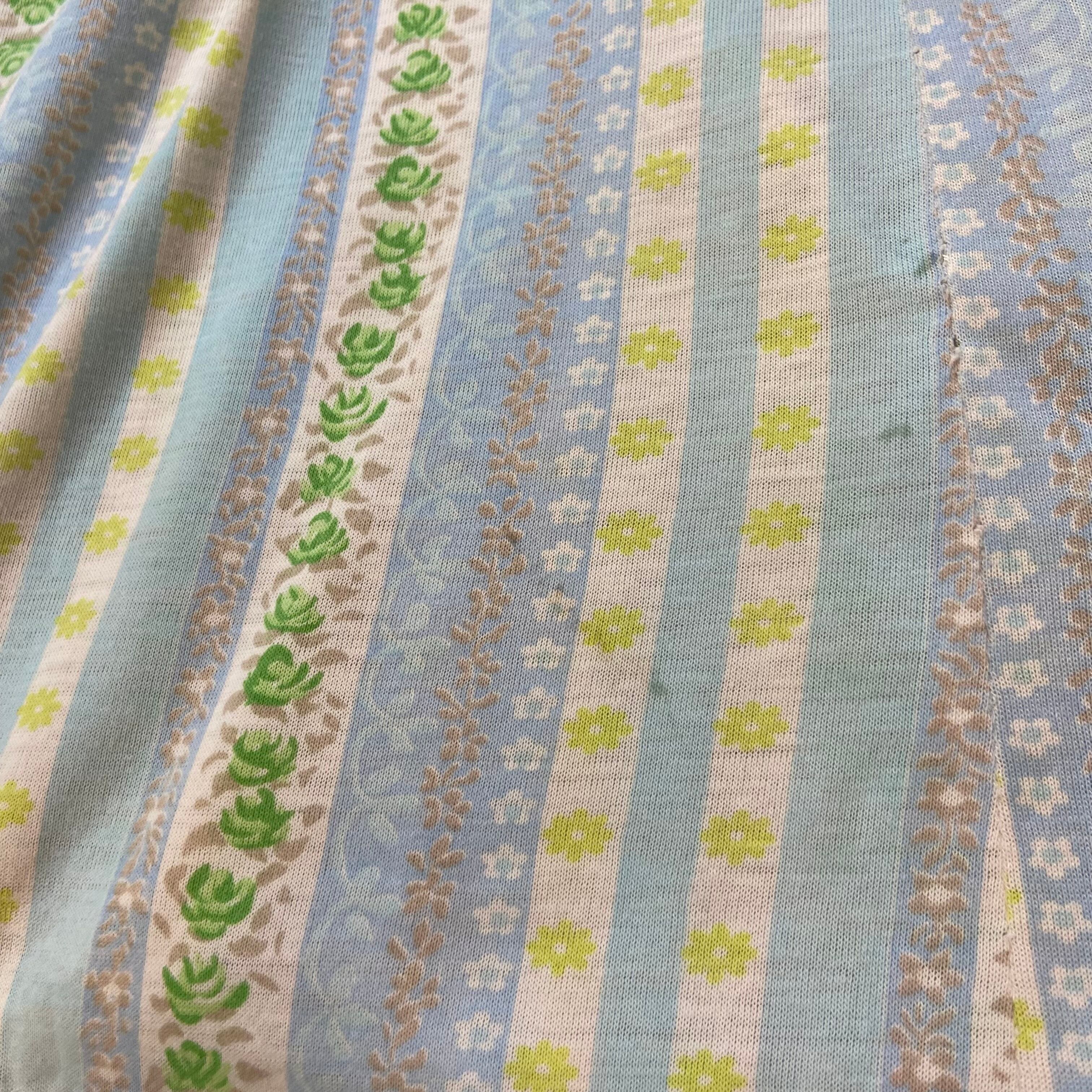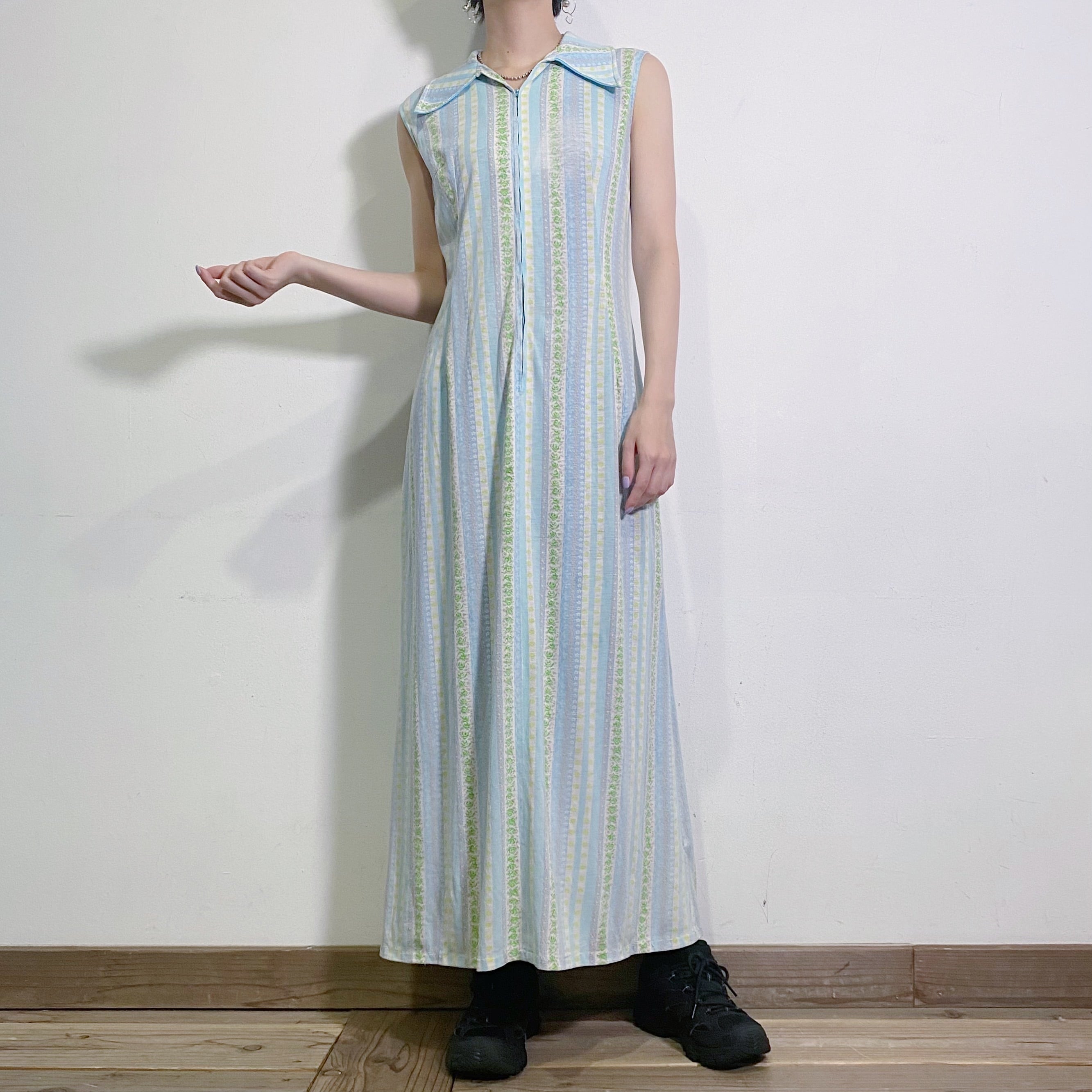 色んなお花のチロルテープを並べたかのようなデザインのストライプ柄が可愛い、70年代のロングワンピースです。