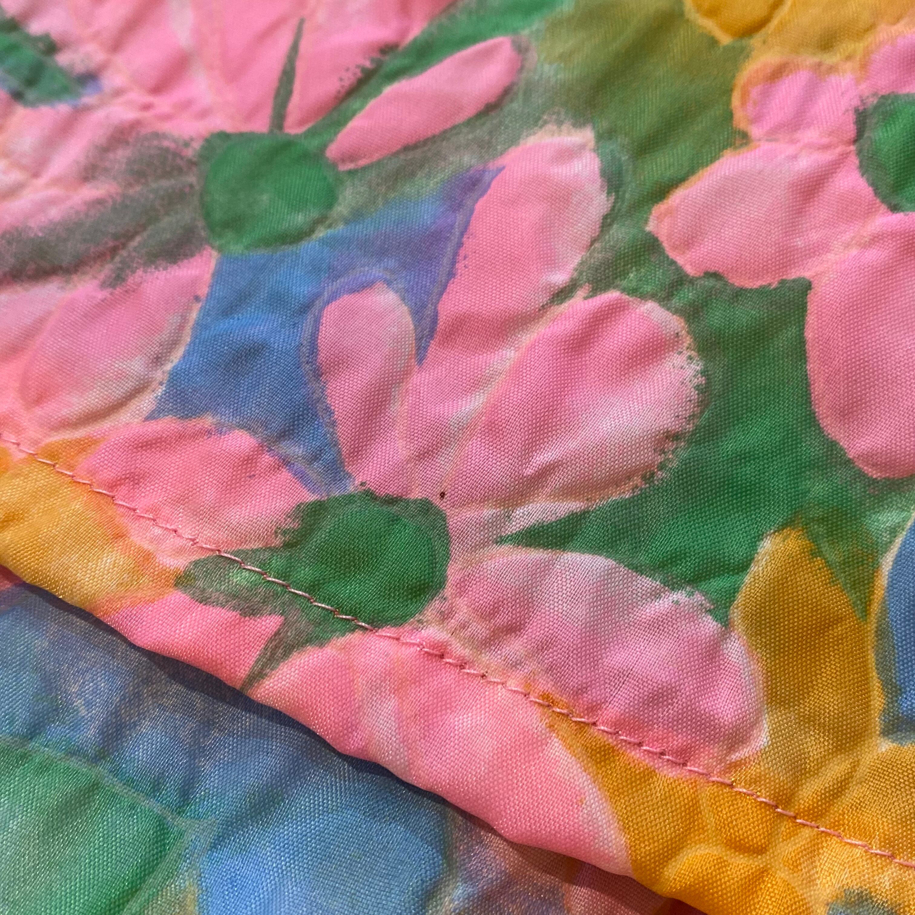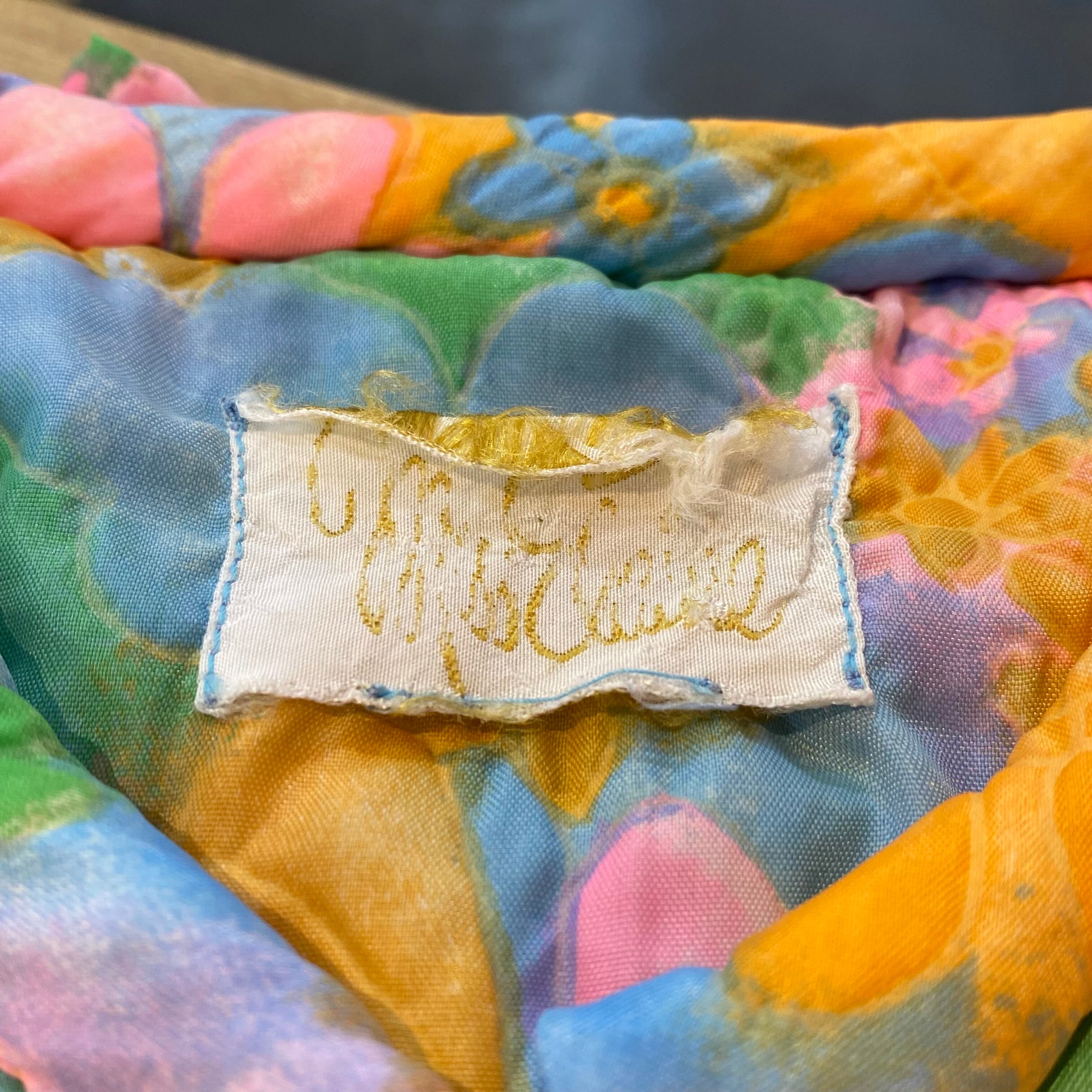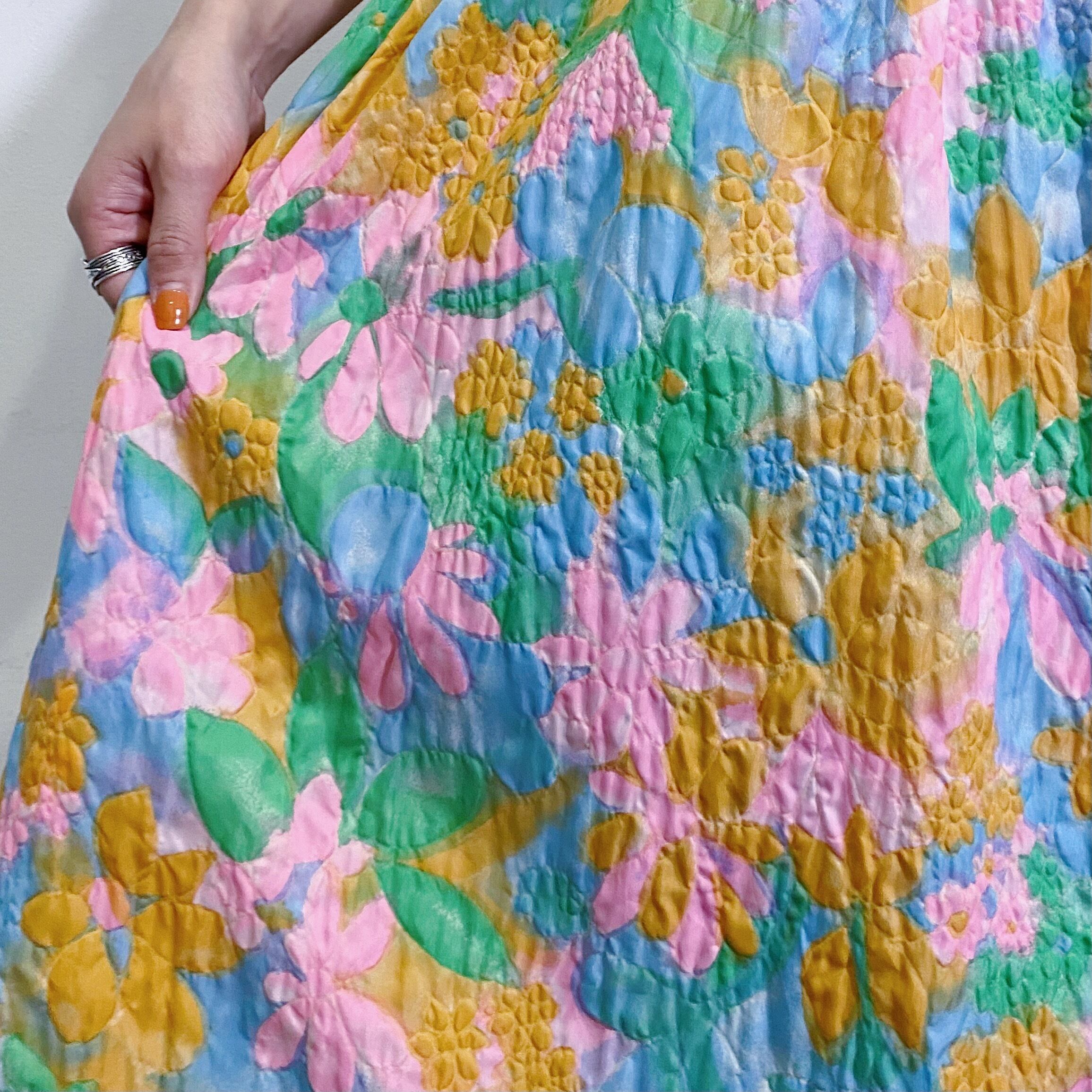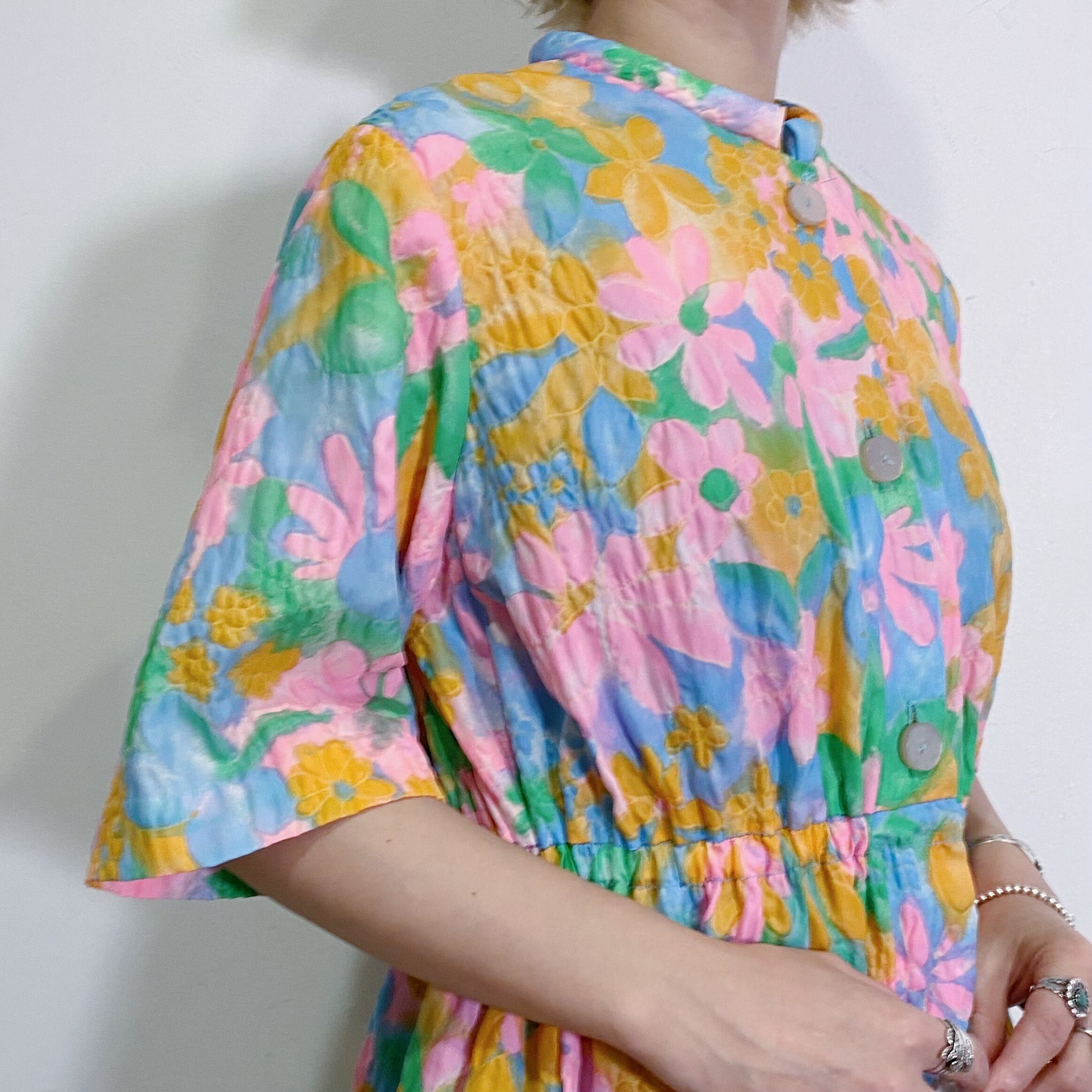 パステルカラーの色鮮やかな花柄がとても可愛い、70年代のワンピースです。