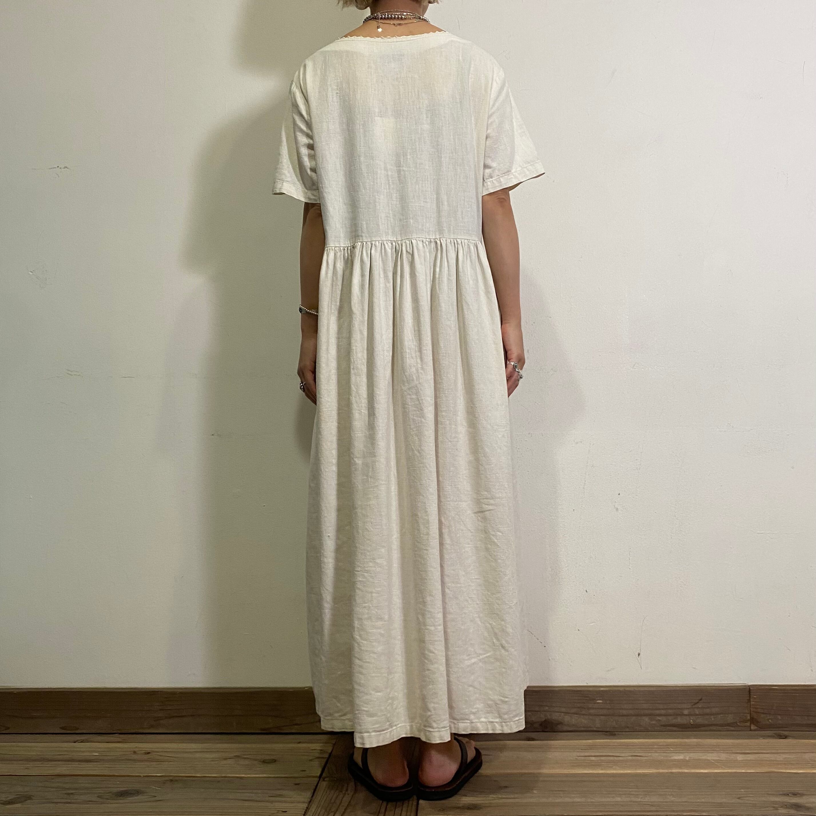 ホワイトカラーで着こなしやすそうな、上質なリネンコットン地のワンピースです。