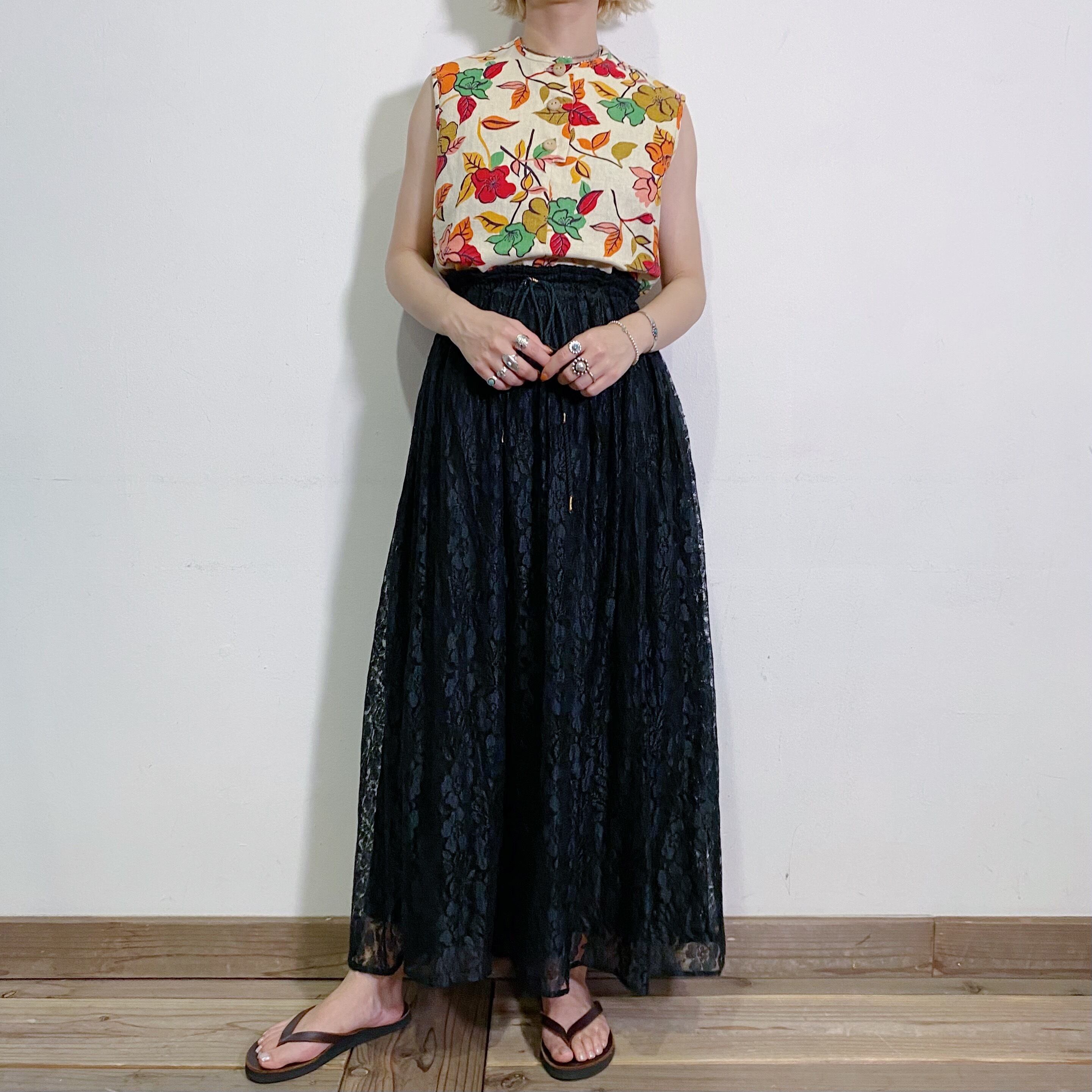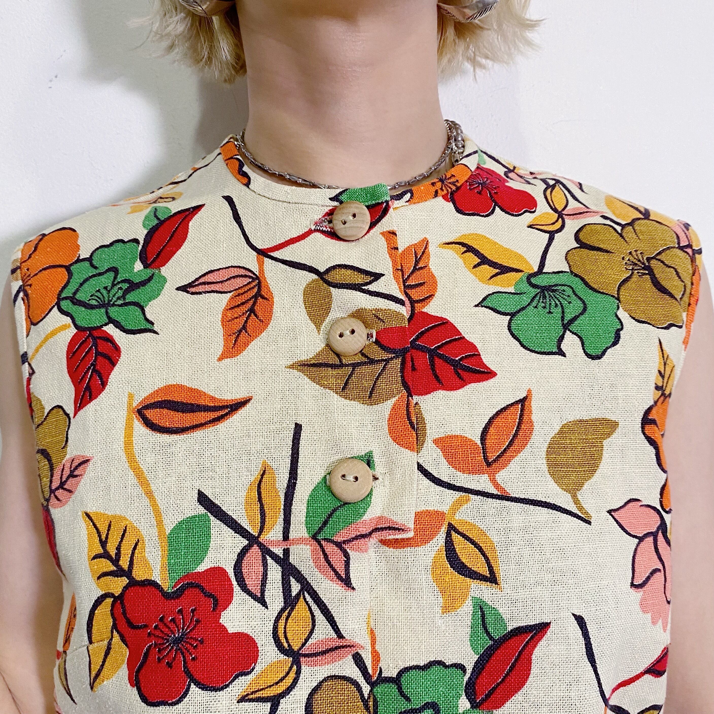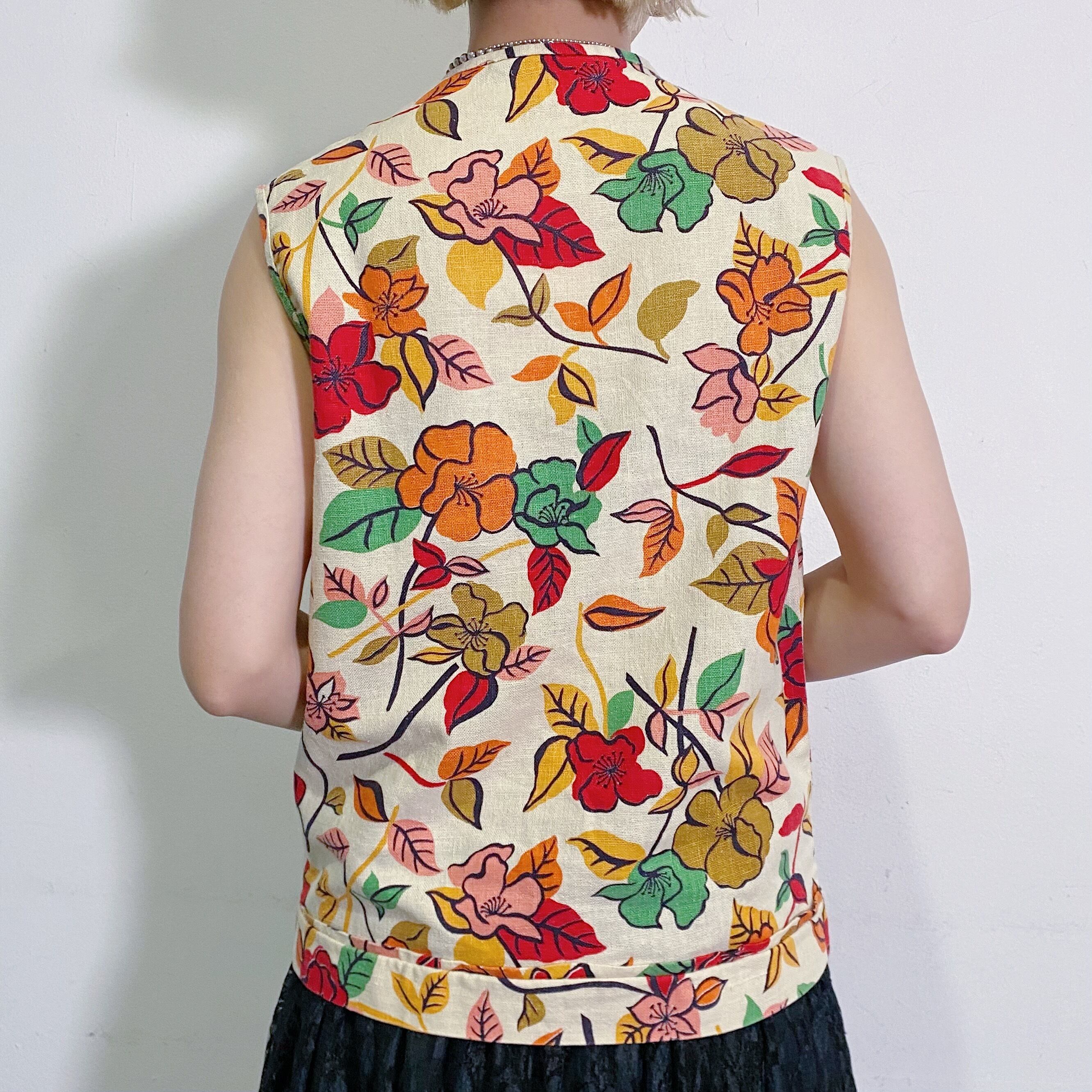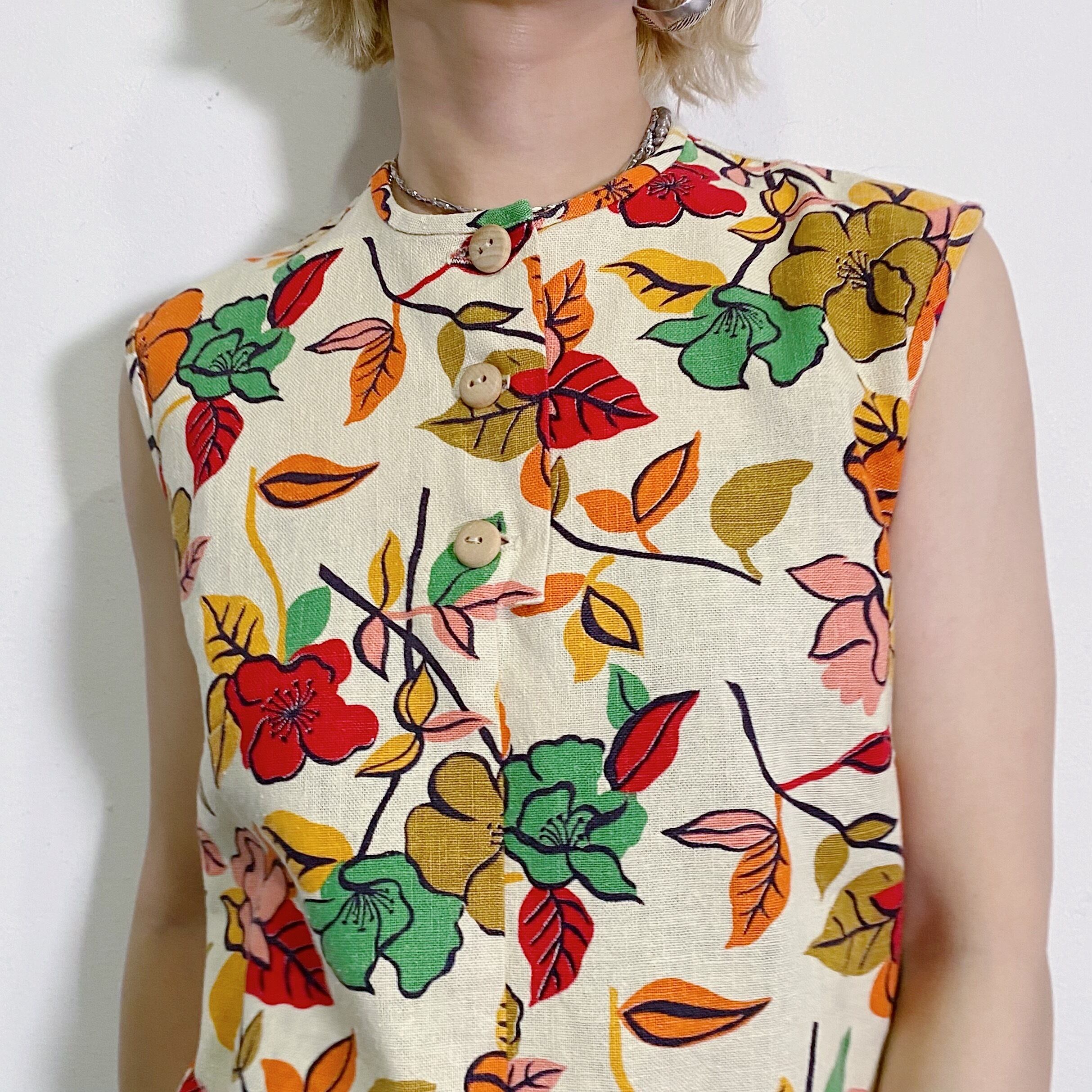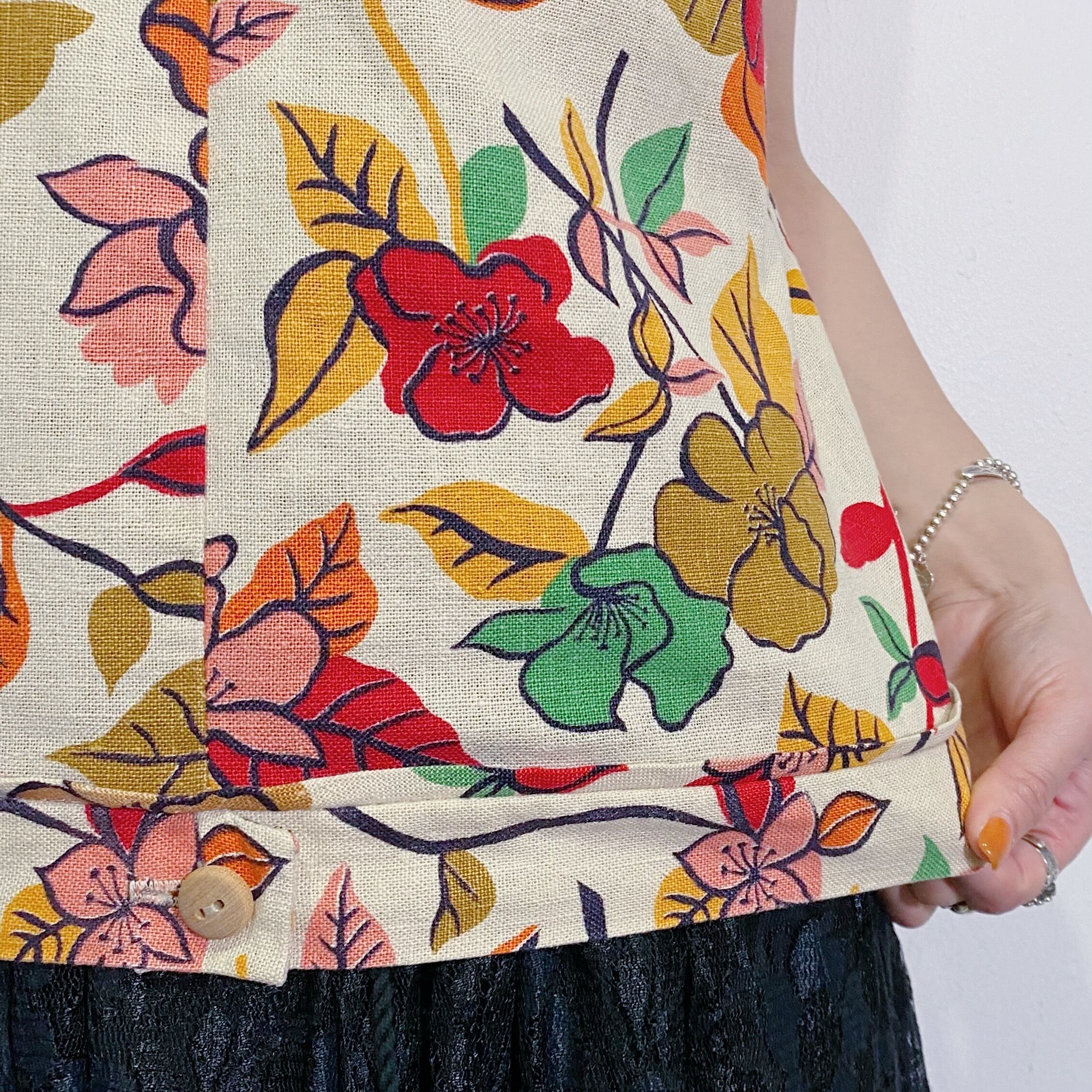 カラフルなボタニカル柄が可愛い、ノースリーブトップスです。