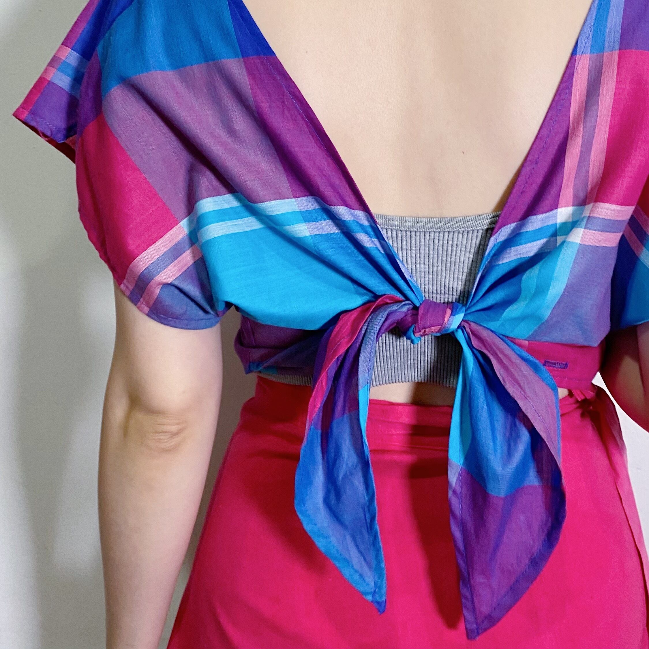 ブルーやピンクのチェックが可愛い、80年代の半袖トップスです。