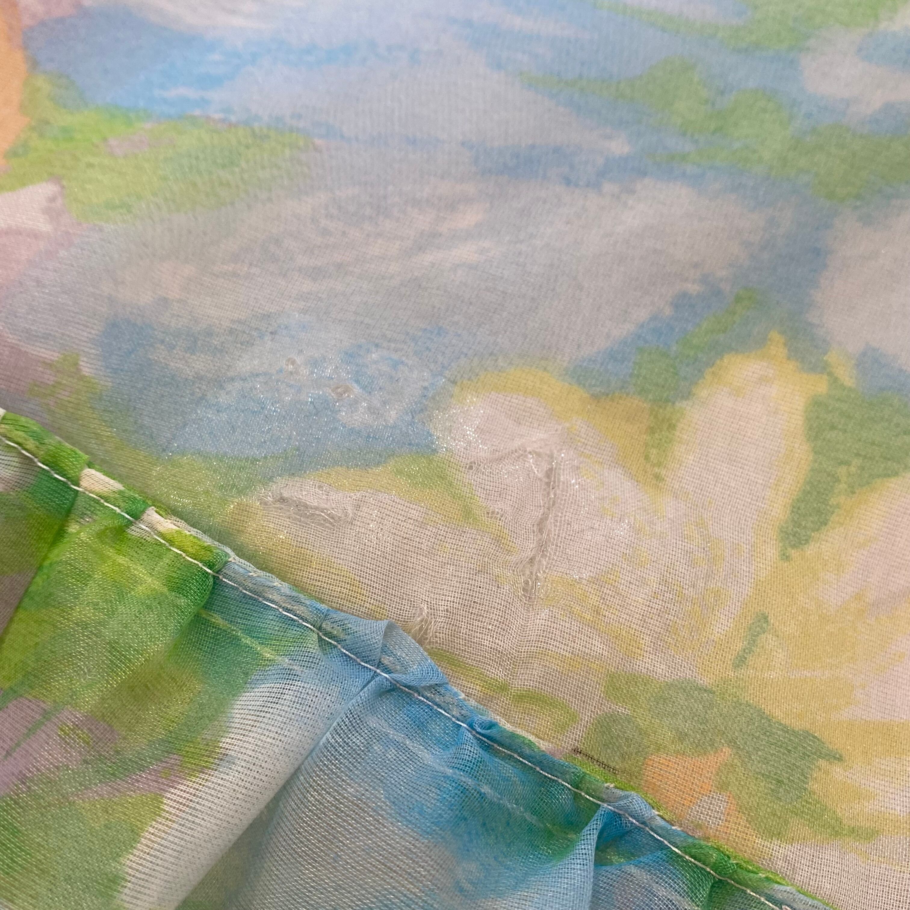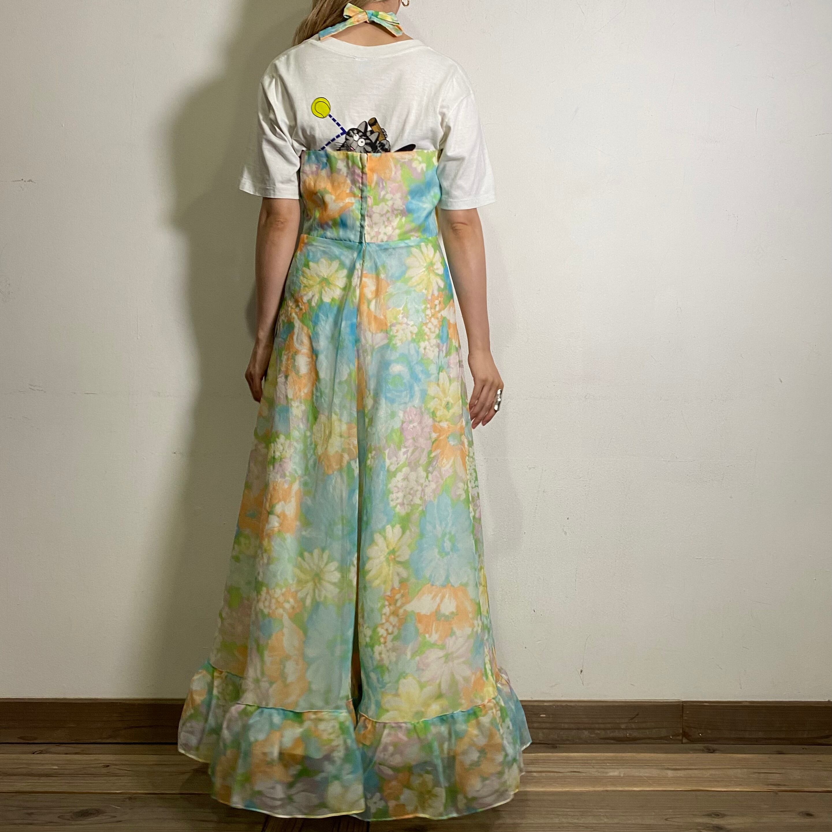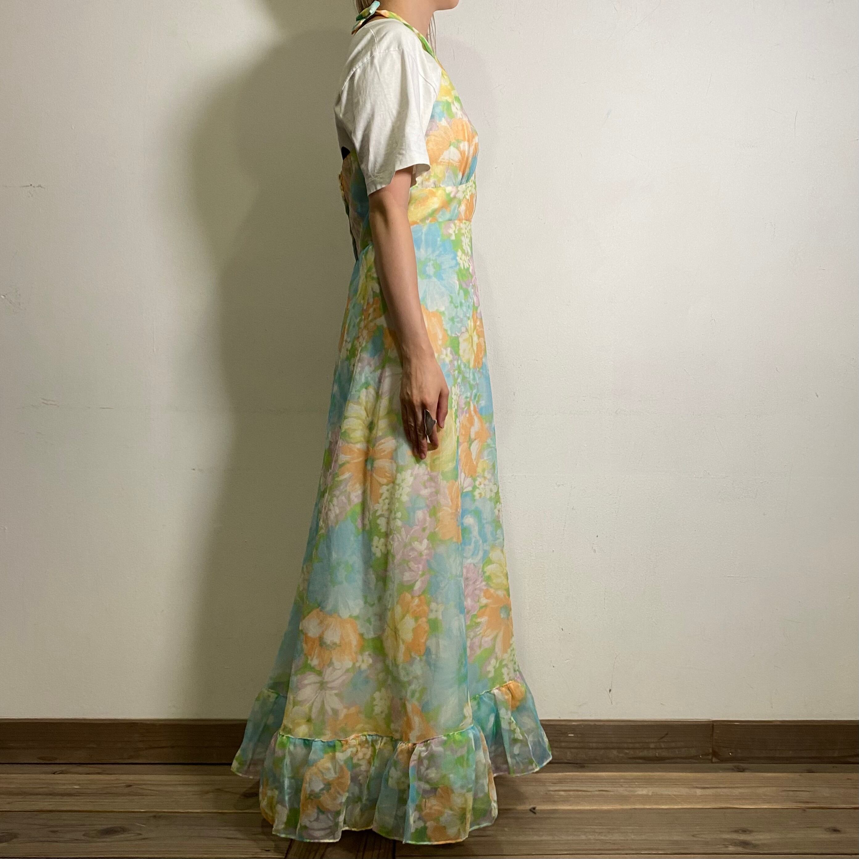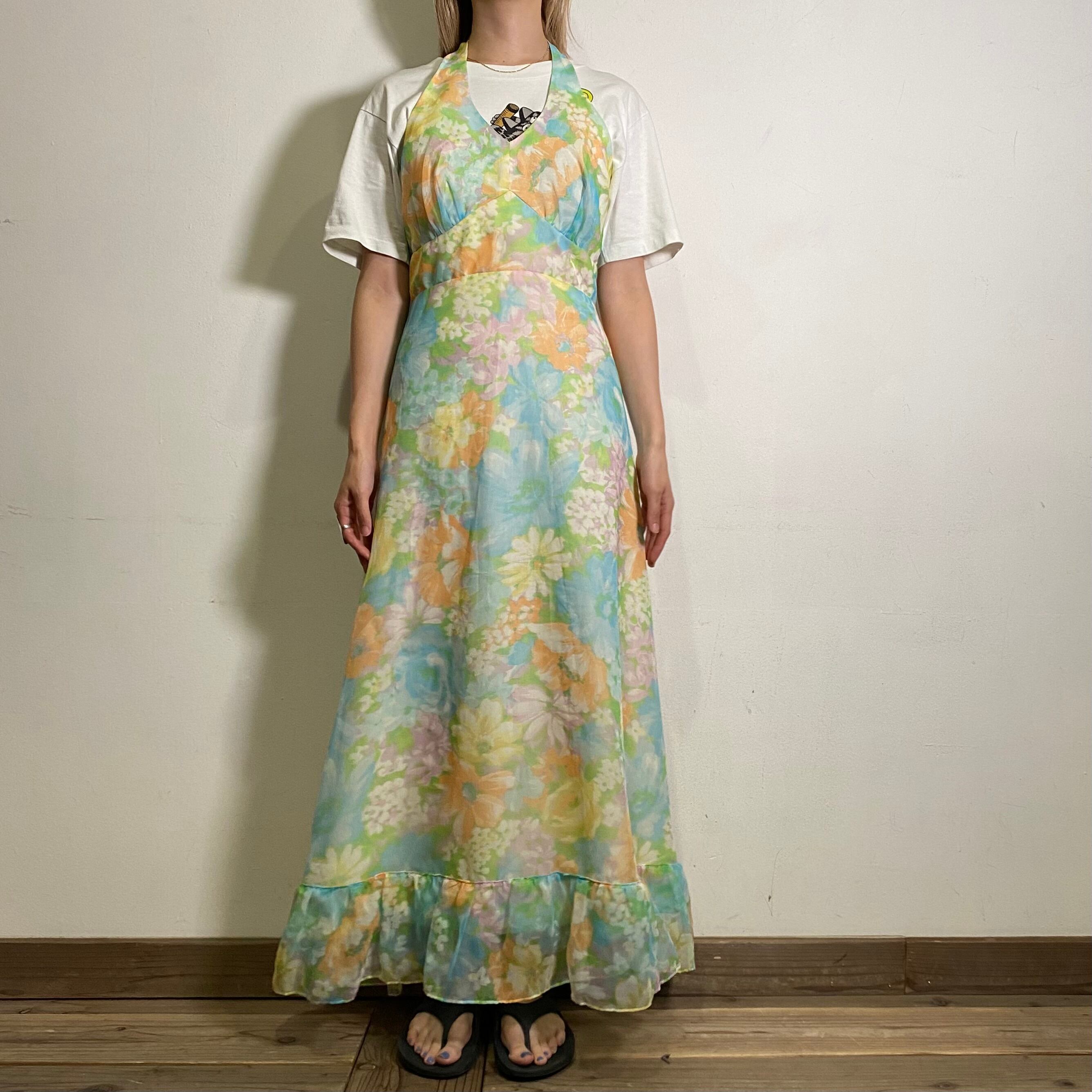 淡いサックスブルーやグリーンの色合いが可愛い、70年代のホルターネックワンピースです。