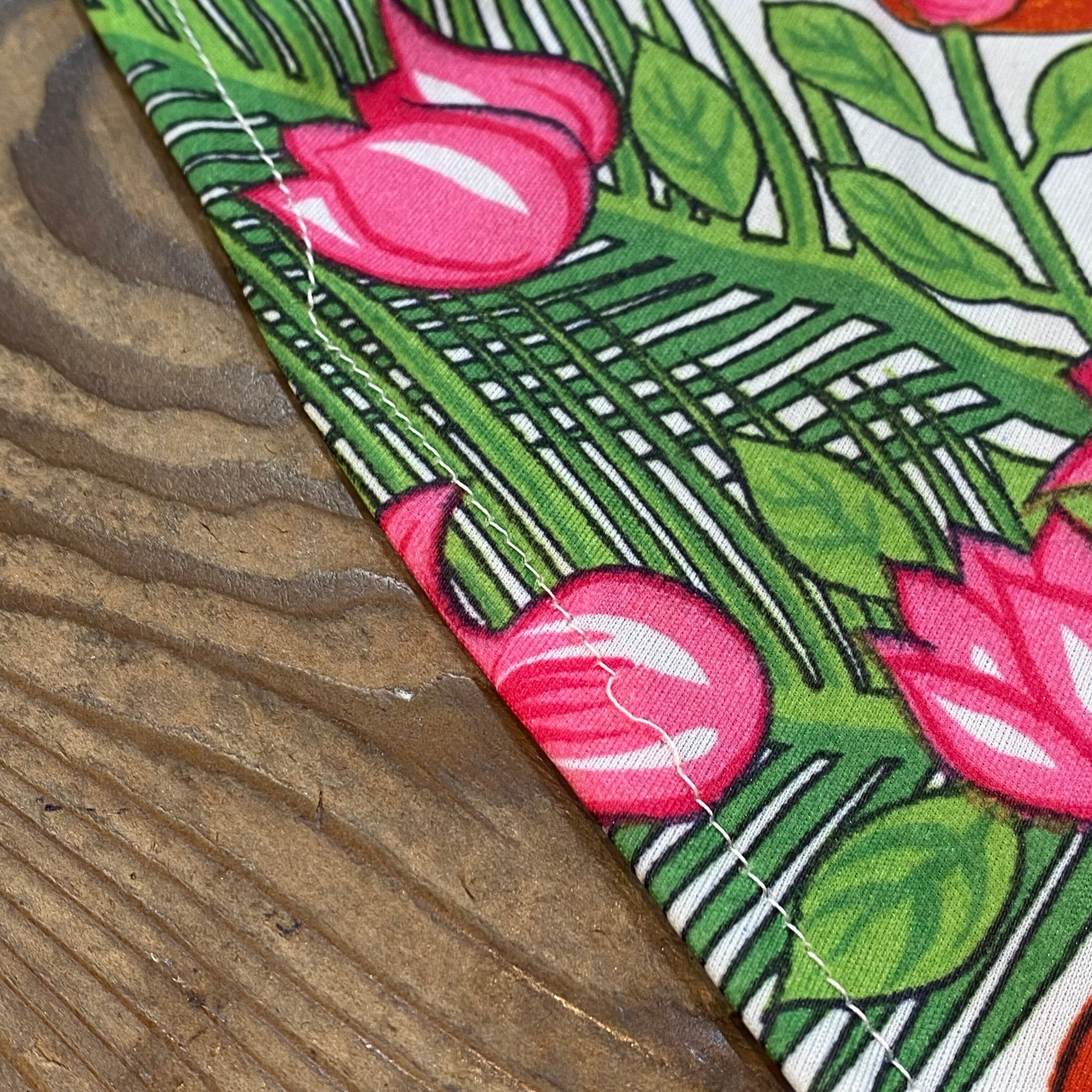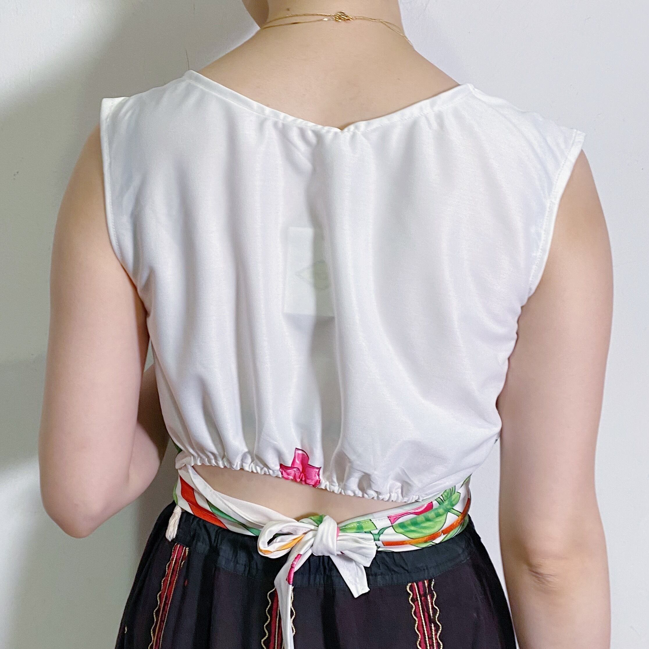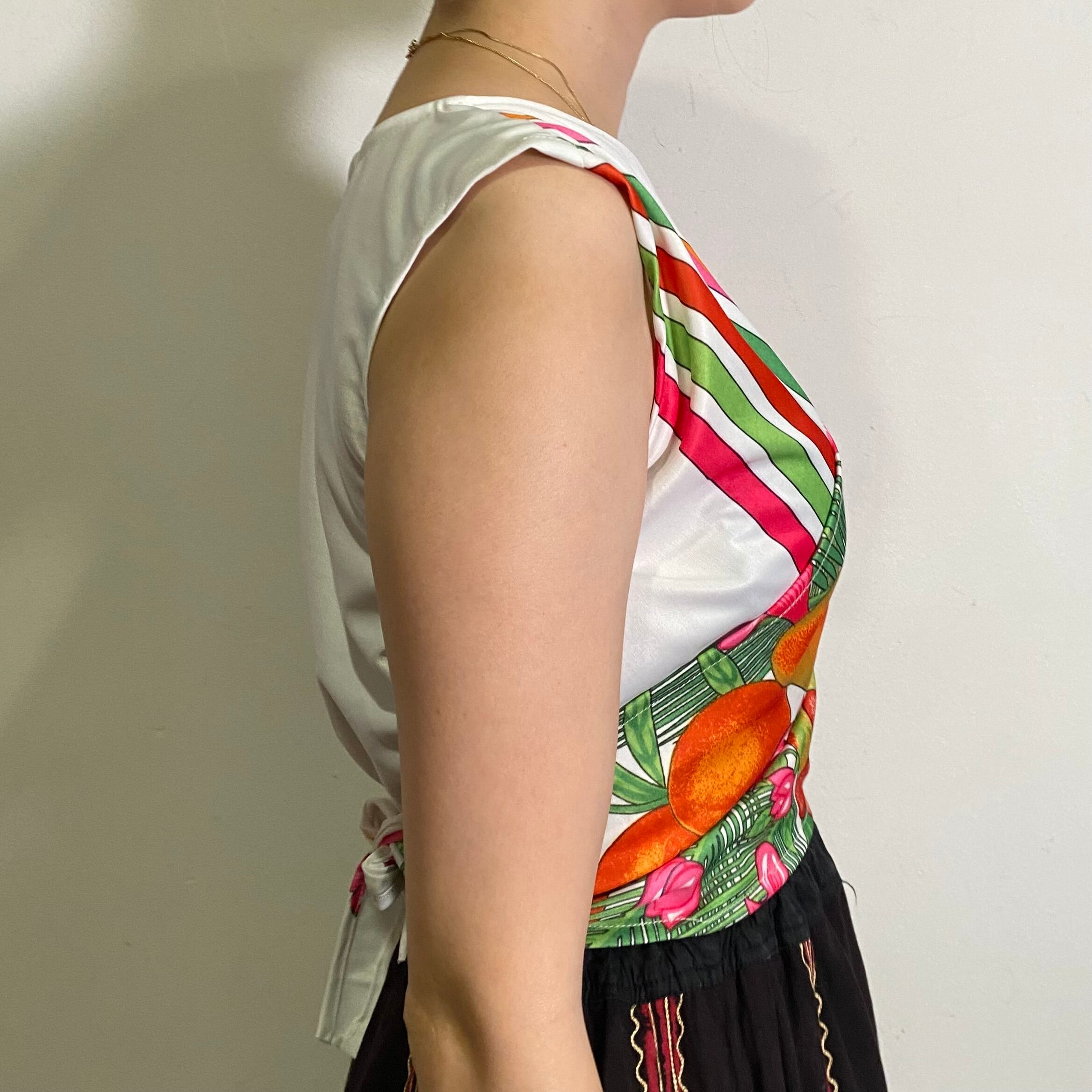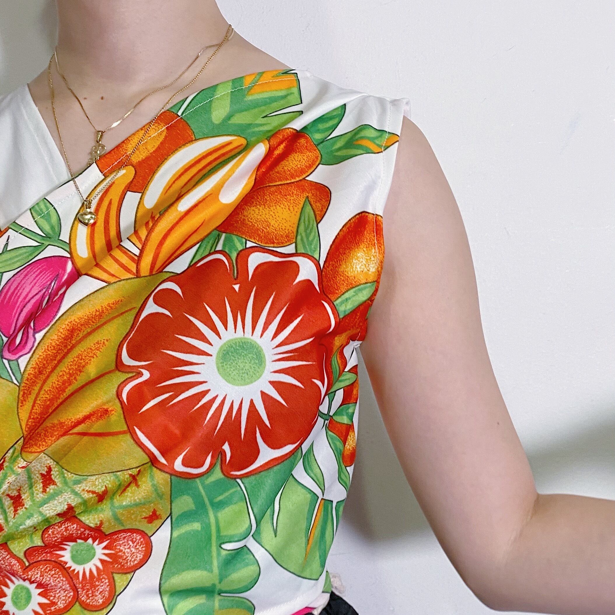 お花やフルーツなどのトロピカルなテキスタイルが可愛い、70年代のトップスです。